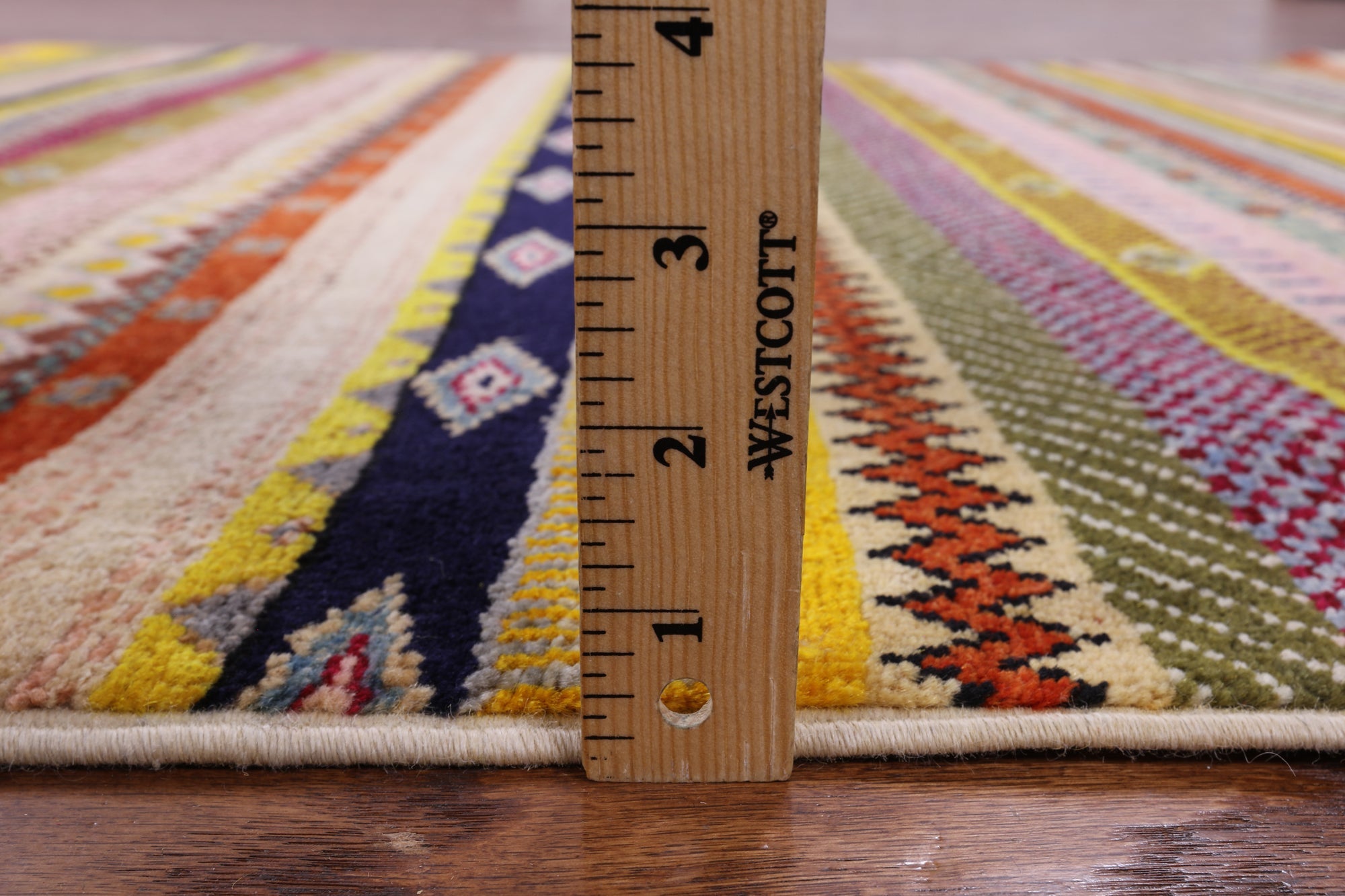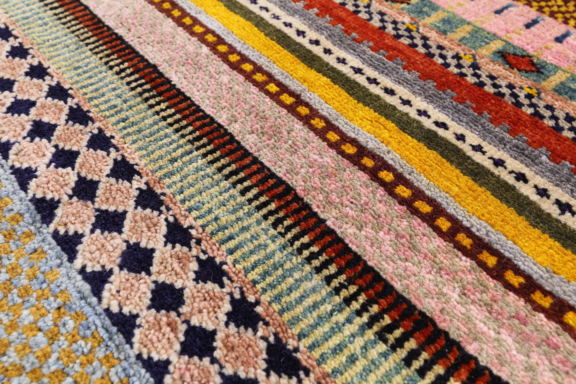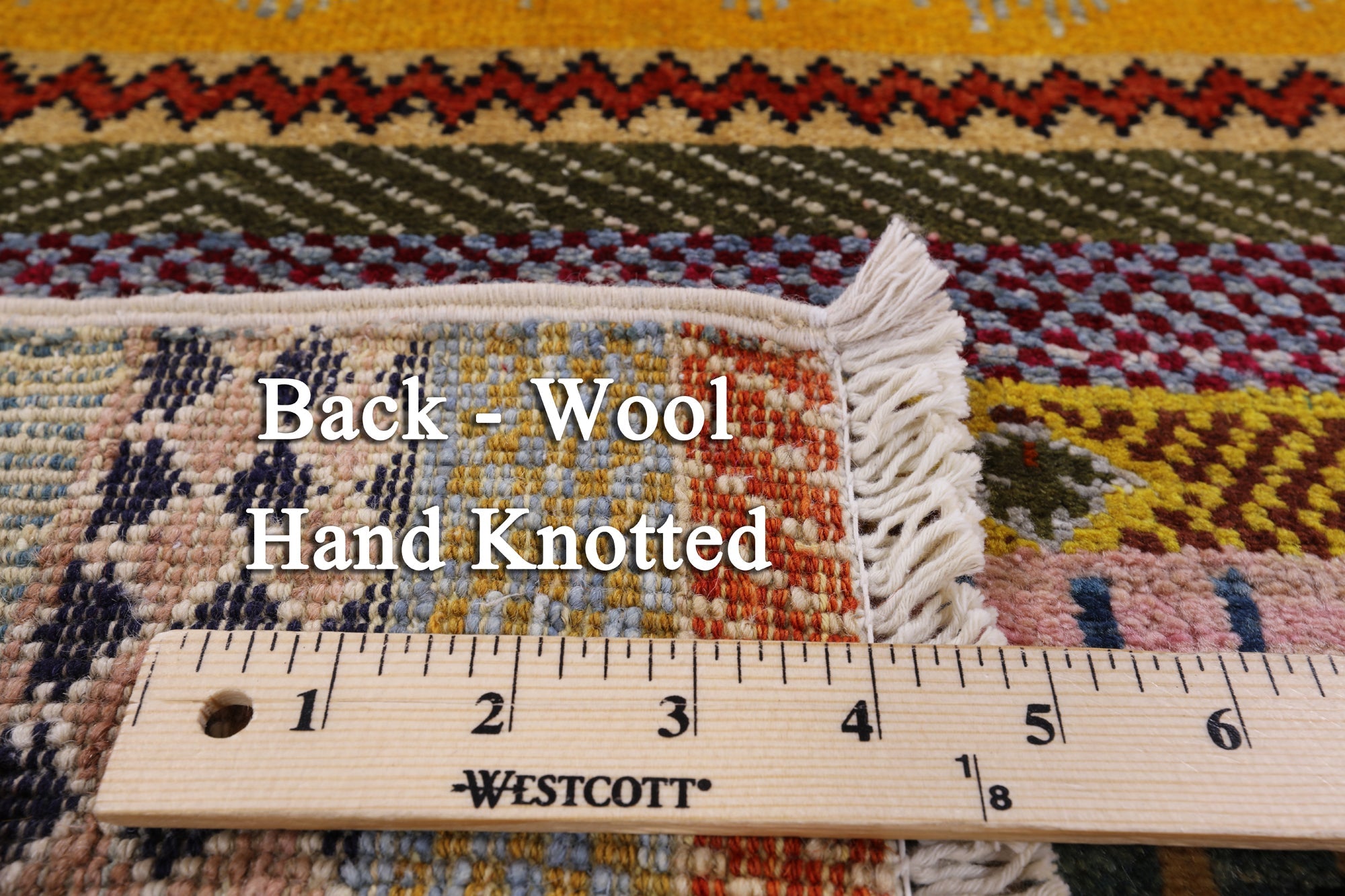 Gabbeh rugs are hand knotted to reflect tribal and other patterns such as solids, and nomadic designs. The simplistic "child-like" bold designs of Gabbeh rugs is what makes them perfectly suitable for any decor. Gabbeh rugs are made from high-quality wool and have a high density of knots. Gabbeh rugs are hand-knotted and eco-friendly, because only natural dyes are used in their production.
