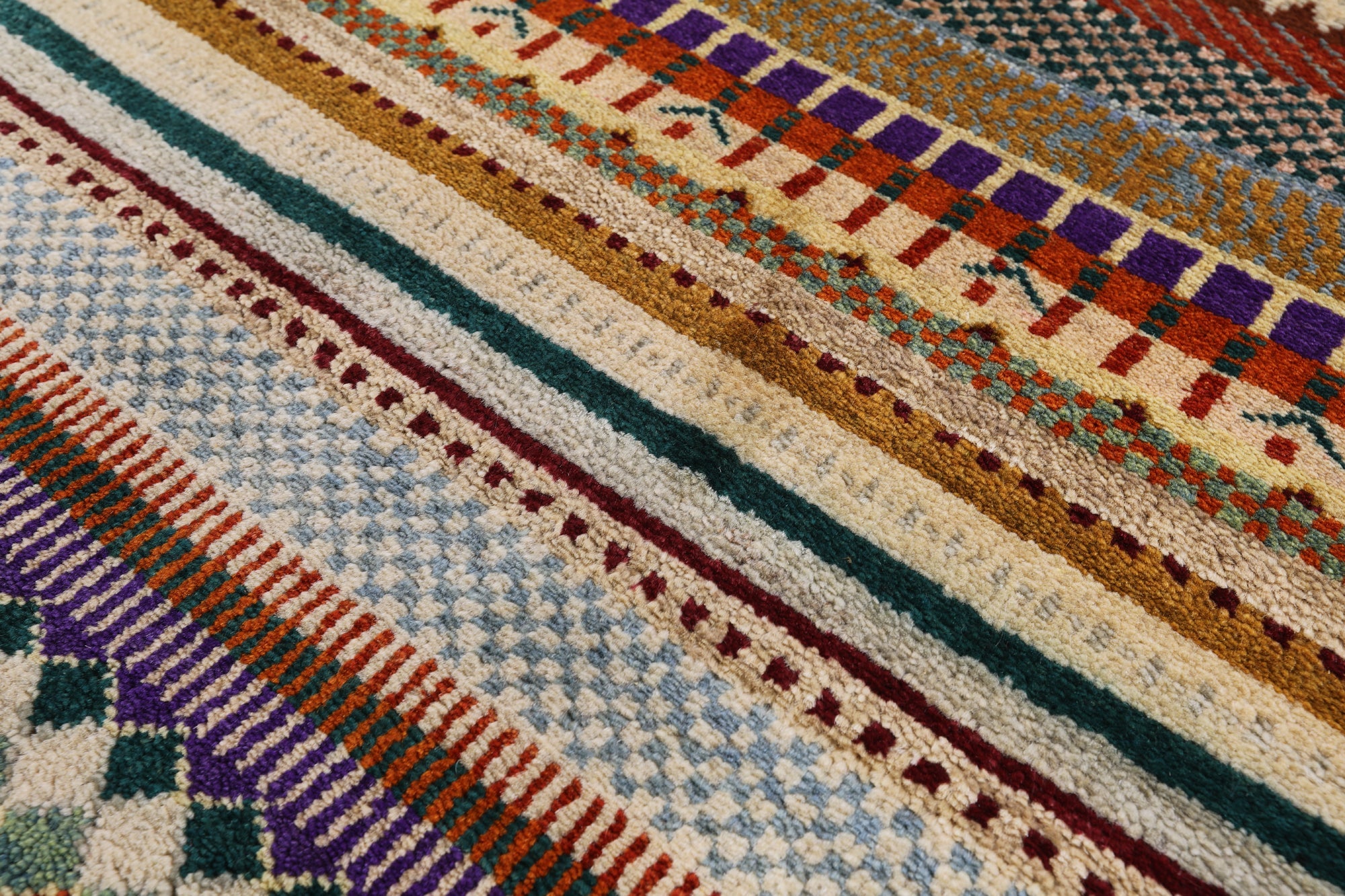 Gabbeh rugs are hand knotted to reflect tribal and other patterns such as solids, and nomadic designs. The simplistic "child-like" bold designs of Gabbeh rugs is what makes them perfectly suitable for any decor. Gabbeh rugs are made from high-quality wool and have a high density of knots. Gabbeh rugs are hand-knotted and eco-friendly, because only natural dyes are used in their production.