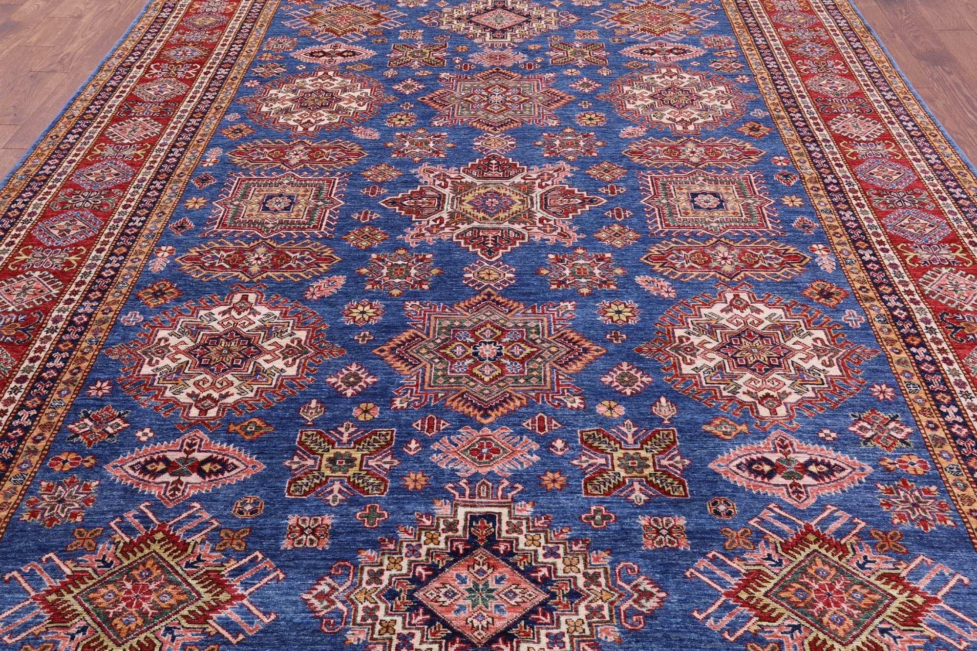 Super Kazak rugs were woven in the south of Caucasus and are very regional in their designs. Super Kazak rugs are very traditional in look and the patterns can vary from geometric shapes, tribal designs like people and animals, and symbolic medallions. They are beautifully intricate and heavy in design. These rugs come in varieties of rich, warm, jewel tones that can liven up any space.