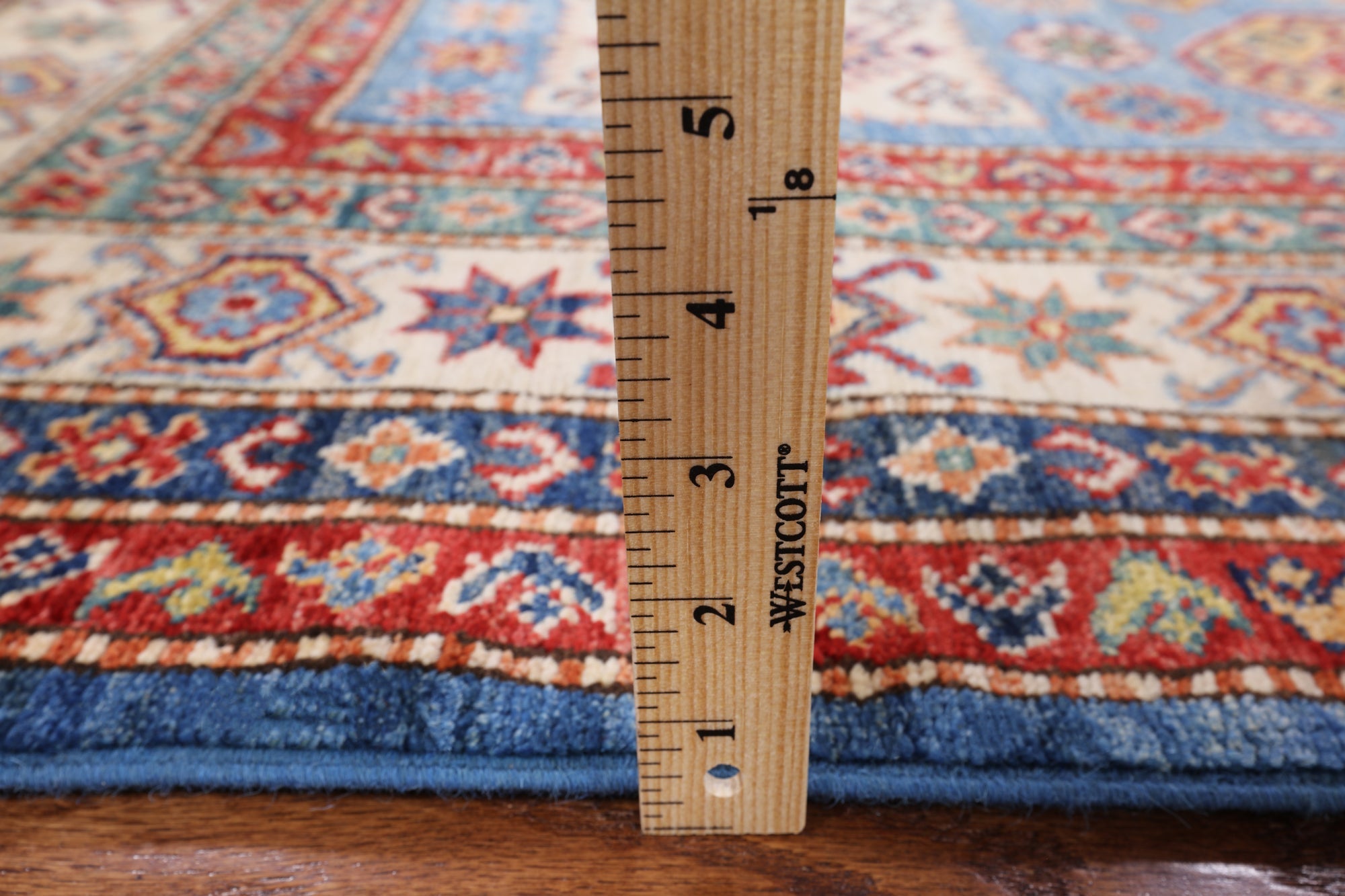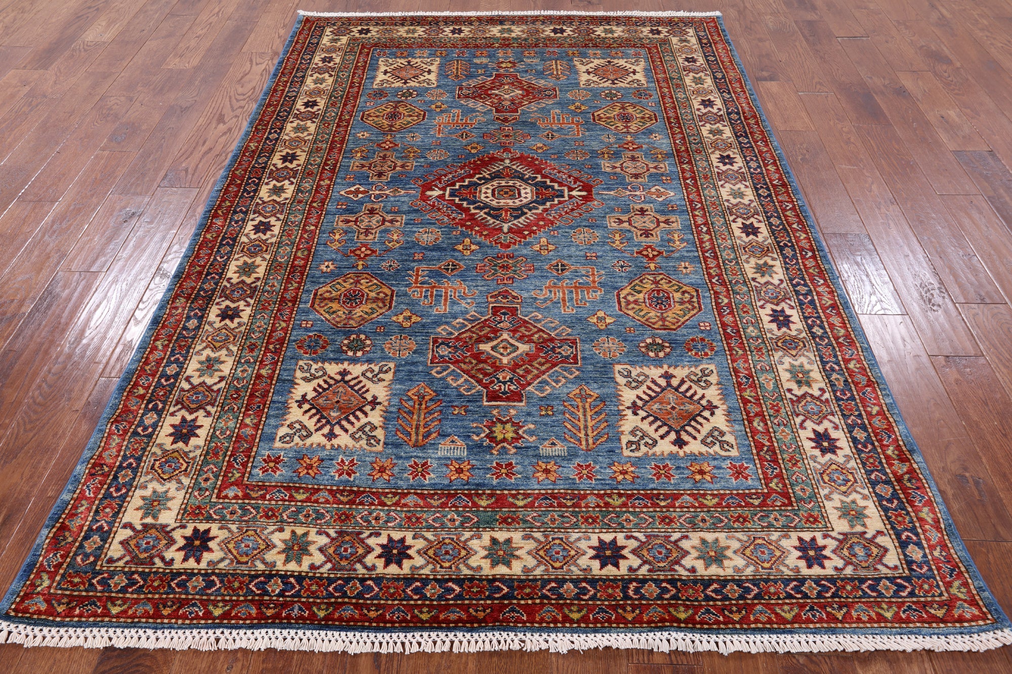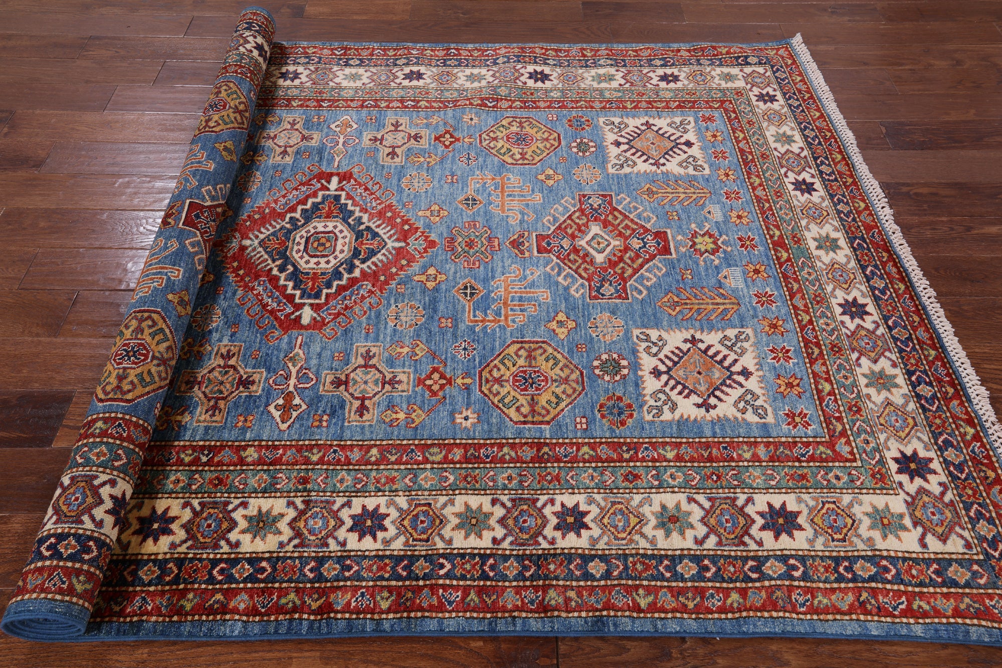 Blue 5' 8" X 8' 2" Super Kazak Handmade Wool Area Rug - P8926 is backordered and will ship as soon as it is back in stock.