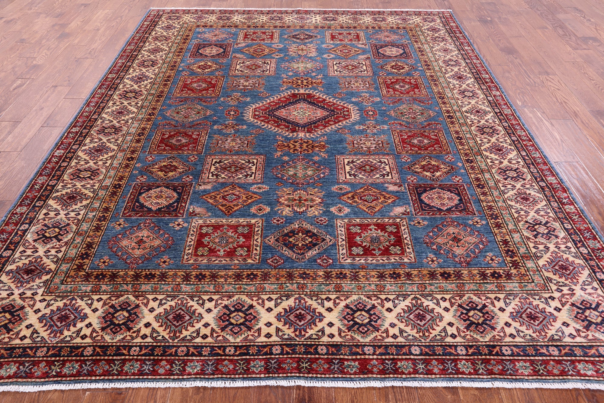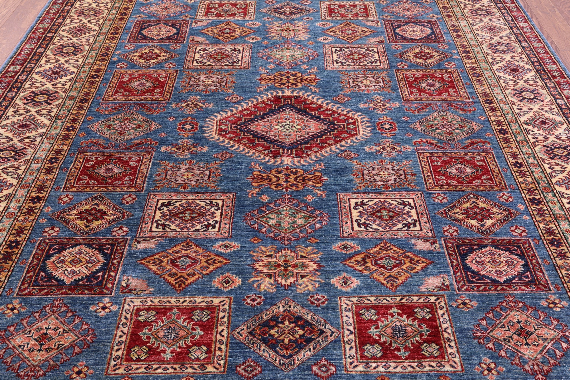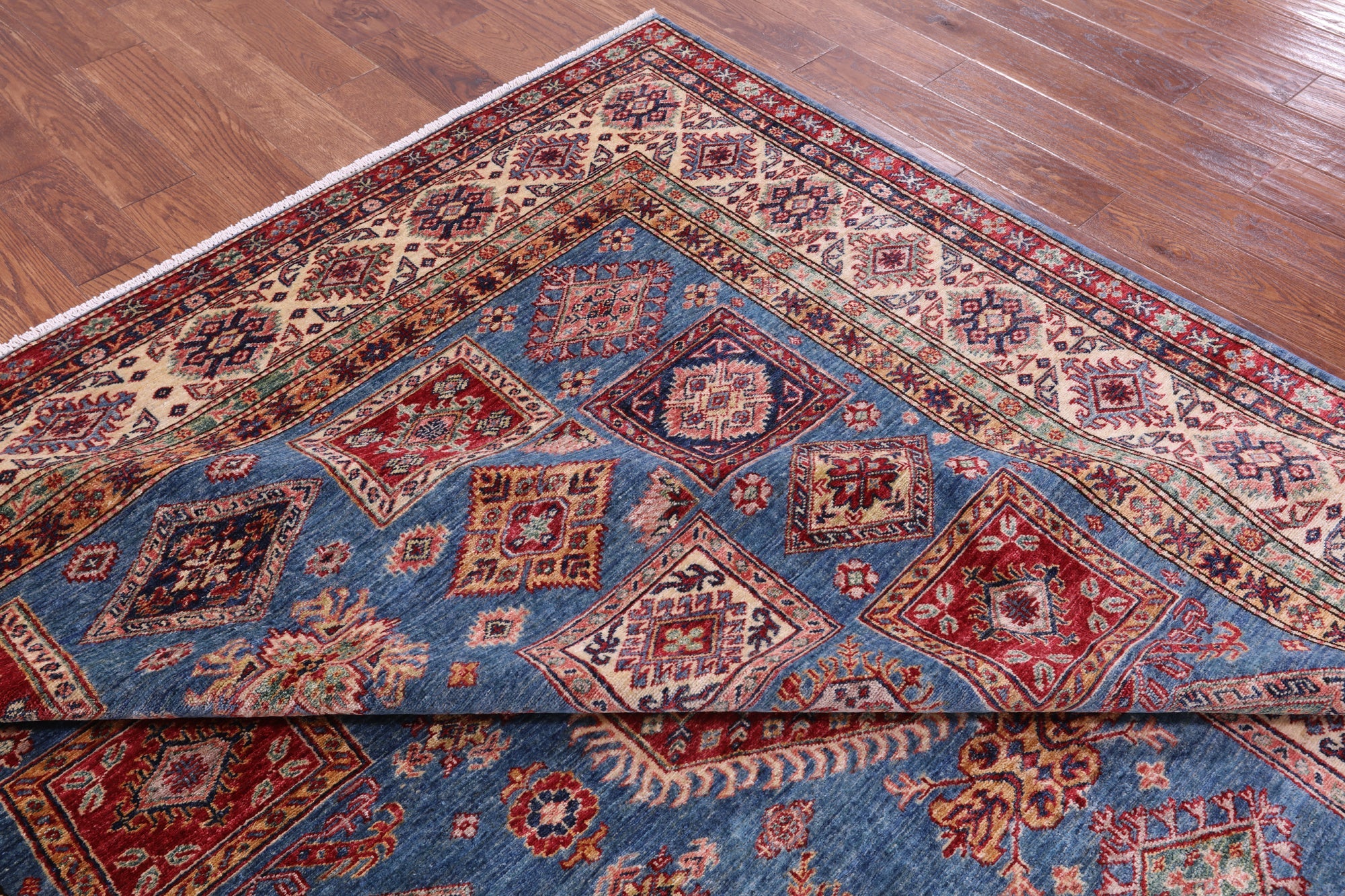 Super Kazak rugs were woven in the south of Caucasus and are very regional in their designs. Super Kazak rugs are very traditional in look and the patterns can vary from geometric shapes, tribal designs like people and animals, and symbolic medallions. They are beautifully intricate and heavy in design. These rugs come in varieties of rich, warm, jewel tones that can liven up any space.