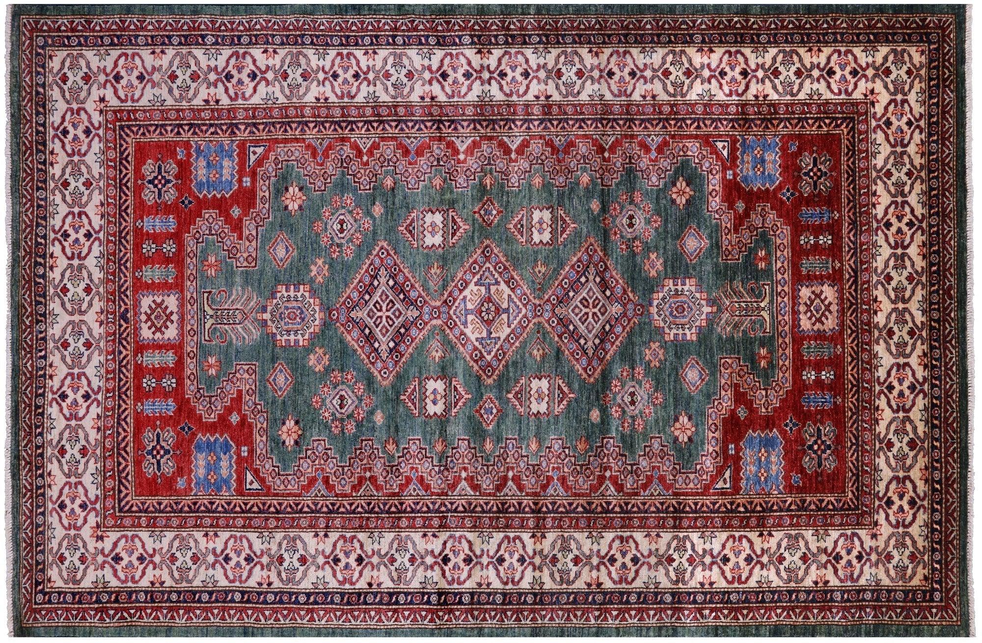 Green 5' 10" X 8' 9" Super Kazak Geometric Hand-Knotted Wool Rug - Q14539