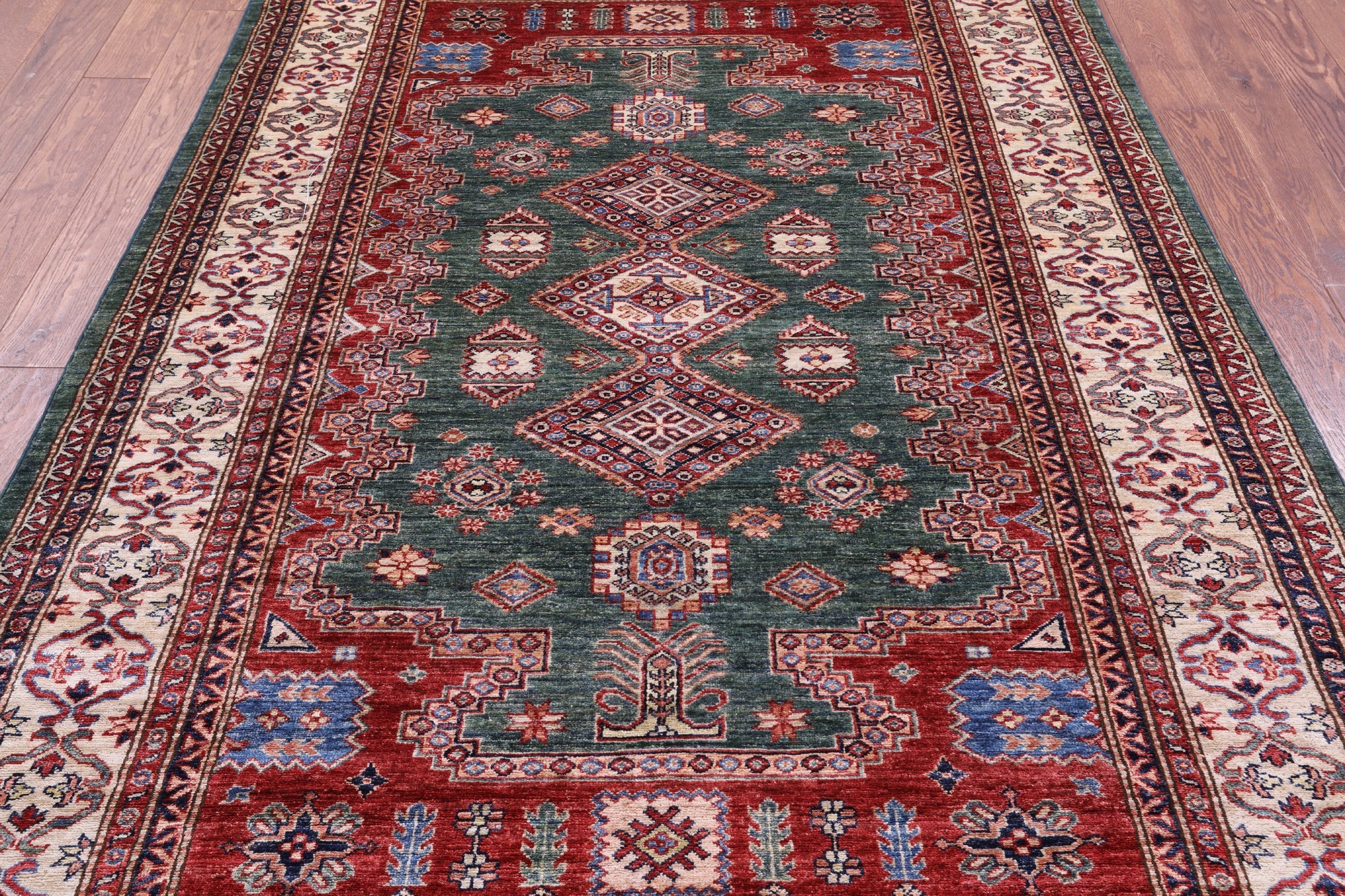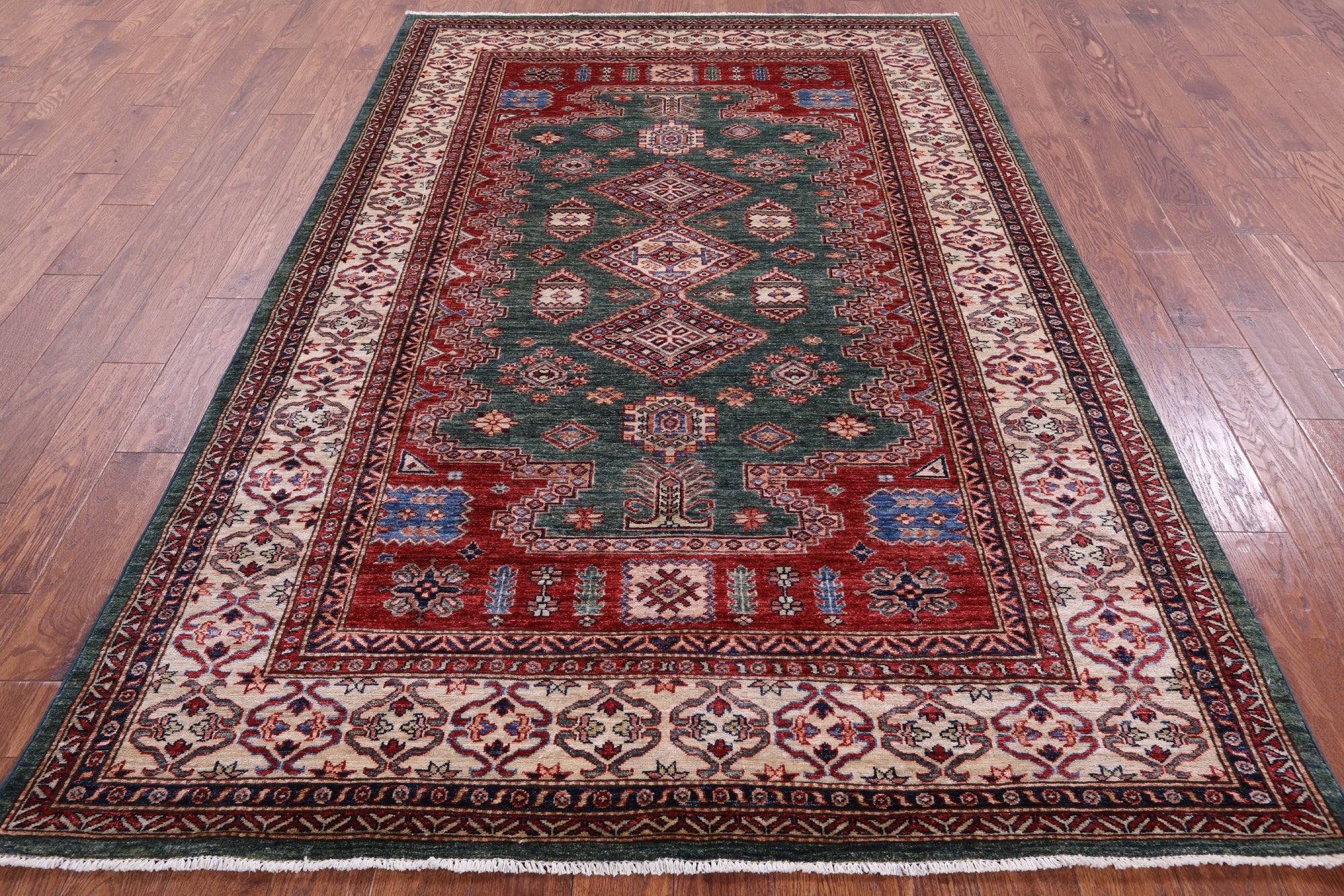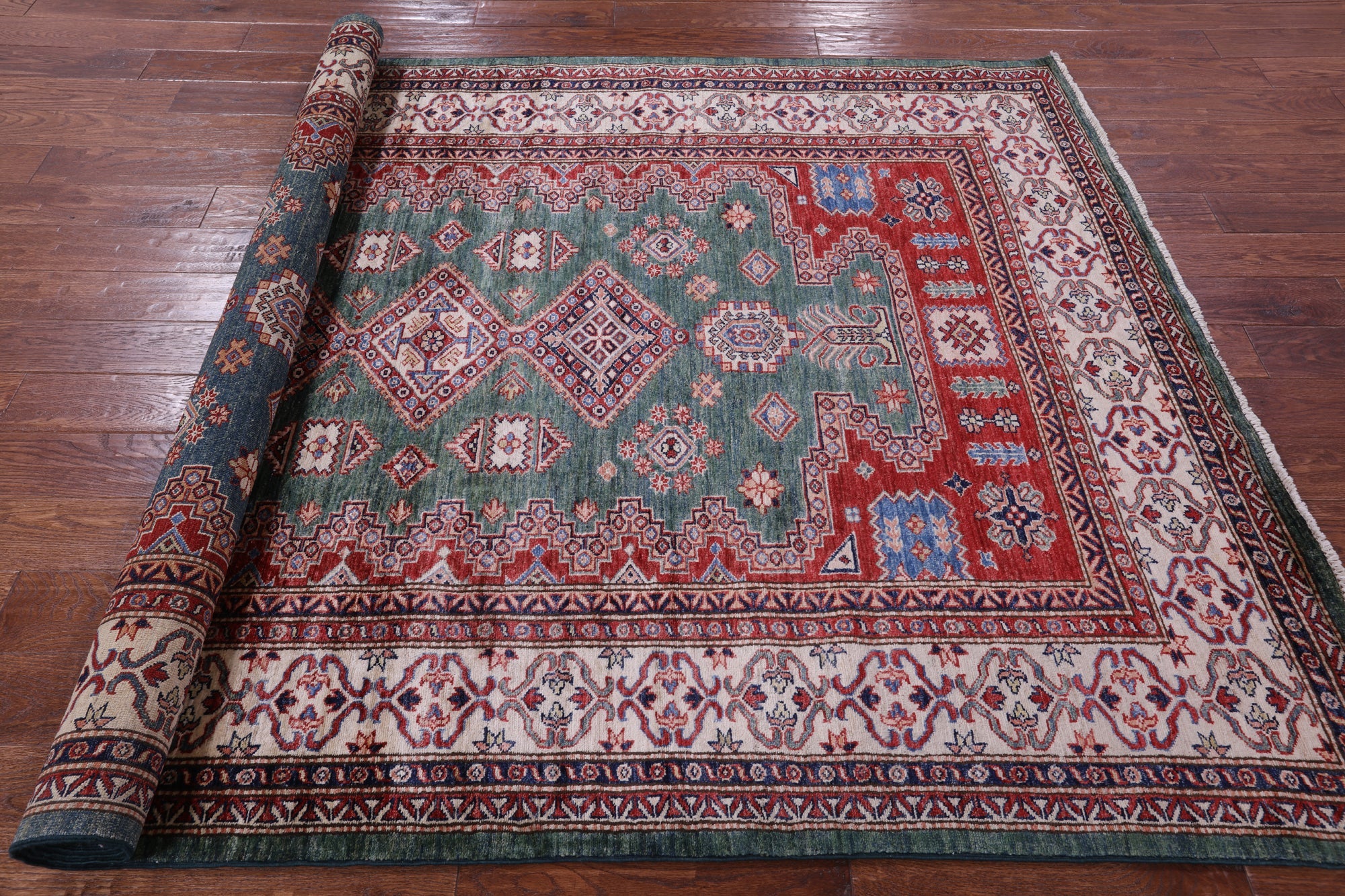 Green 5' 10" X 8' 9" Super Kazak Geometric Hand-Knotted Wool Rug - Q14539 is backordered and will ship as soon as it is back in stock.