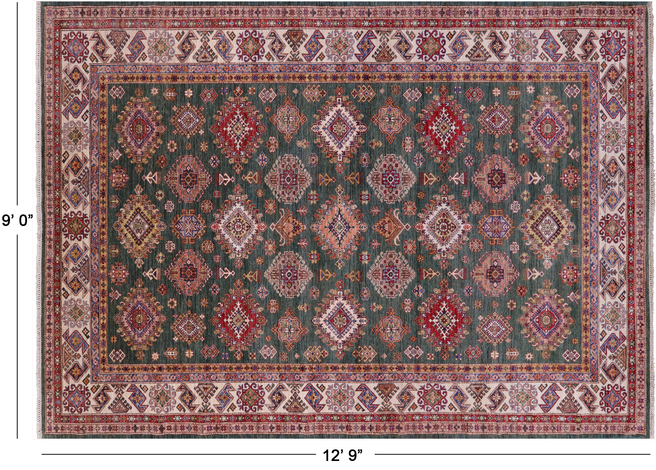 Green Super Kazak Handmade Wool Rug 9' 0" X 12' 9" - Q18448