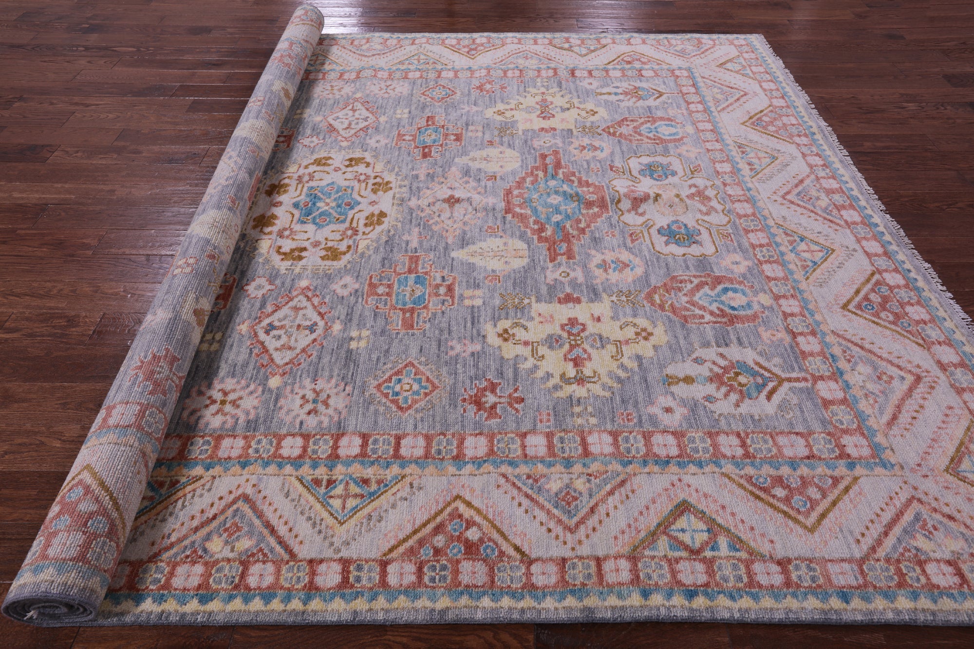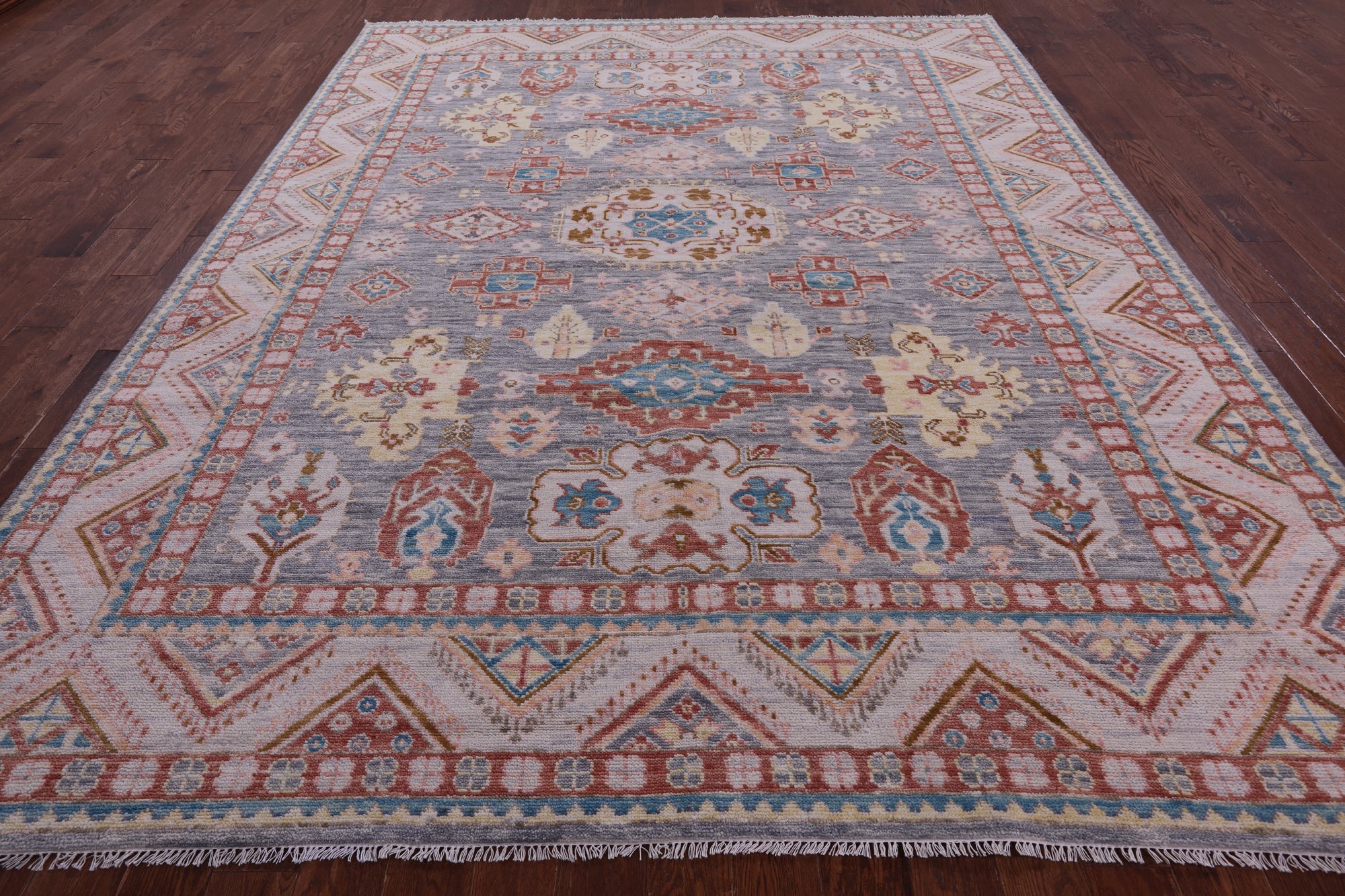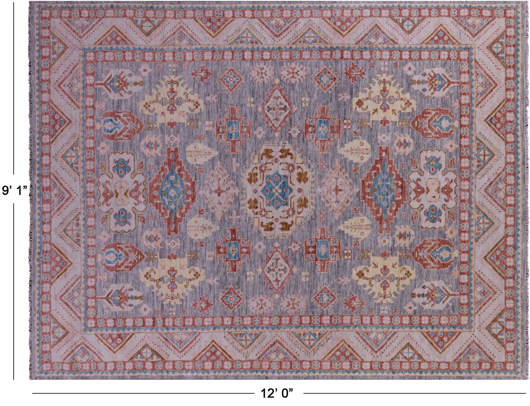 Grey 9' 1" X 12' 0" Geometric Kazak Hand-Knotted Wool Rug - Q19076
