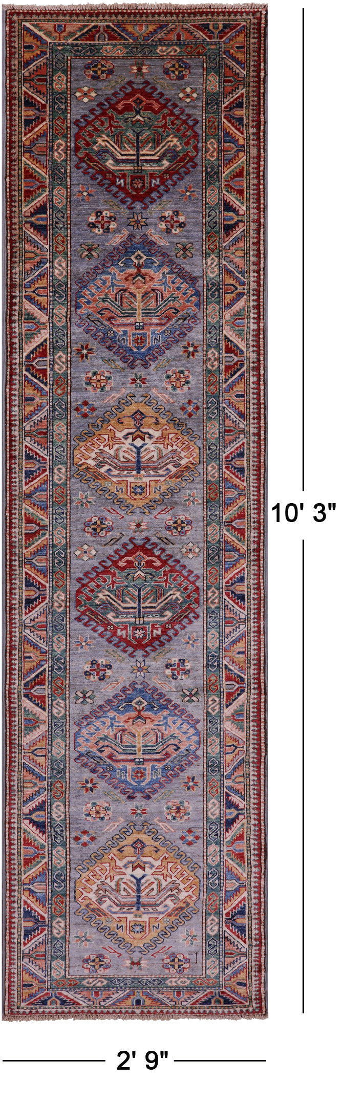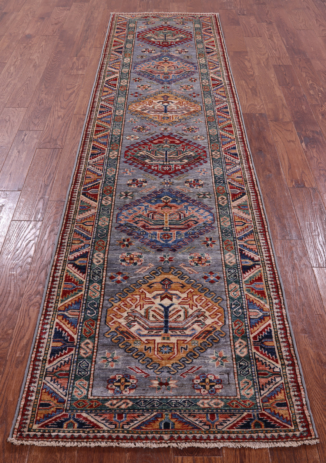 Grey 2' 9" X 10' 3" Super Kazak Handmade Wool Runner Rug - Q16737 is backordered and will ship as soon as it is back in stock.