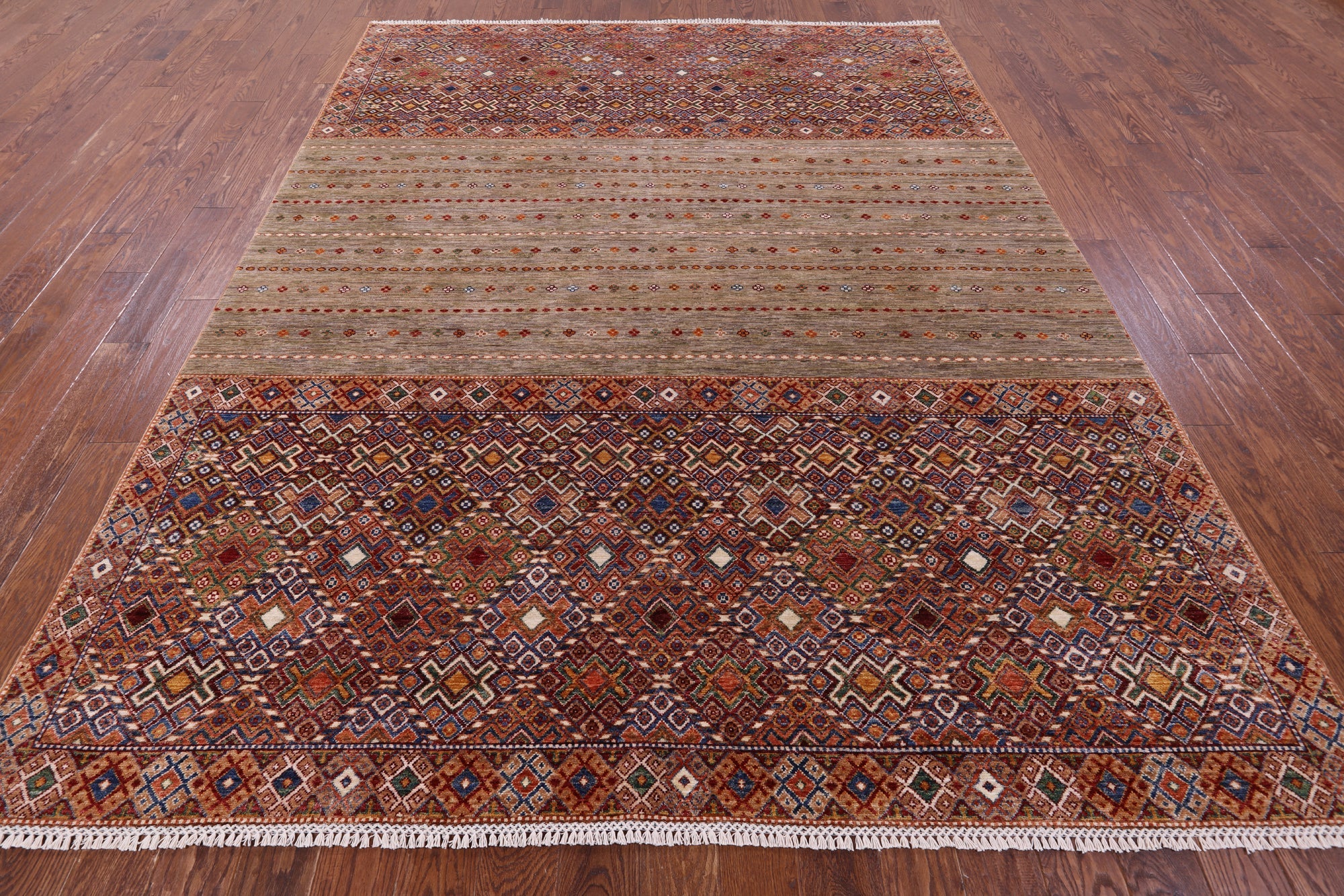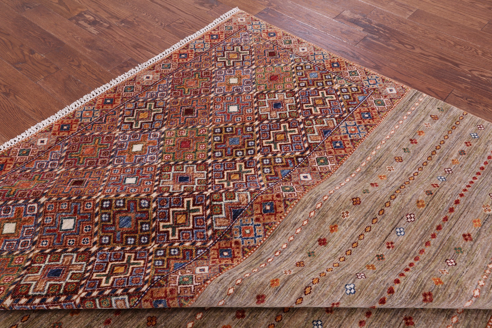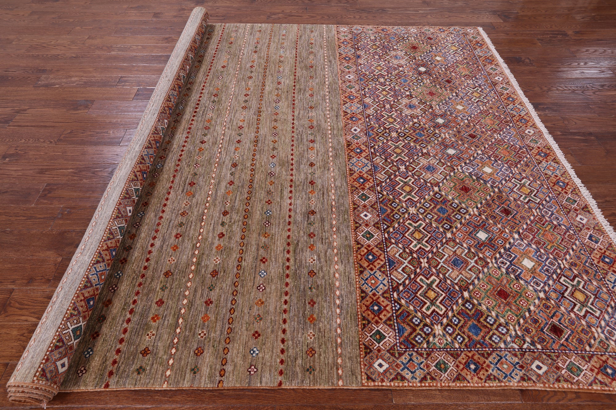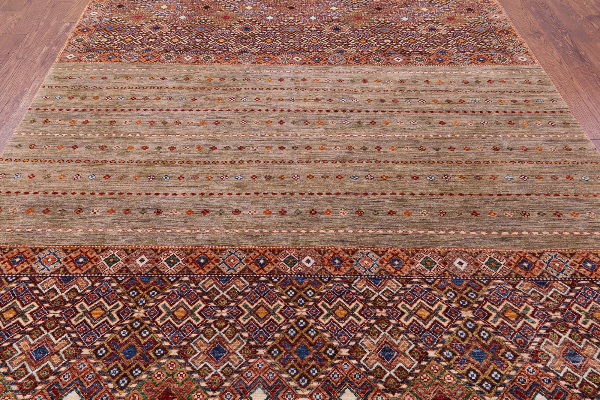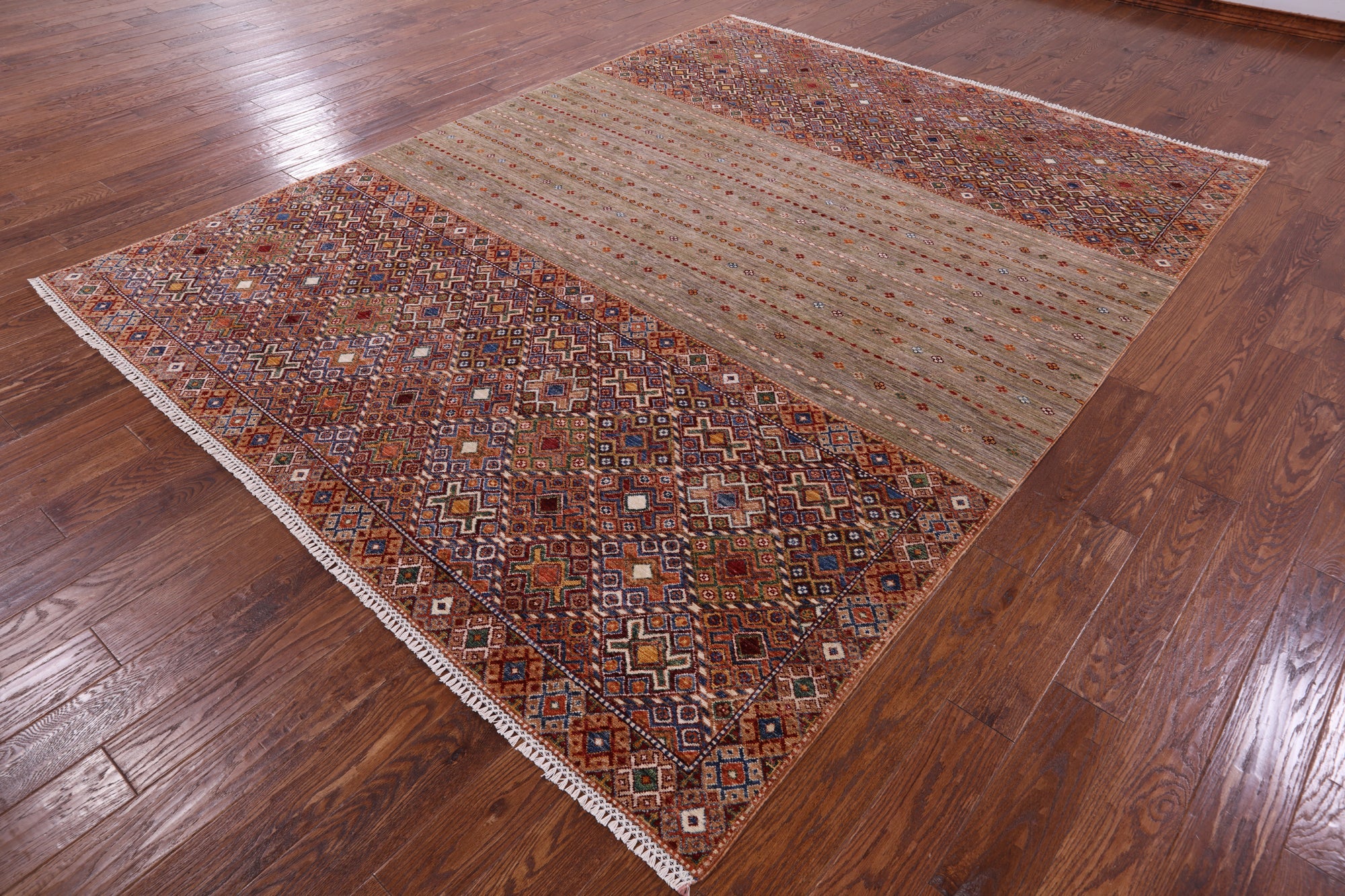Hand Knotted Khorjin Super Kazak Wool Rug 8' 0" X 10' 5" - Q11296 is backordered and will ship as soon as it is back in stock.