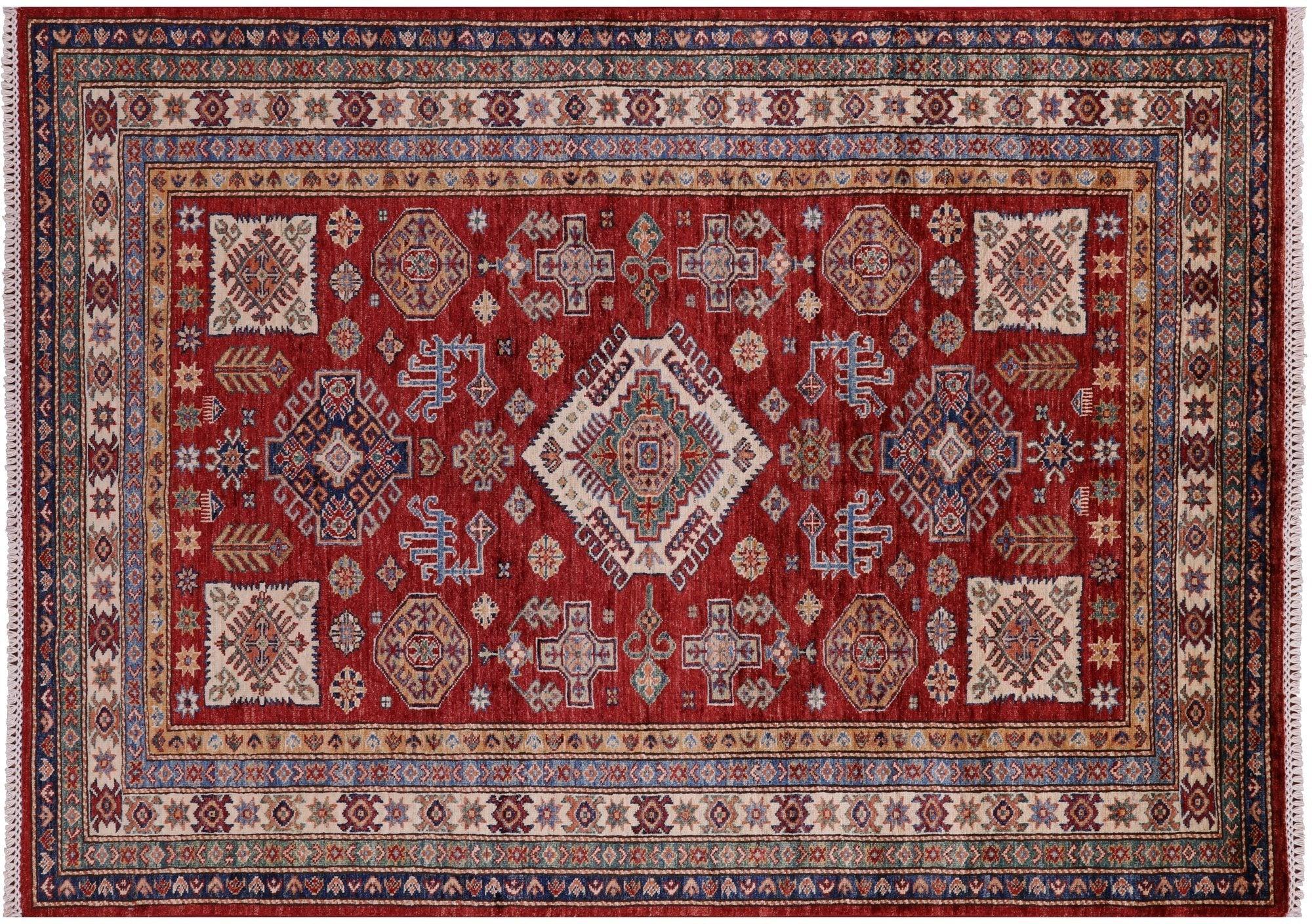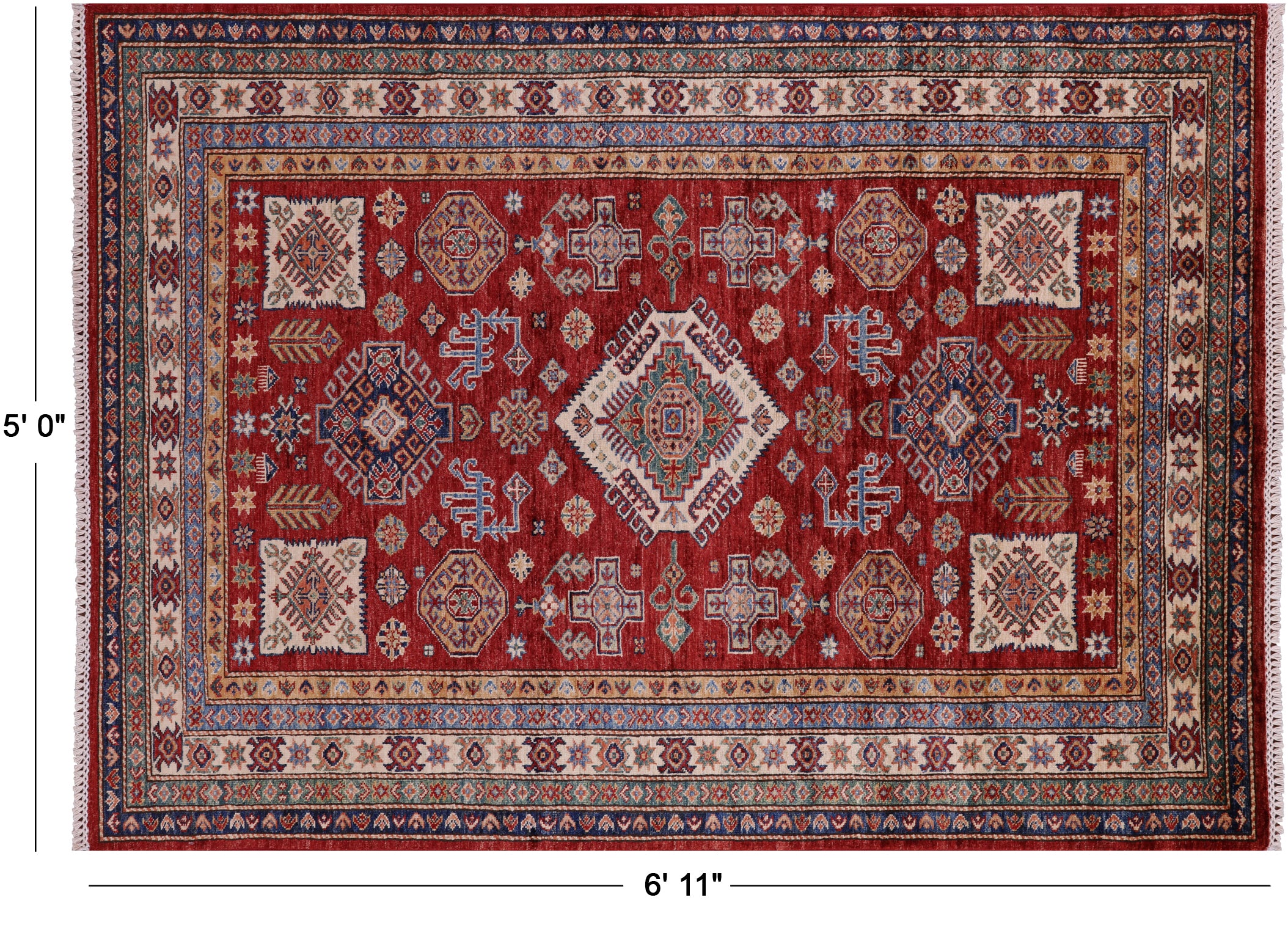 Red Geometric Super Kazak Handmade Wool Rug 5' 0" X 6' 11" - Q12942