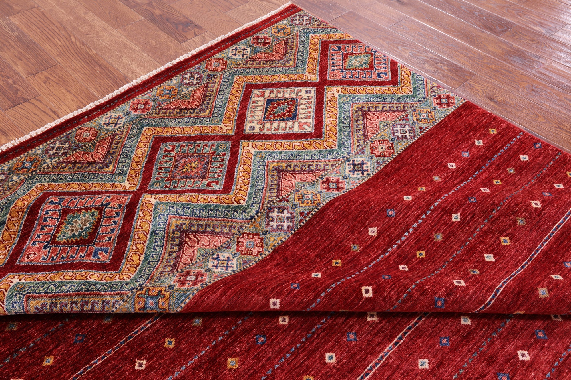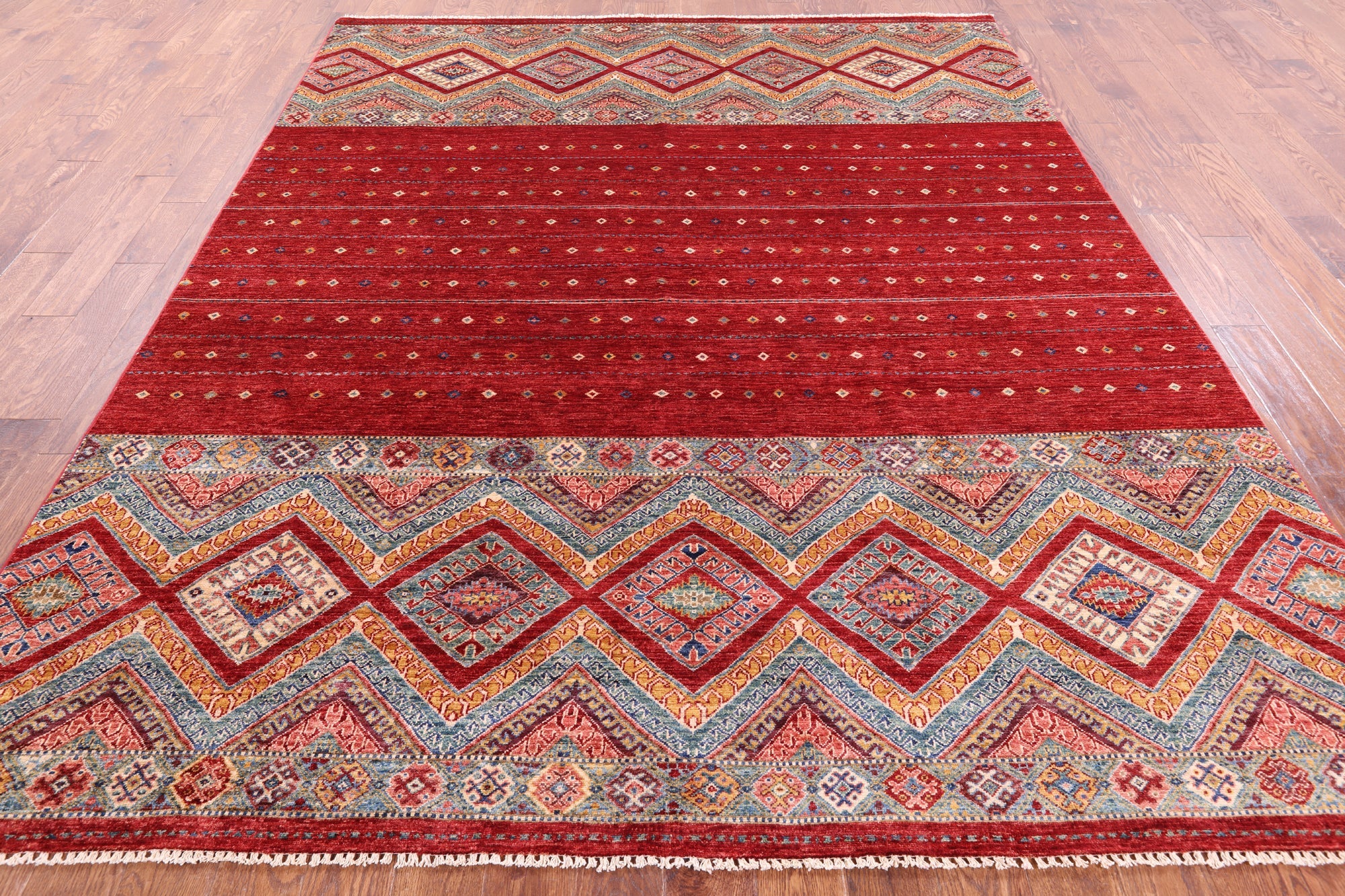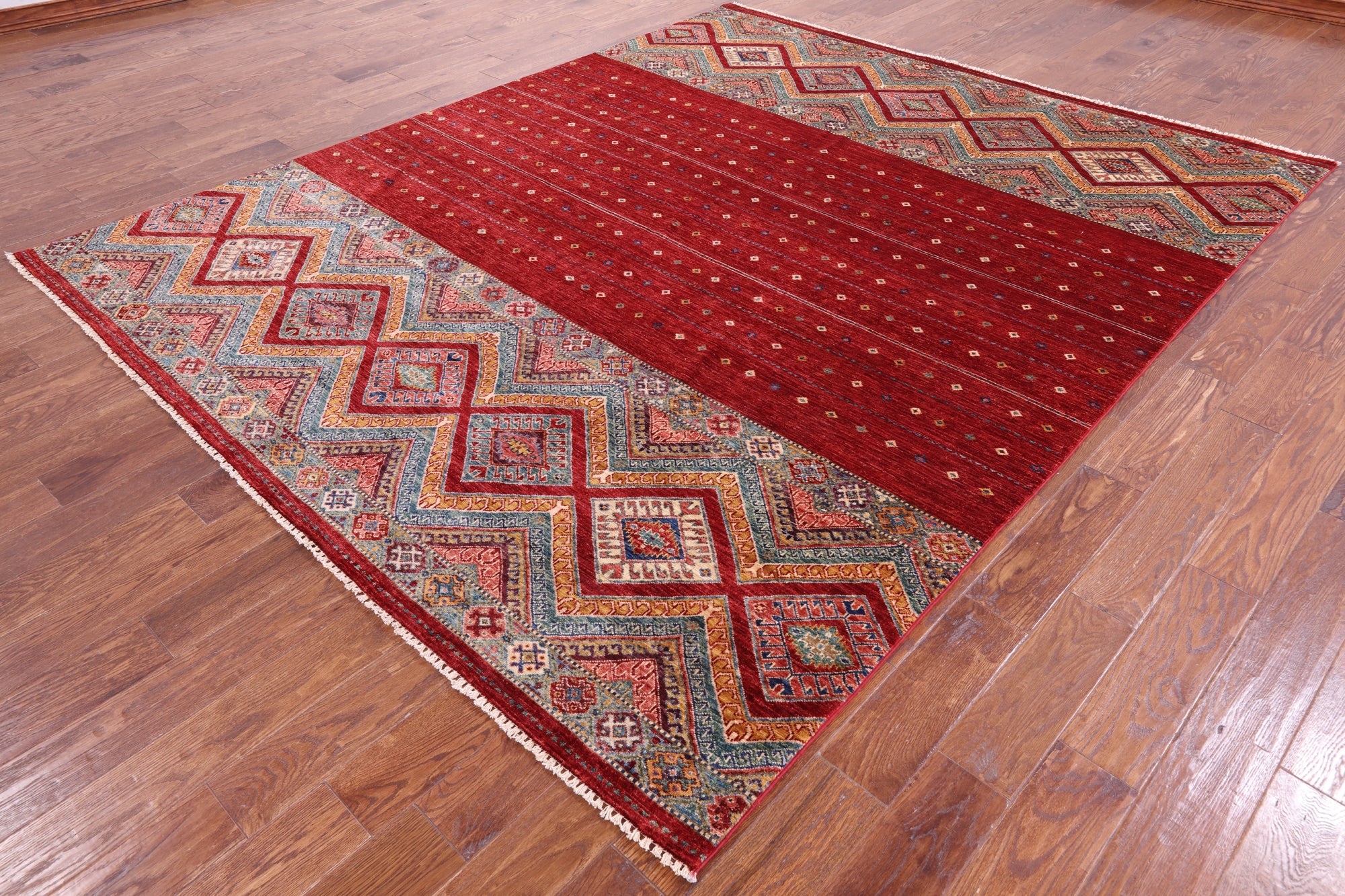 Red 8' 0" X 9' 9" Hand-Knotted Khorjin Super Kazak Wool Rug - Q10744 is backordered and will ship as soon as it is back in stock.