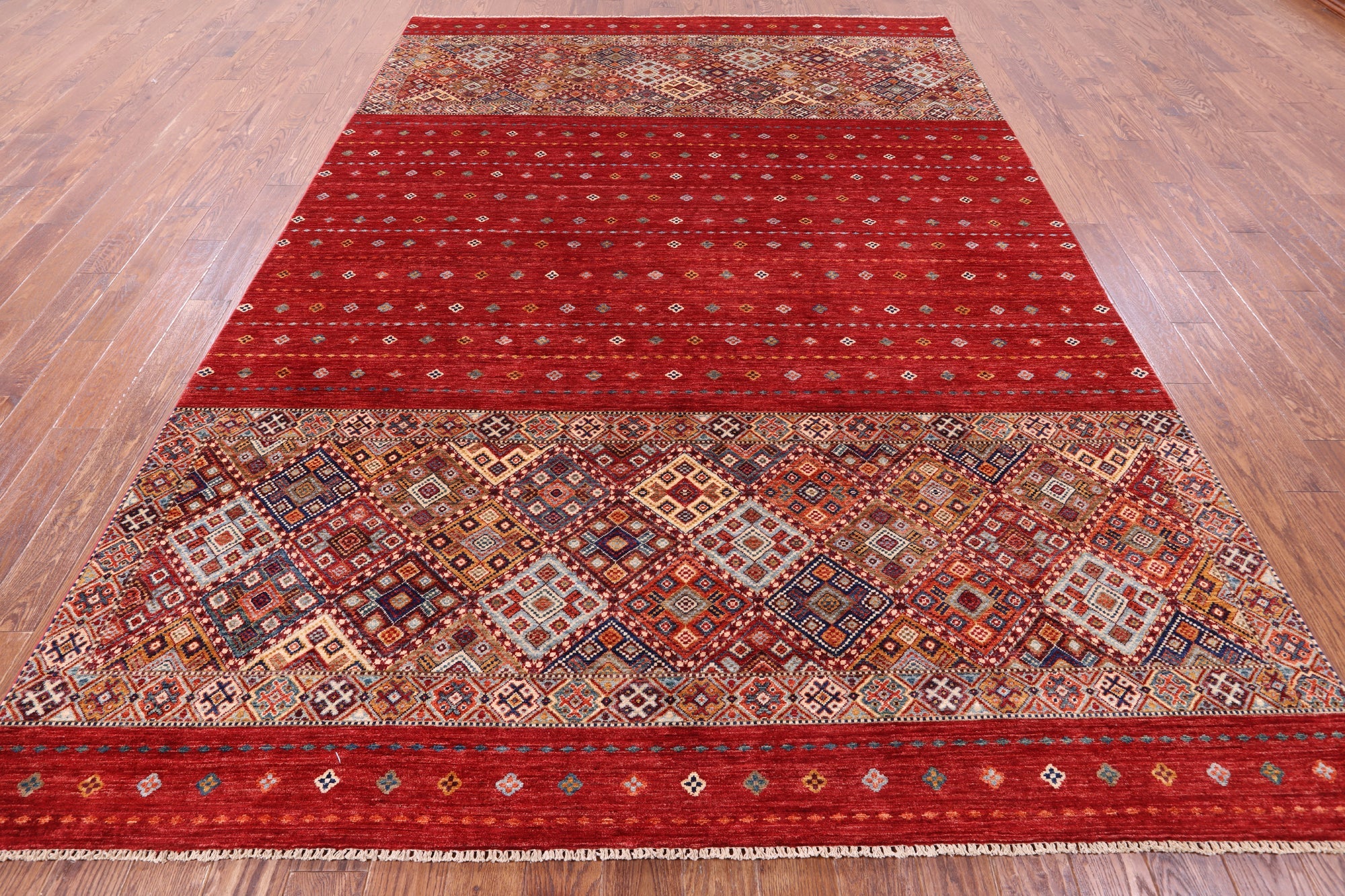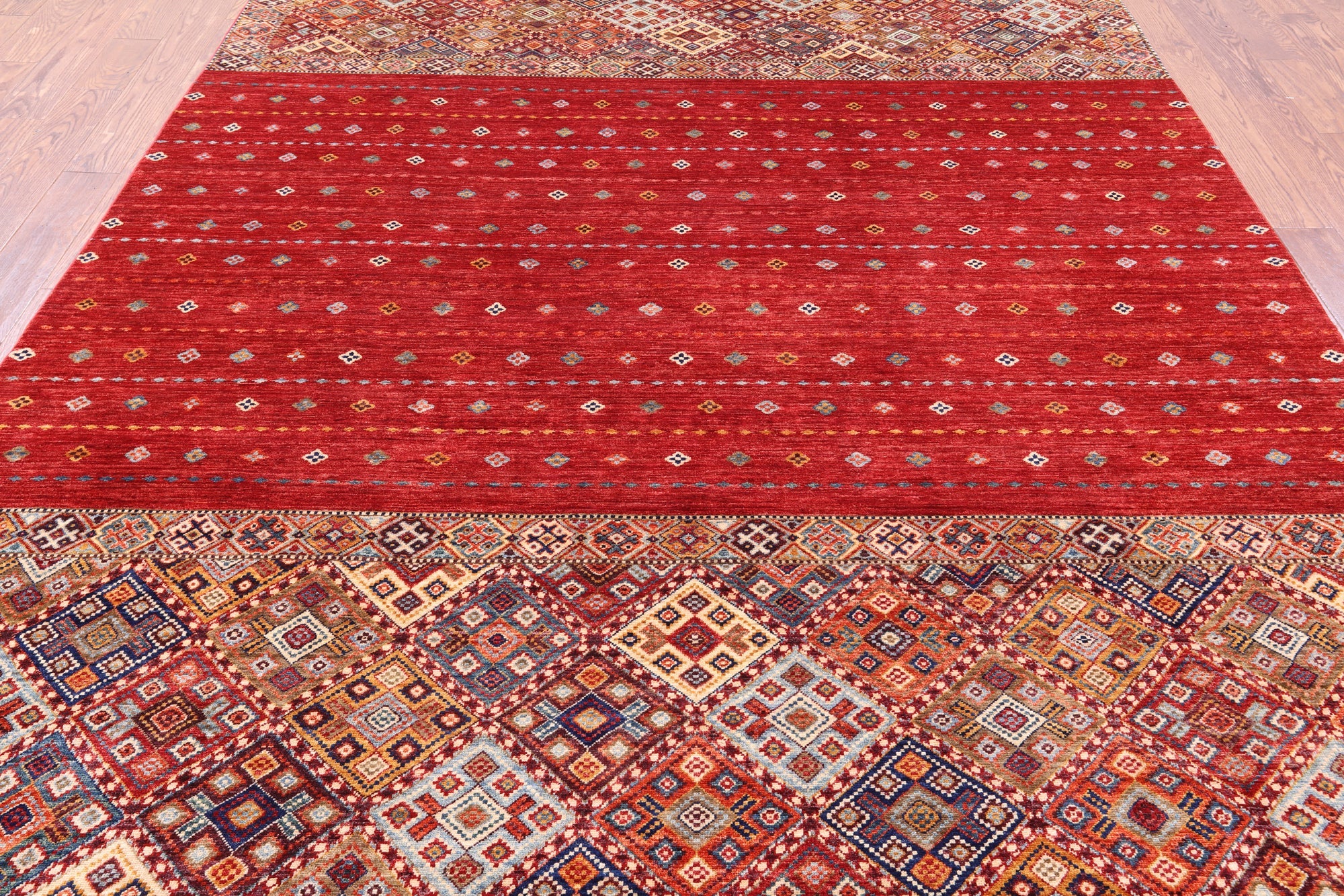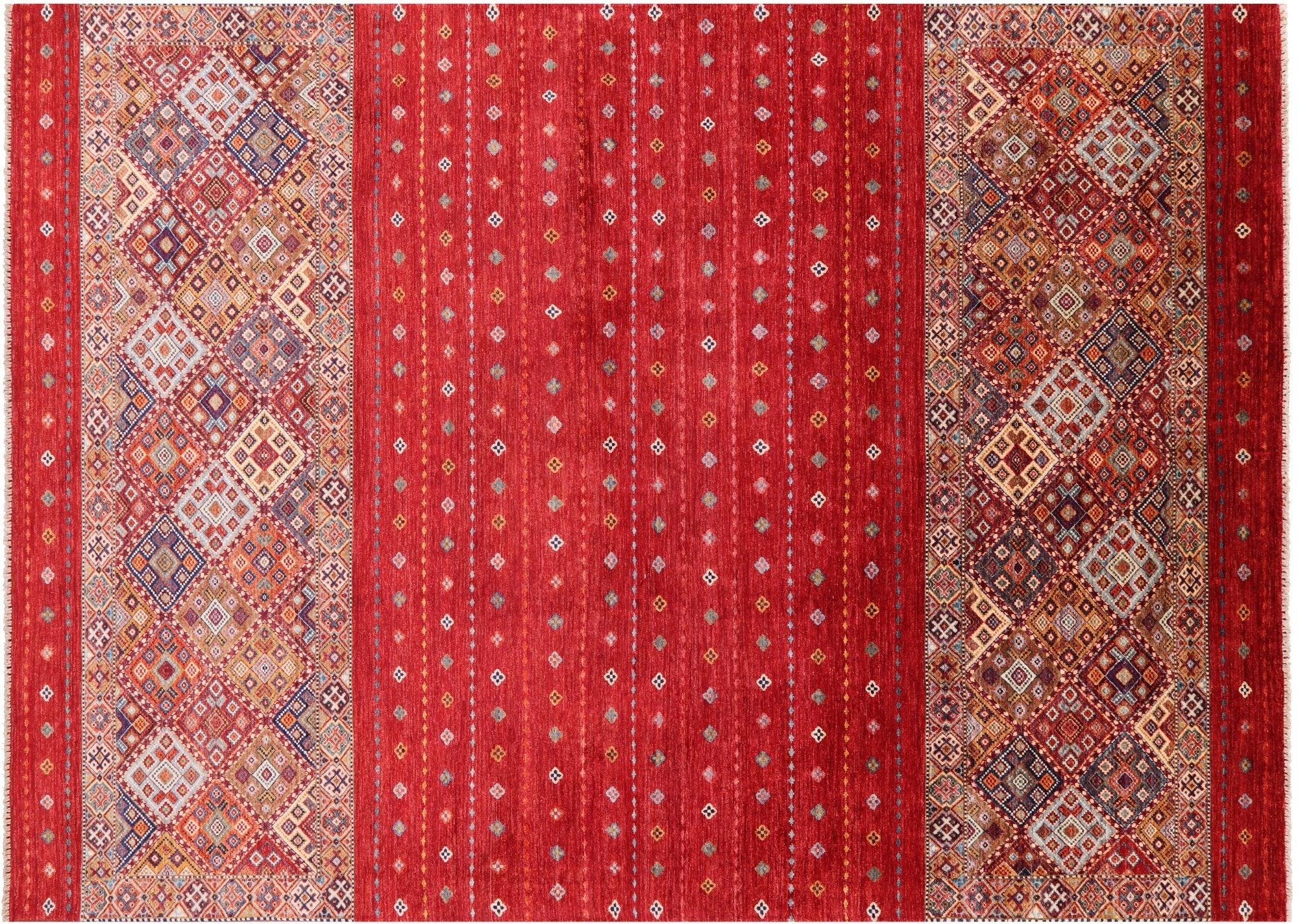 Red 8' 3" X 11' 7" Handmade Khorjin Super Kazak Wool Rug - Q10858 is backordered and will ship as soon as it is back in stock.