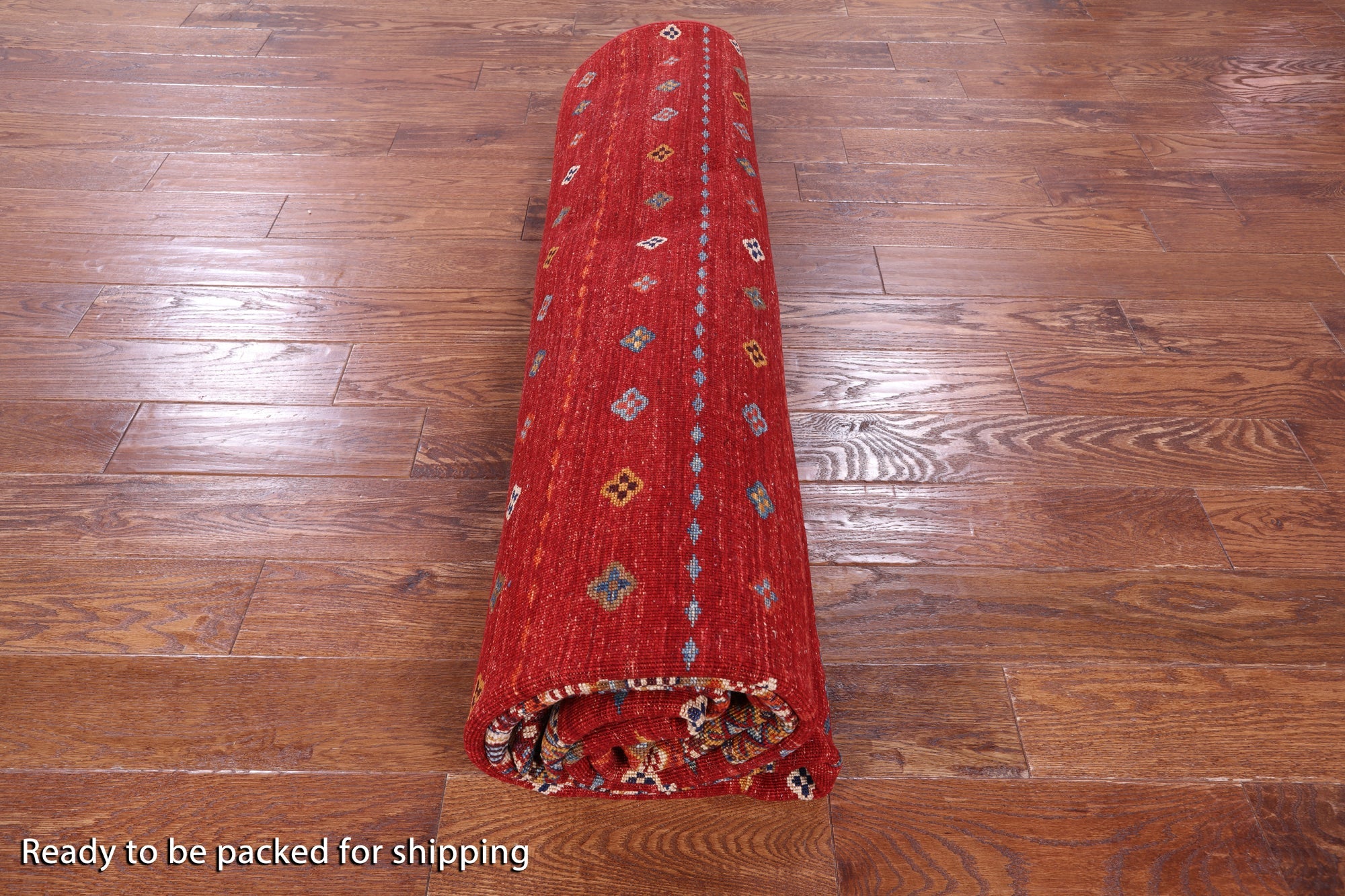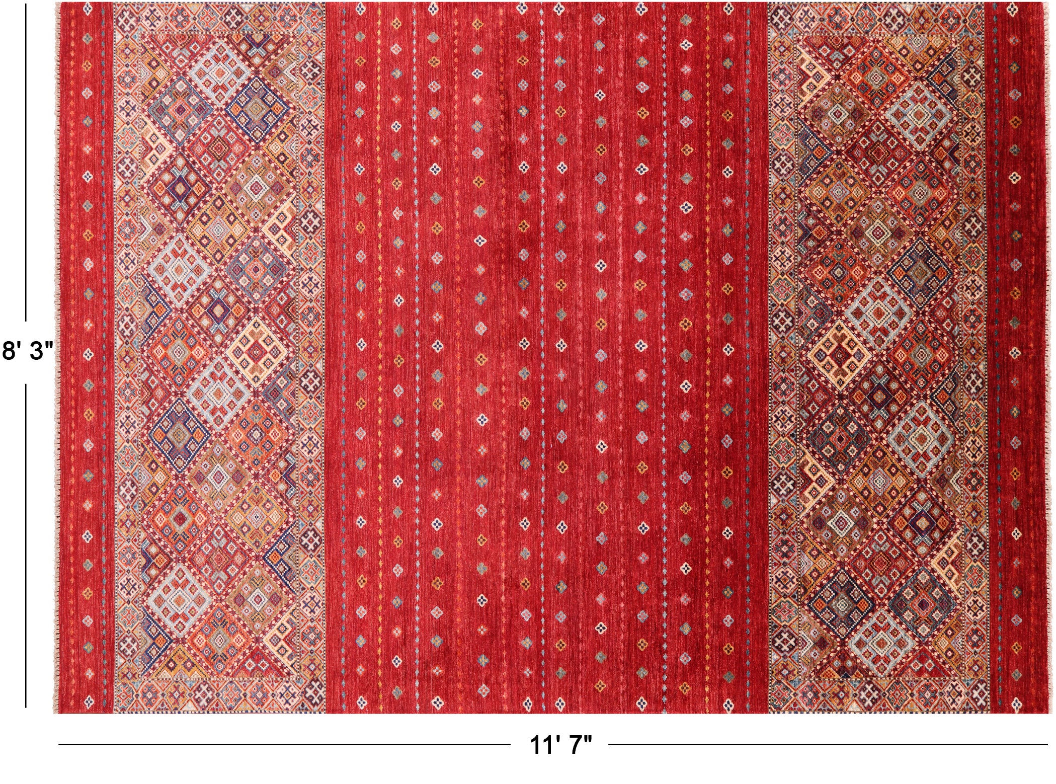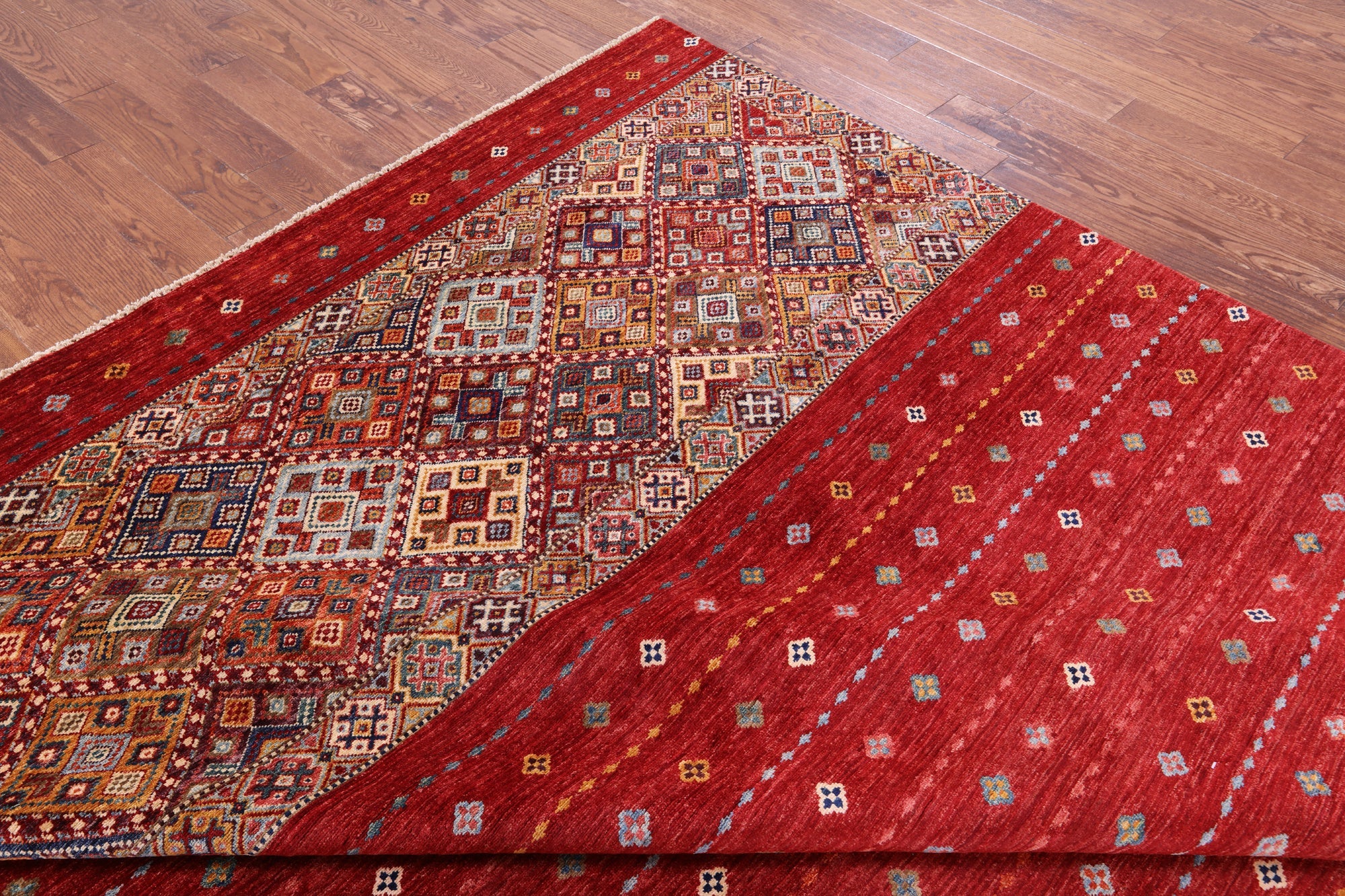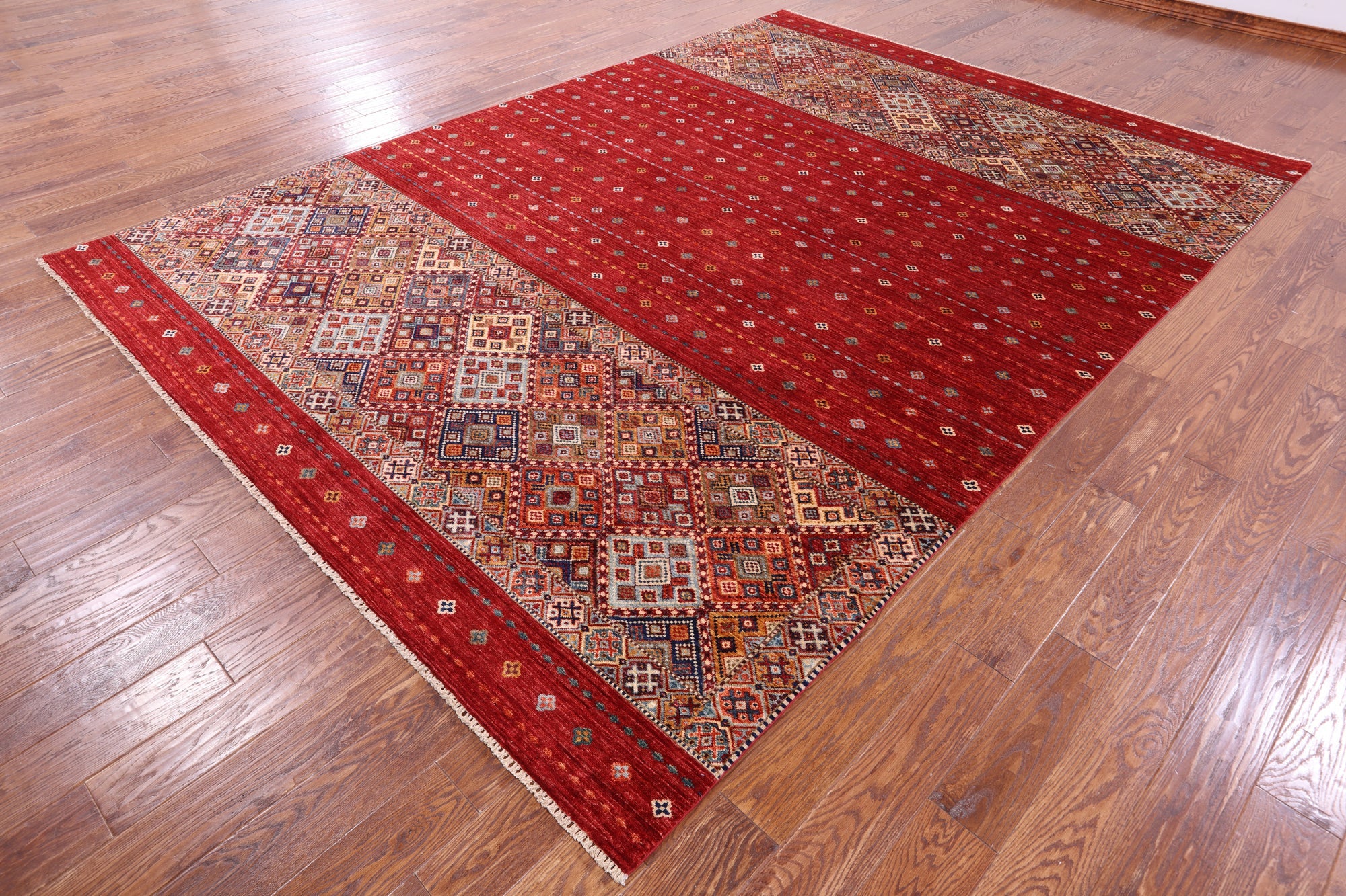 Red 8' 3" X 11' 7" Handmade Khorjin Super Kazak Wool Rug - Q10858 is backordered and will ship as soon as it is back in stock.