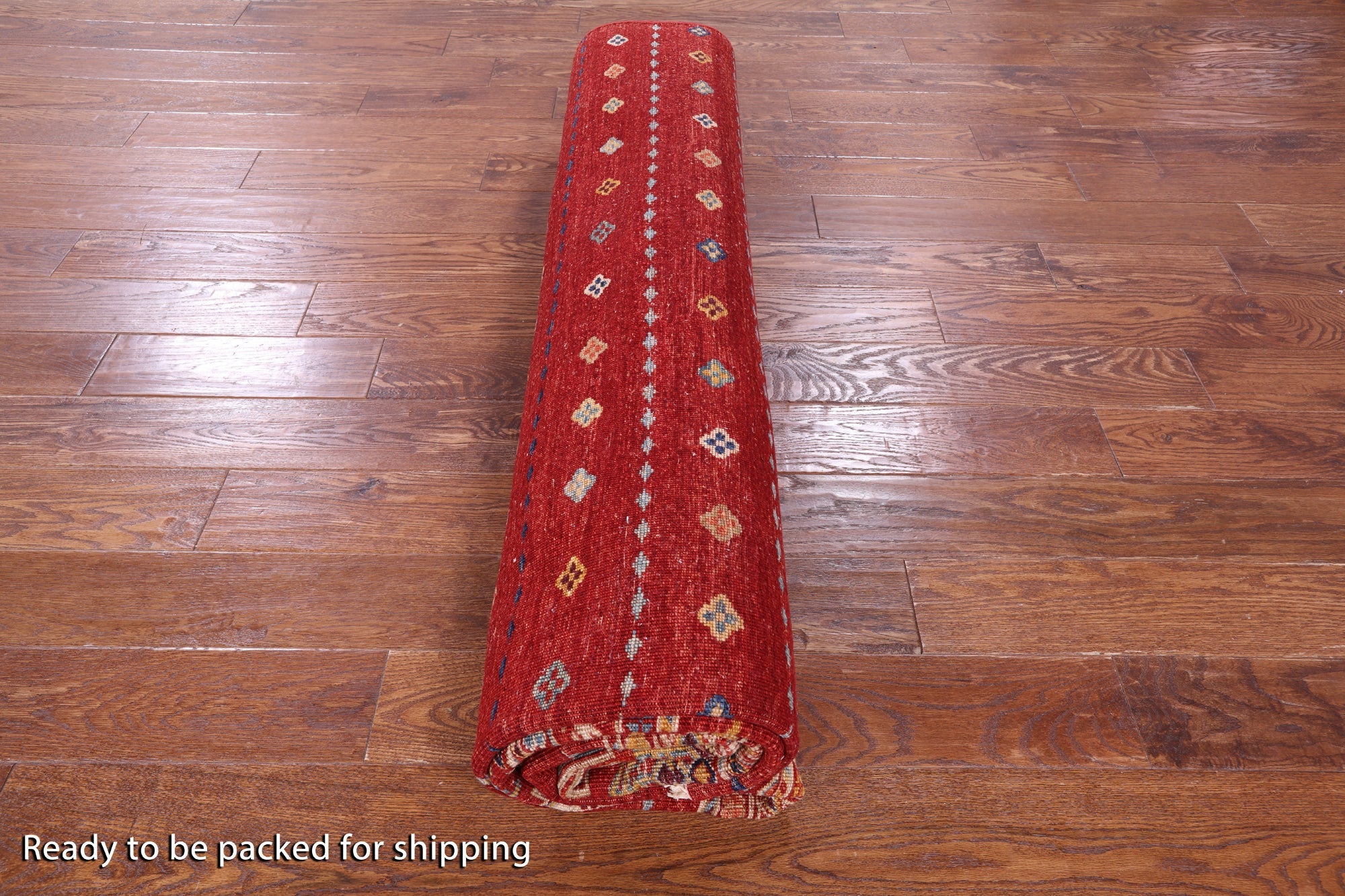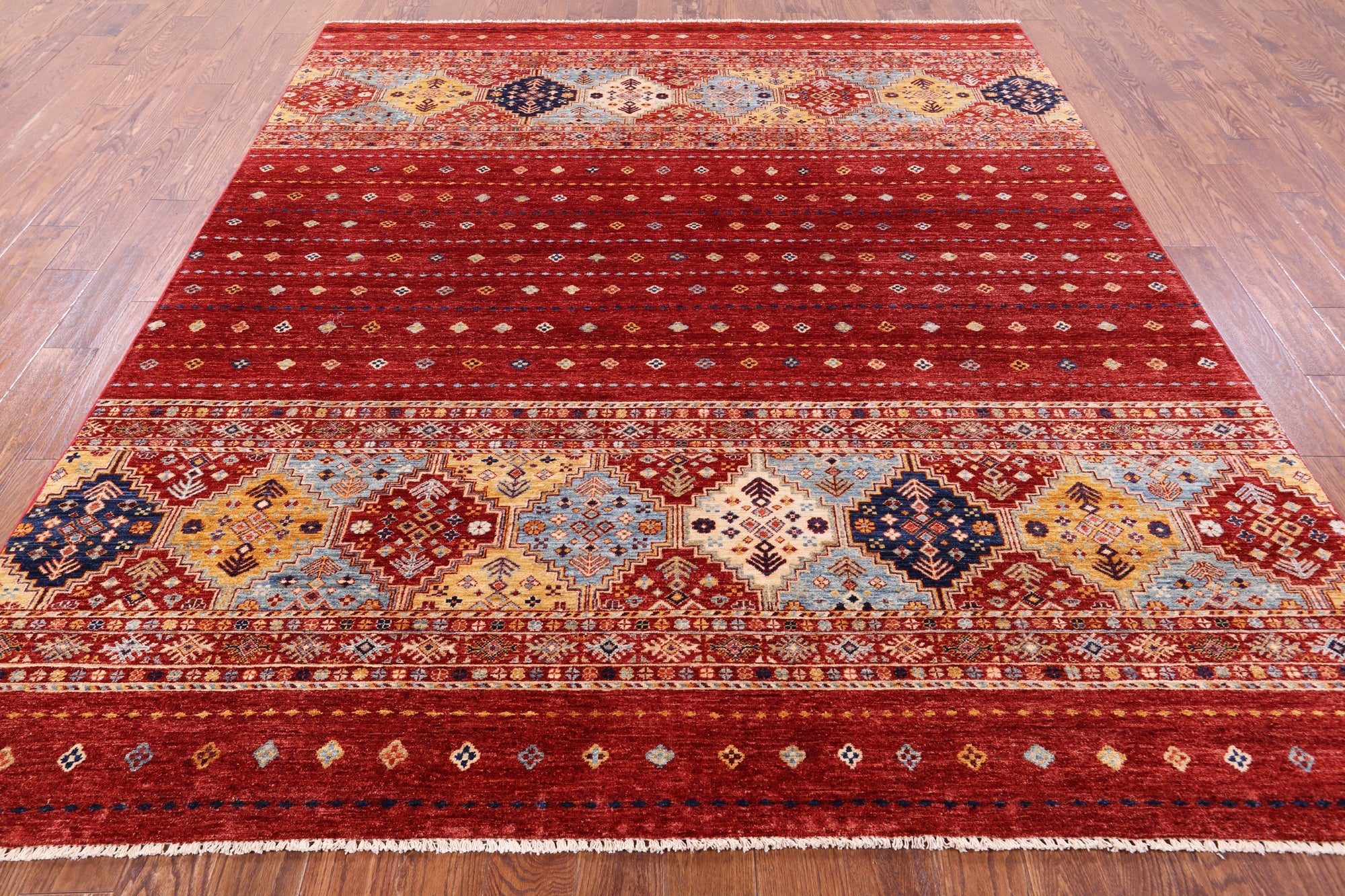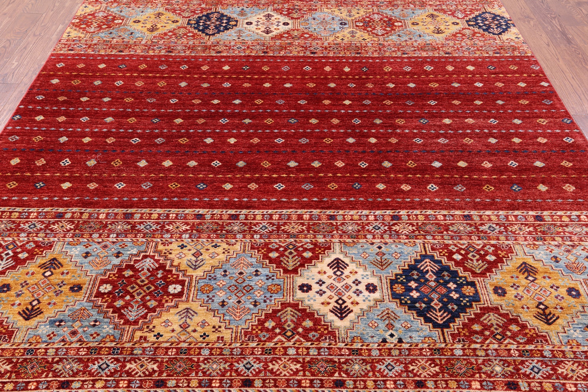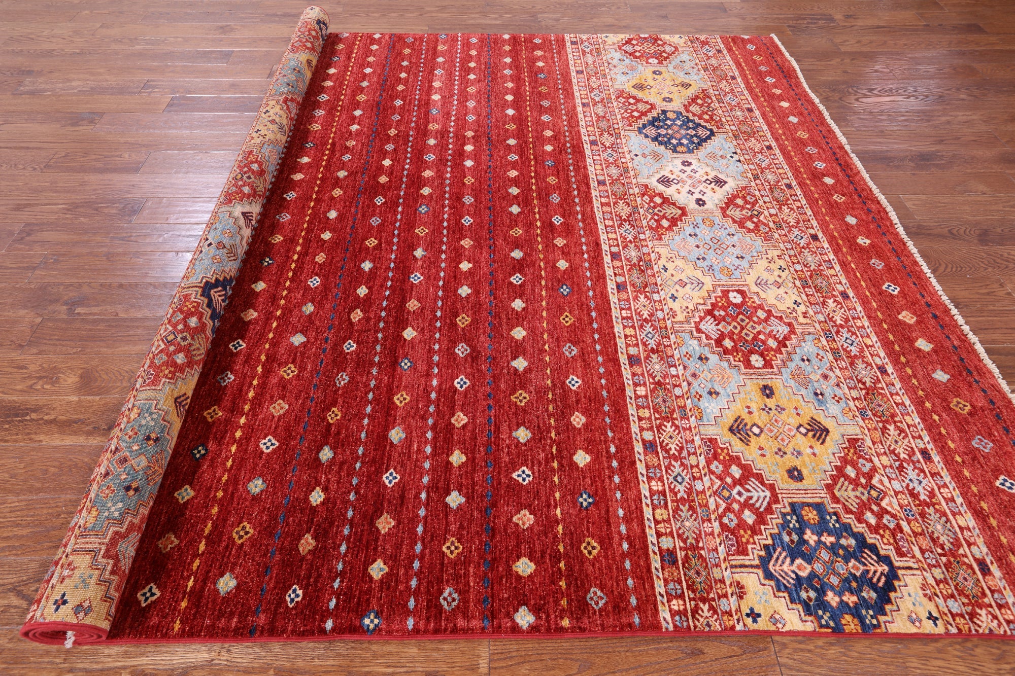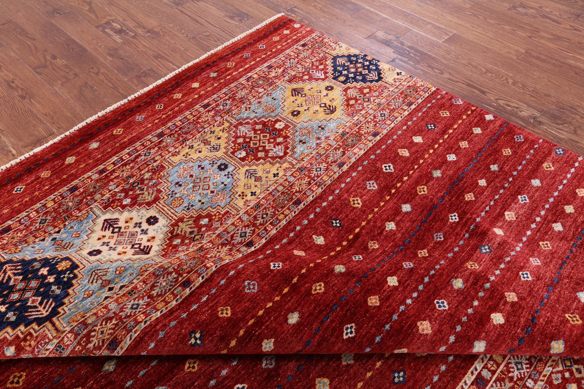 Red 8' 2" X 9' 7" Khorjin Super Kazak Hand-Knotted Rug - Q10981 is backordered and will ship as soon as it is back in stock.