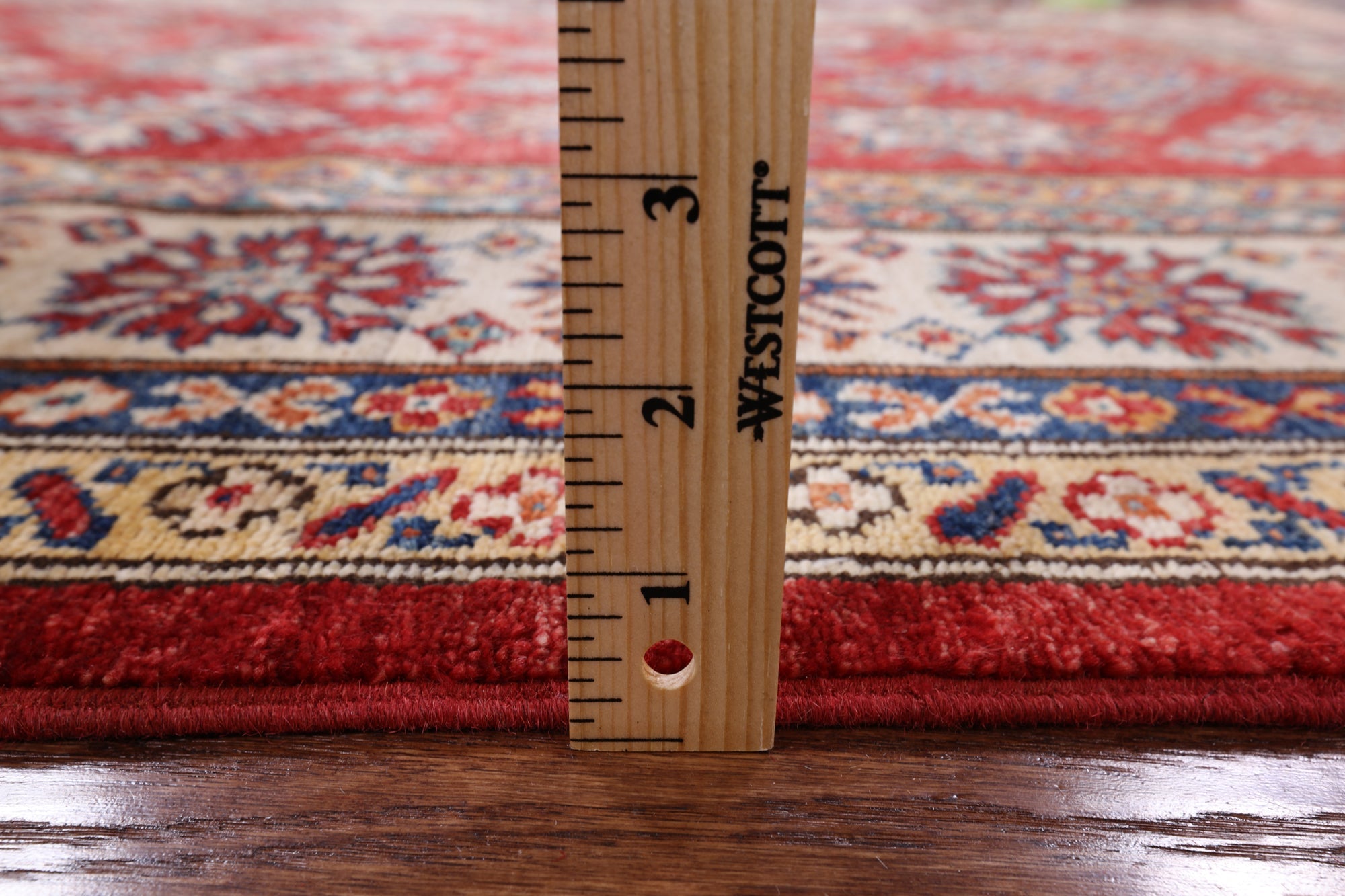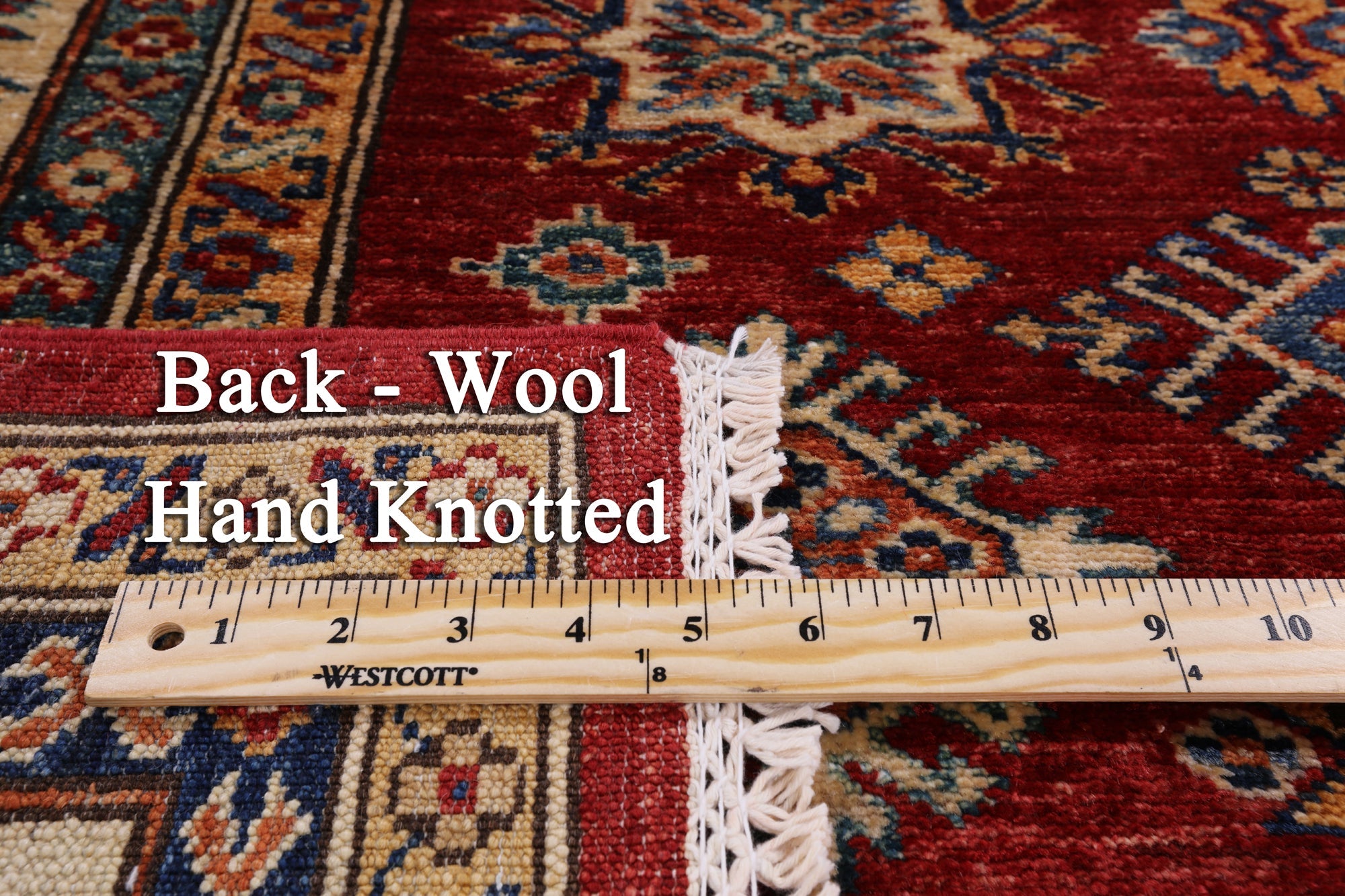 Red Super Kazak Geometric Hand Knotted Wool Area Rug 5' 0" X 6' 9" - P9045 is backordered and will ship as soon as it is back in stock.
