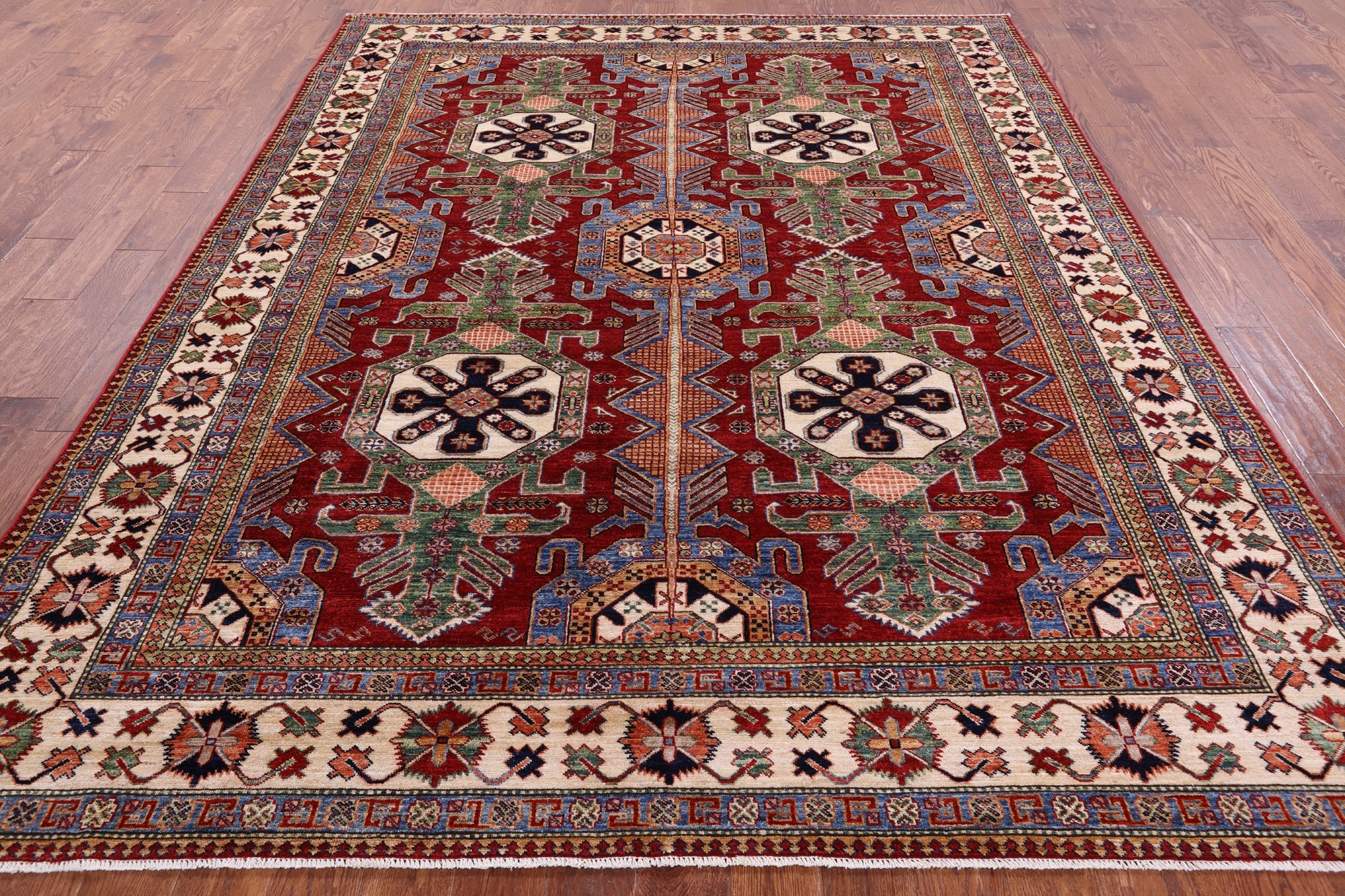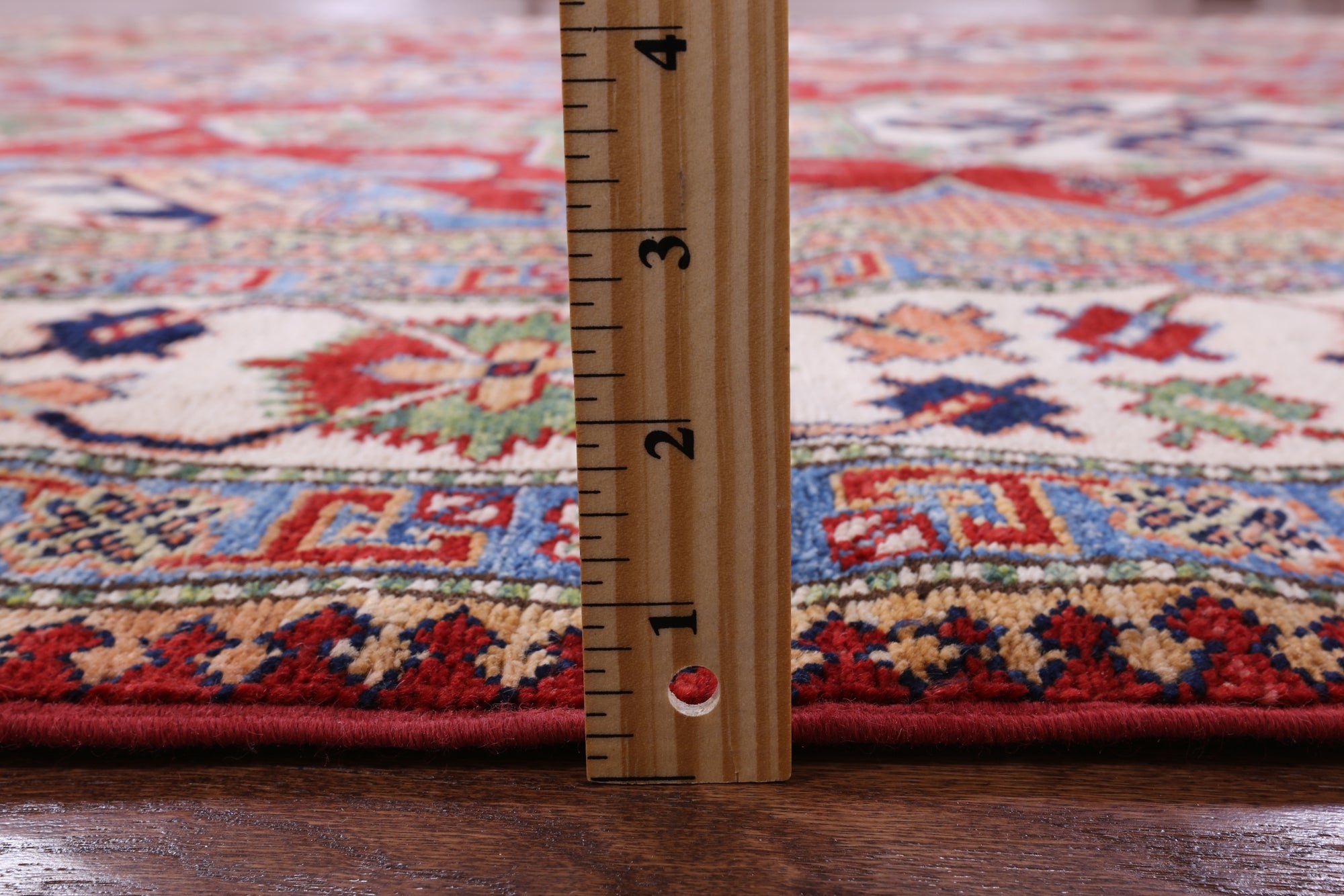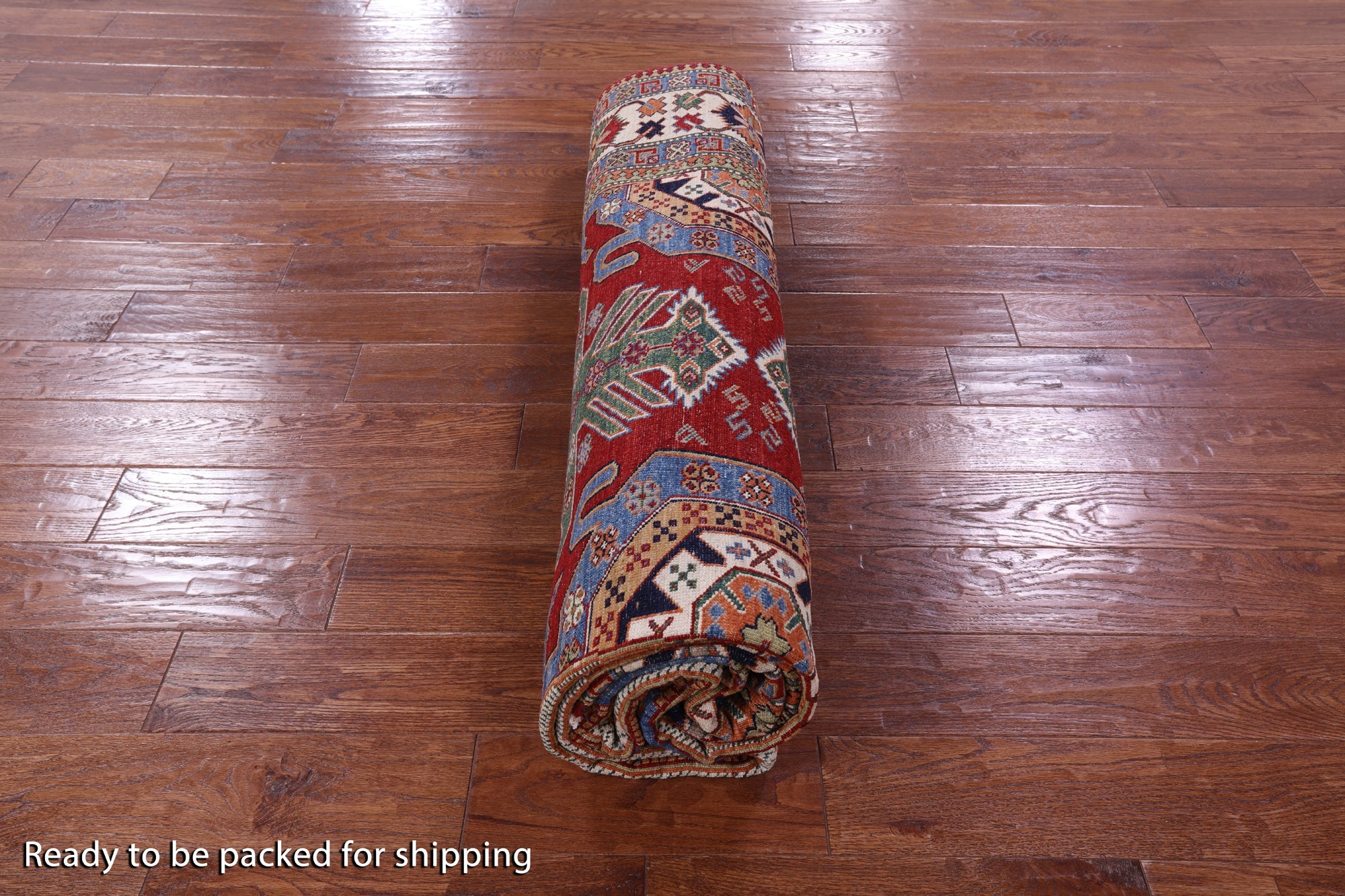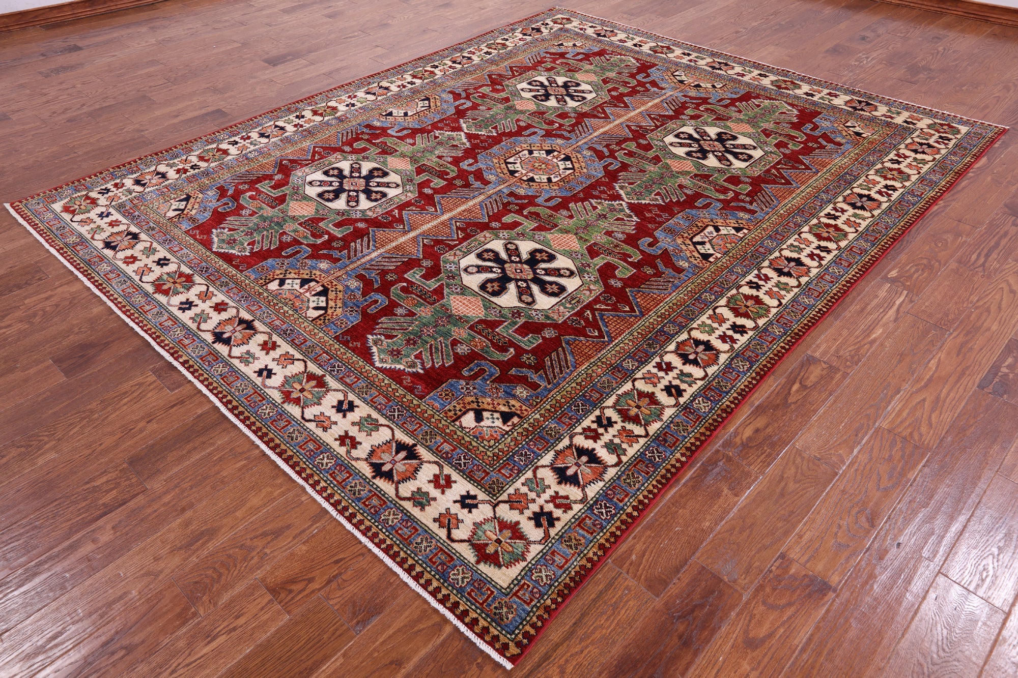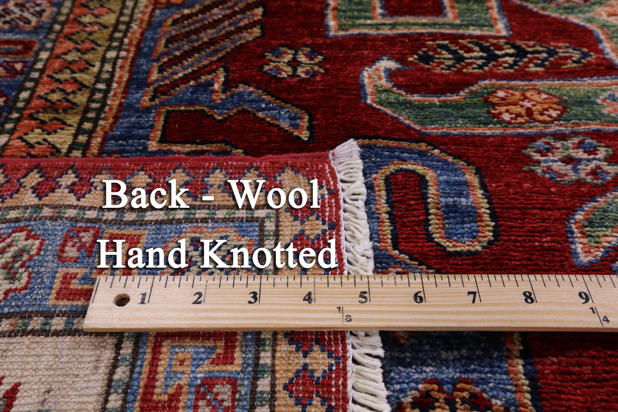 Red 8' 1" X 10' 1" Super Kazak Geometric Handmade Wool Rug - Q10535 is backordered and will ship as soon as it is back in stock.