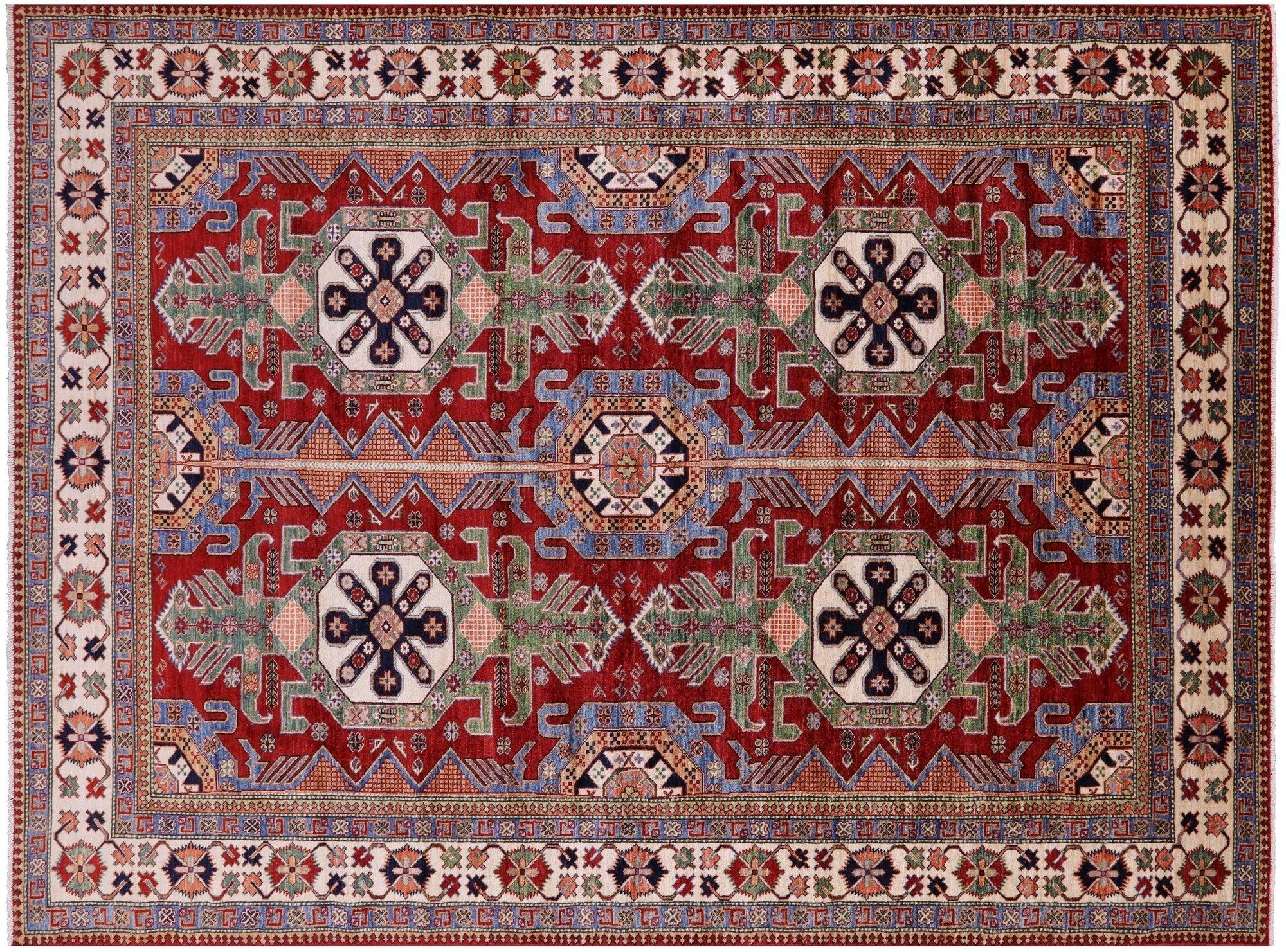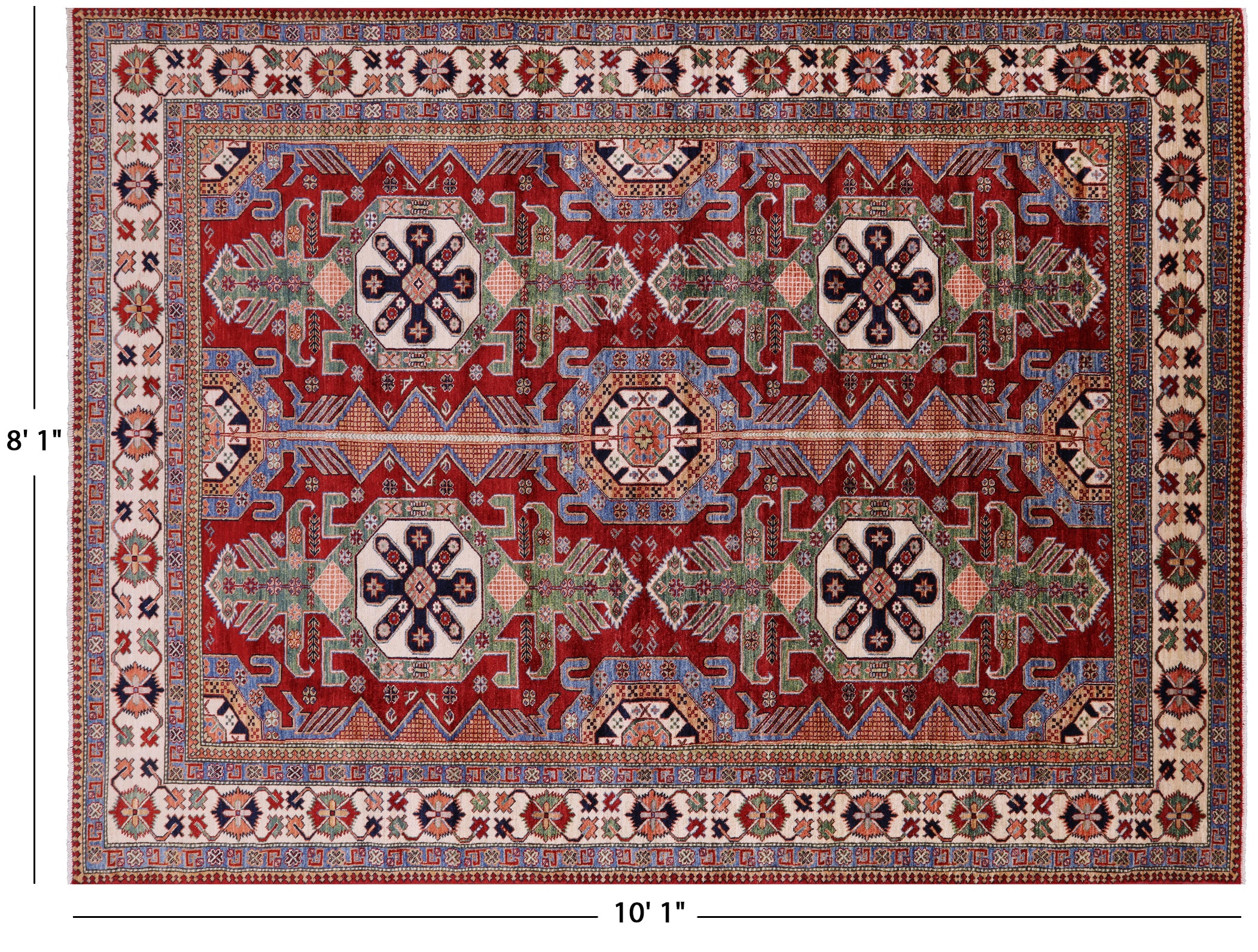 Red 8' 1" X 10' 1" Super Kazak Geometric Handmade Wool Rug - Q10535
