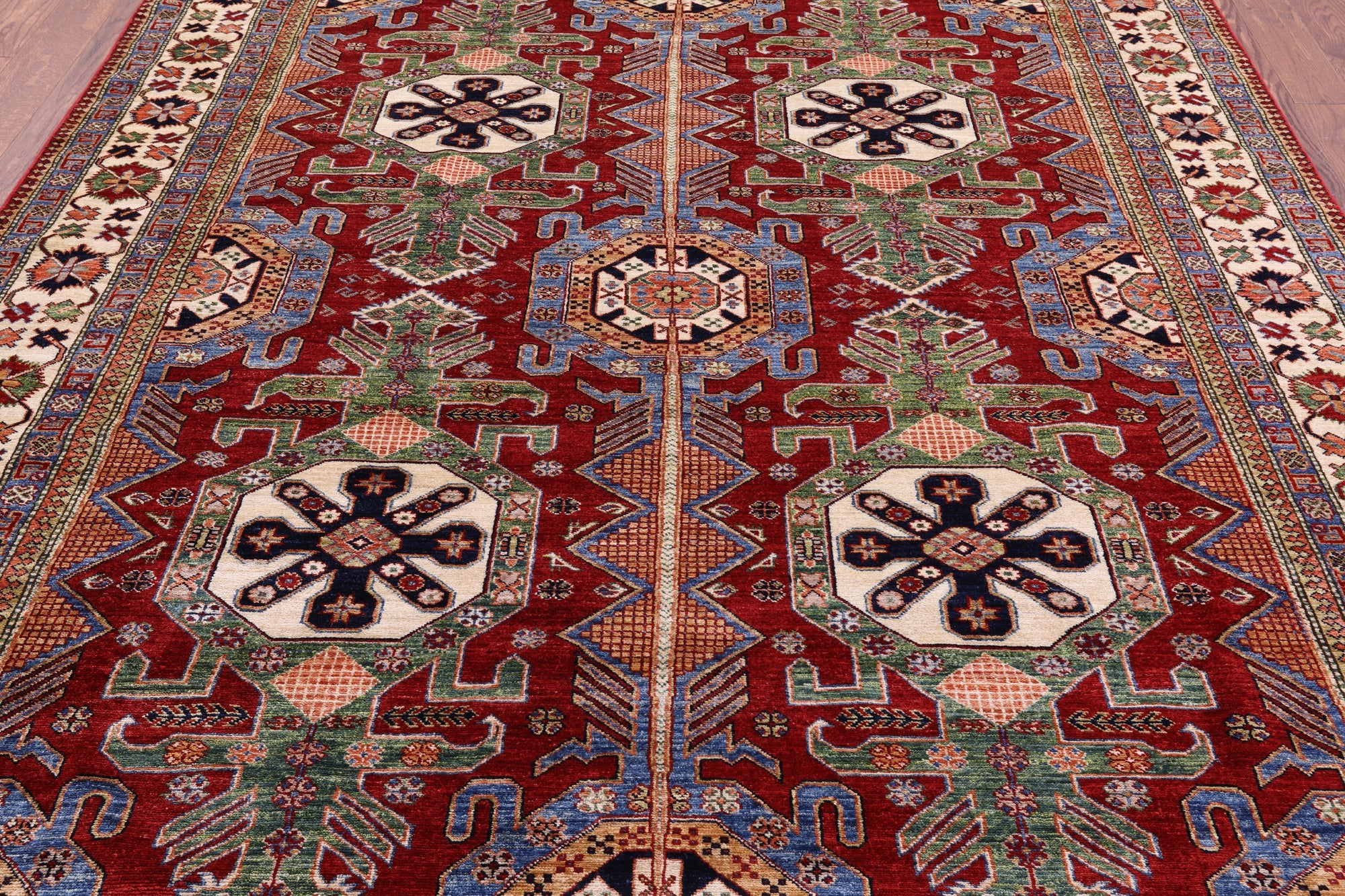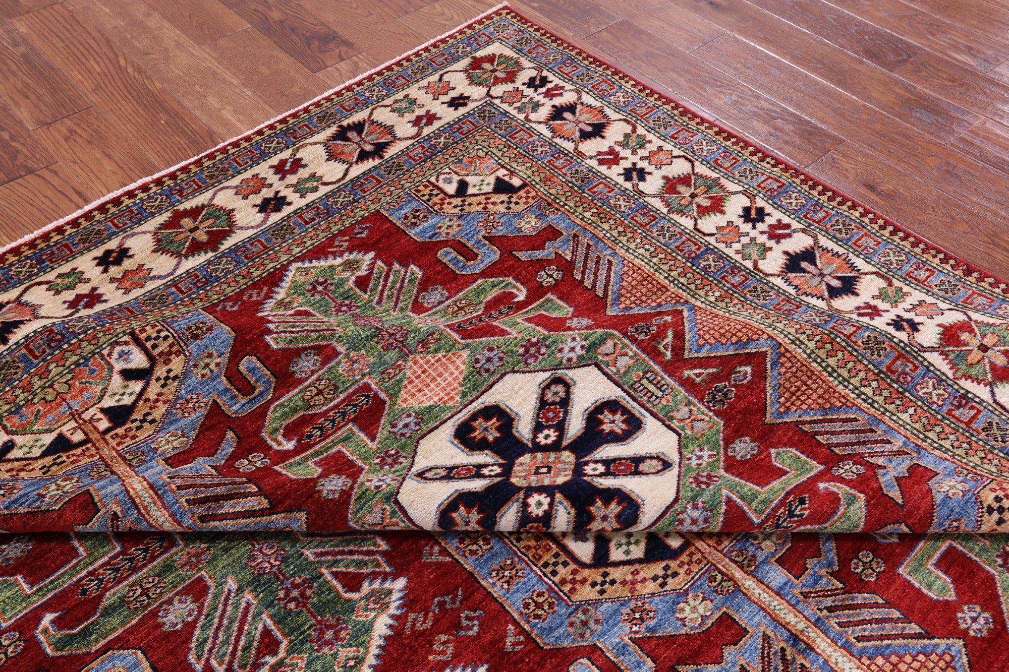 Super Kazak rugs were woven in the south of Caucasus and are very regional in their designs. Super Kazak rugs are very traditional in look and the patterns can vary from geometric shapes, tribal designs like people and animals, and symbolic medallions. They are beautifully intricate and heavy in design. These rugs come in varieties of rich, warm, jewel tones that can liven up any space.