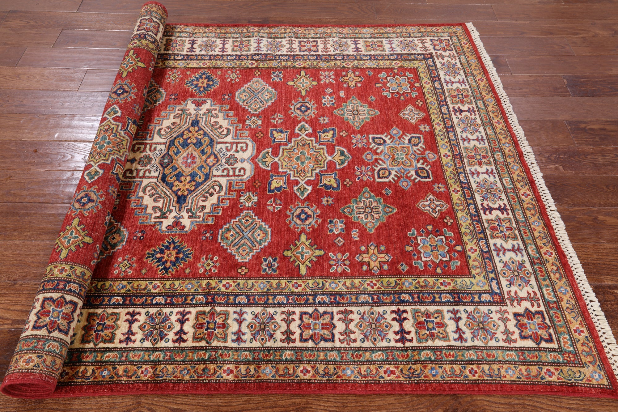 Red 4' 11" X 6' 10" Super Kazak Hand Knotted Area Rug - P9032 is backordered and will ship as soon as it is back in stock.