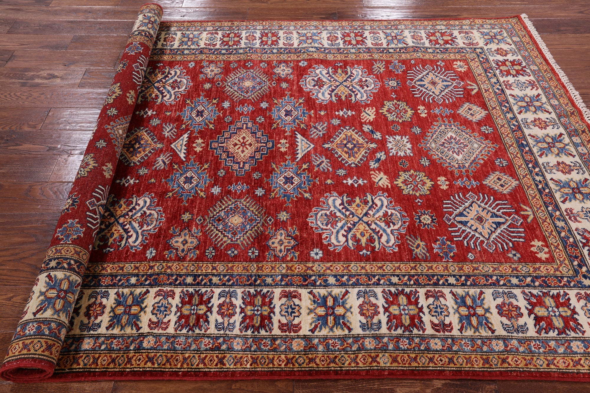 Red Super Kazak Handmade Wool Area Rug 5' 6" X 7' 8" - P8943 is backordered and will ship as soon as it is back in stock.