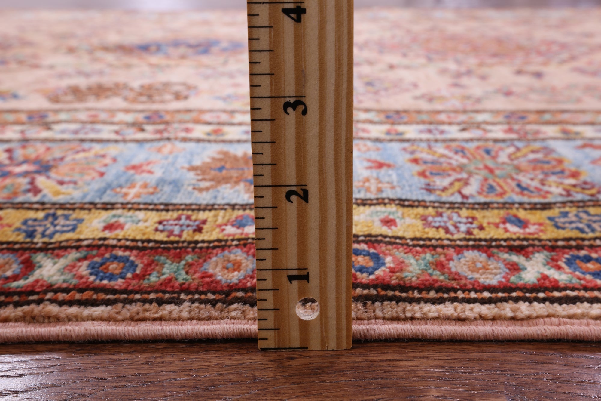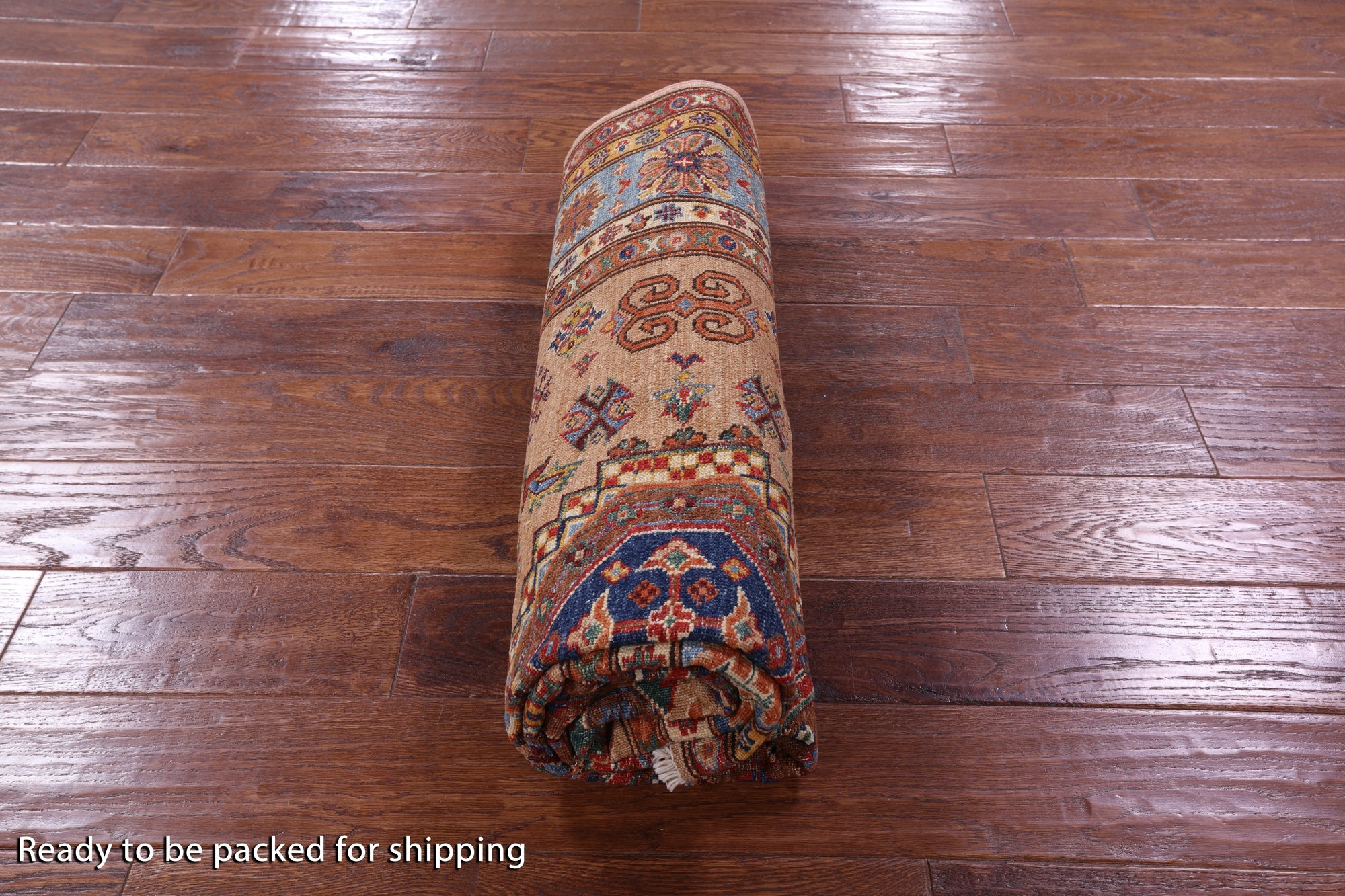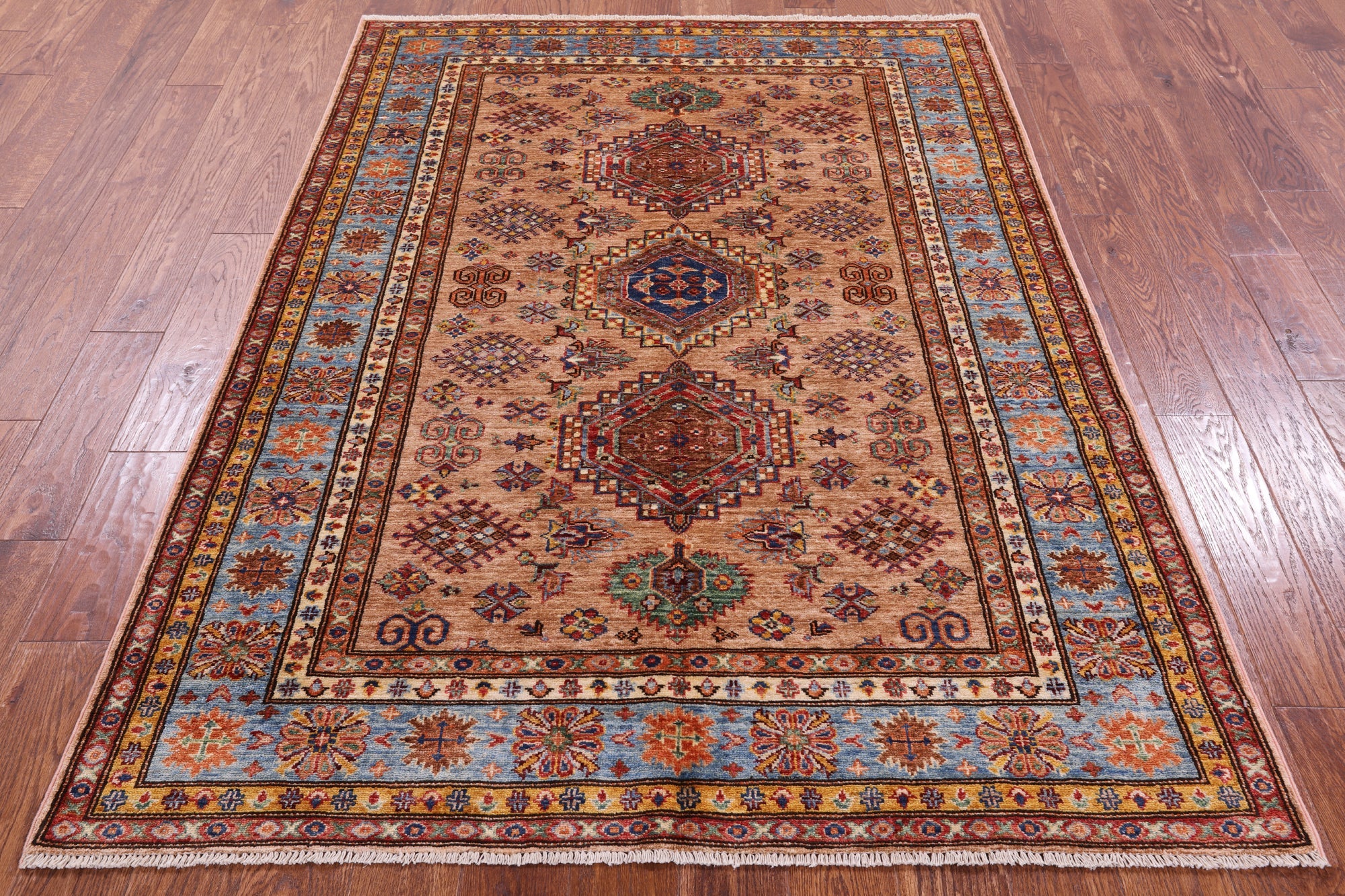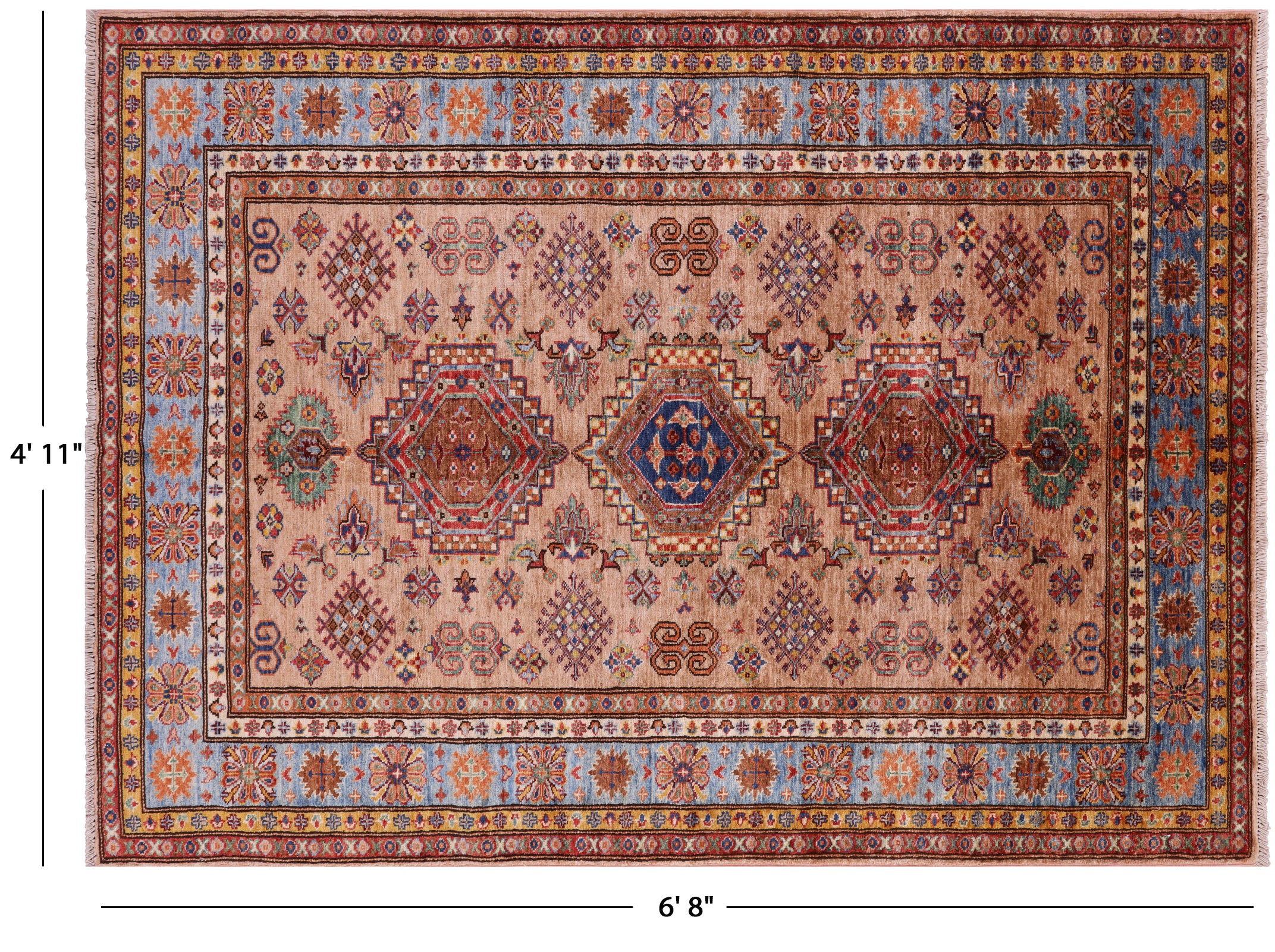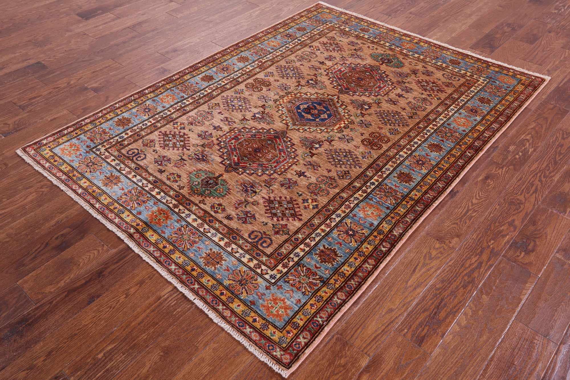 Super Kazak Geometric Hand-Knotted Wool Rug 4' 11" X 6' 8" - Q10619 is backordered and will ship as soon as it is back in stock.