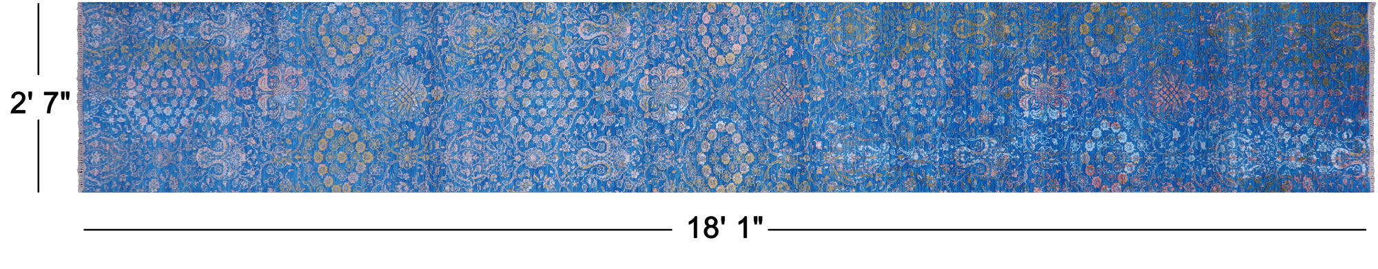 Blue 2' 7" X 18' 1" Runner Persian Tabriz Hand-Knotted Wool & Silk Rug - Q23477