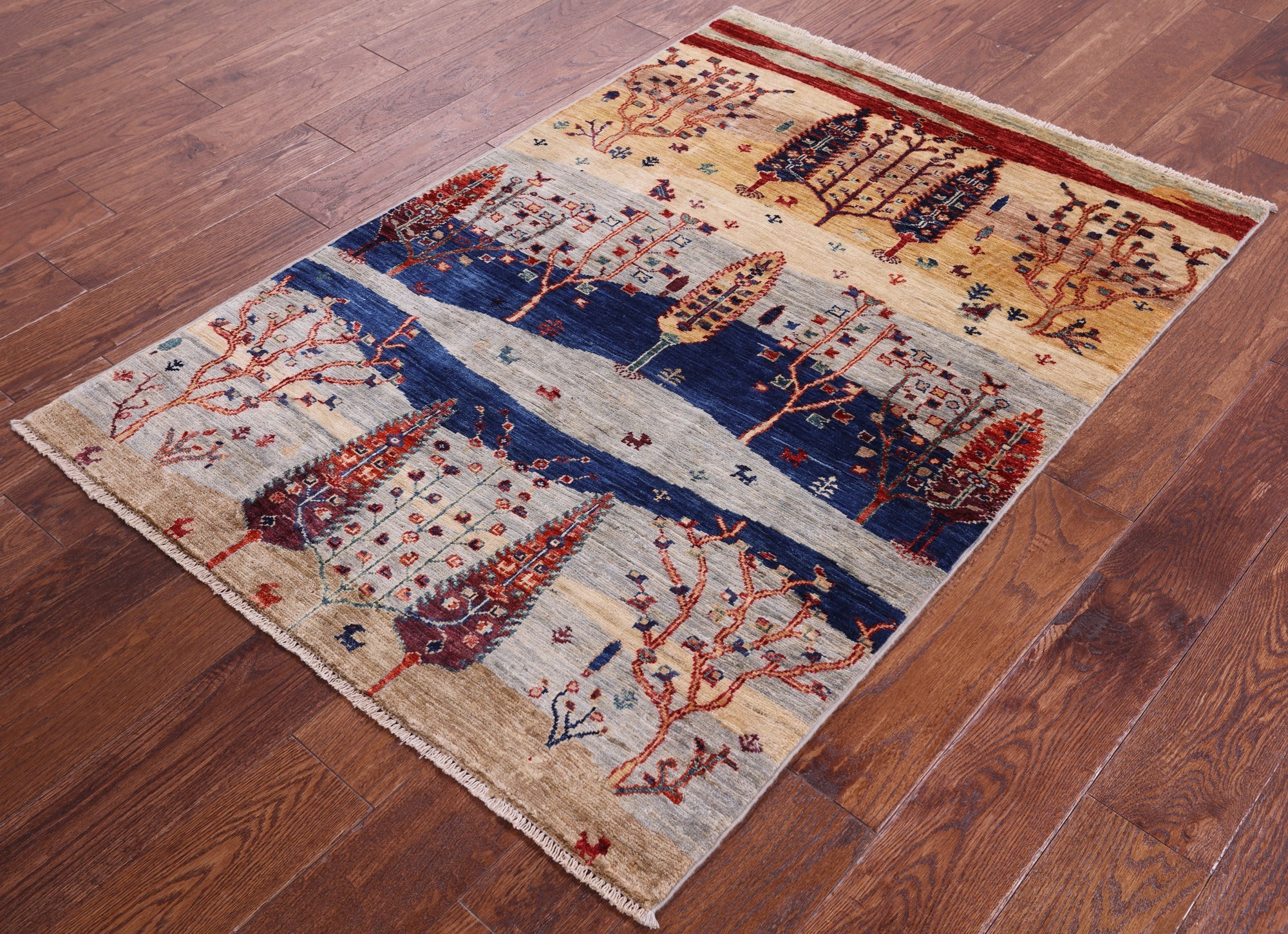 Gabbeh rugs are nothing short of simplistic and tribal, with designs consisting of primarily geometric shapes, animals, and plants. All done in a simplified way and based on the nomadic observation. Commonly brightly colored, these rugs are fun and beautiful and will add a warm touch to any home.