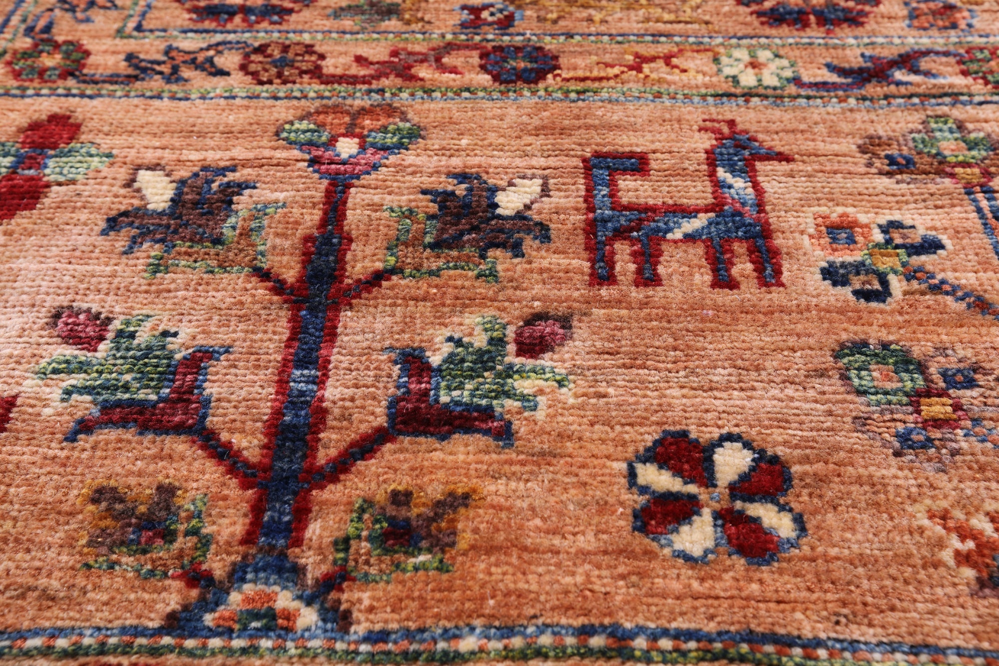 Gabbeh rugs are hand-spun wool in both the pile and the foundation, as well as all natural dyes. Simple, colorful geometric patterns, abstract scenery, child-like representations of people and animals, different colors, reds, blue, greens ,yellow, purple. Modern technology has improved the dye process to allow a wider range of colors as well as more stable and easier to care for colors.