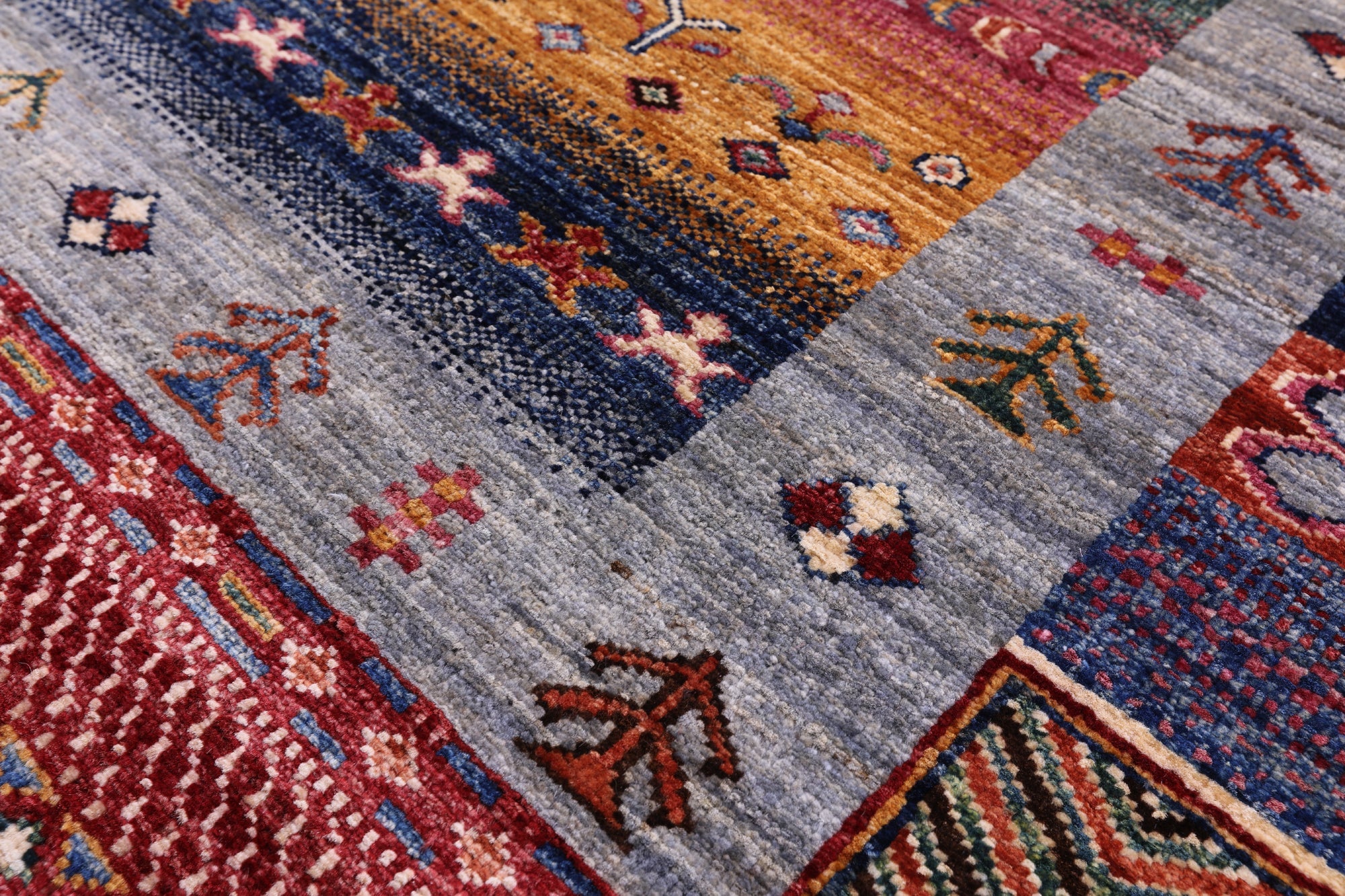 Gabbeh rugs are nothing short of simplistic and tribal, with designs consisting of primarily geometric shapes, animals, and plants. All done in a simplified way and based on the nomadic observation. Commonly brightly colored, these rugs are fun and beautiful and will add a warm touch to any home.