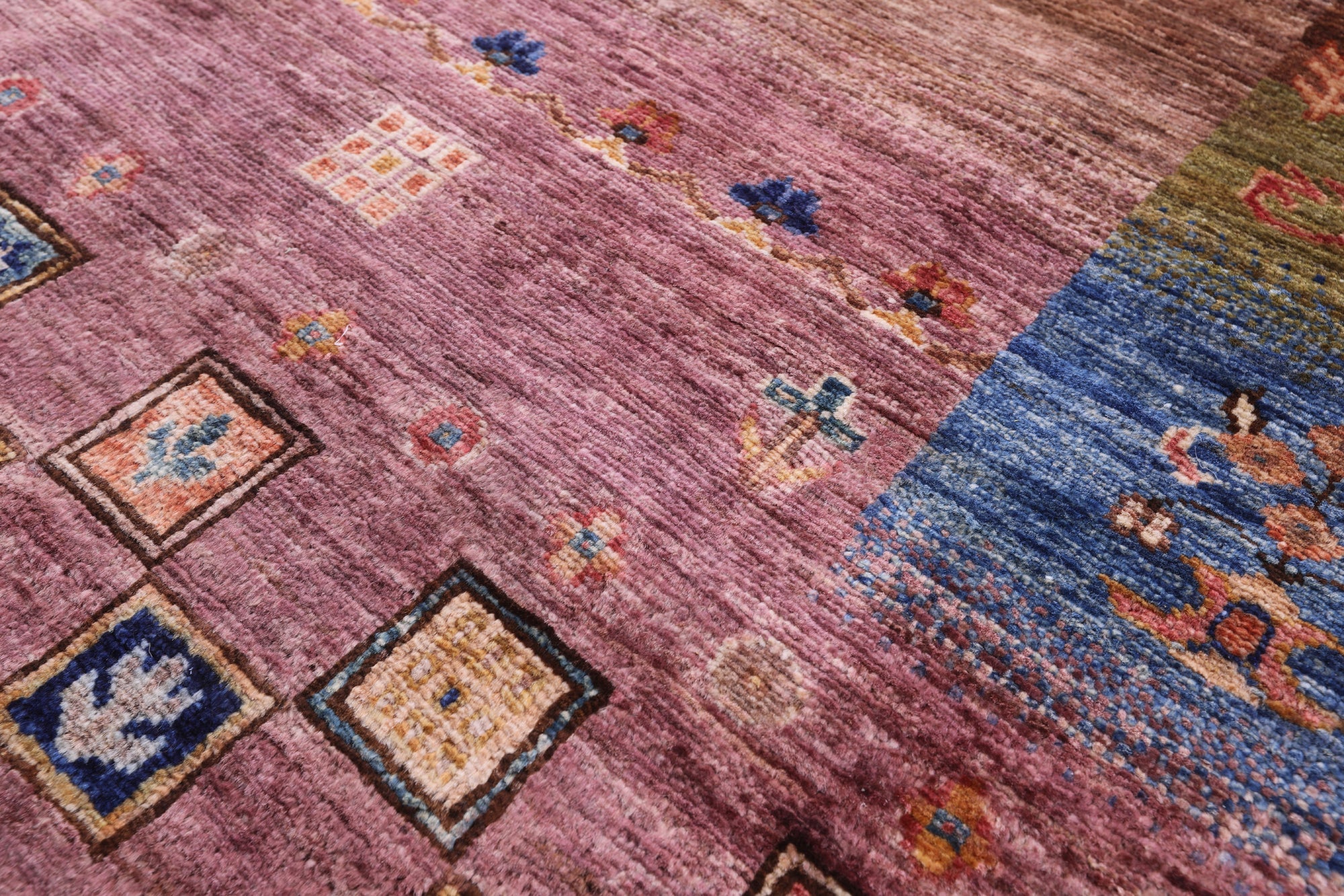 Gabbeh rugs are nothing short of simplistic and tribal, with designs consisting of primarily geometric shapes, animals, and plants. All done in a simplified way and based on the nomadic observation. Commonly brightly colored, these rugs are fun and beautiful and will add a warm touch to any home.
