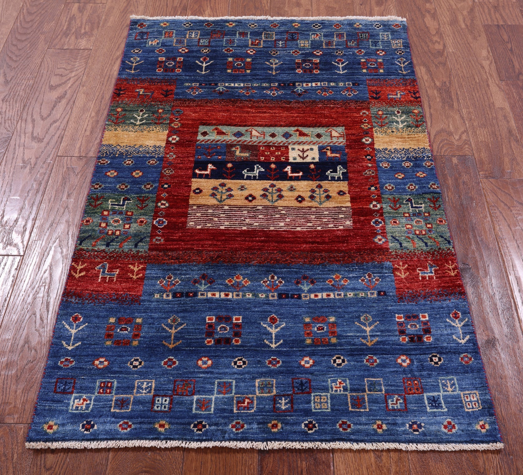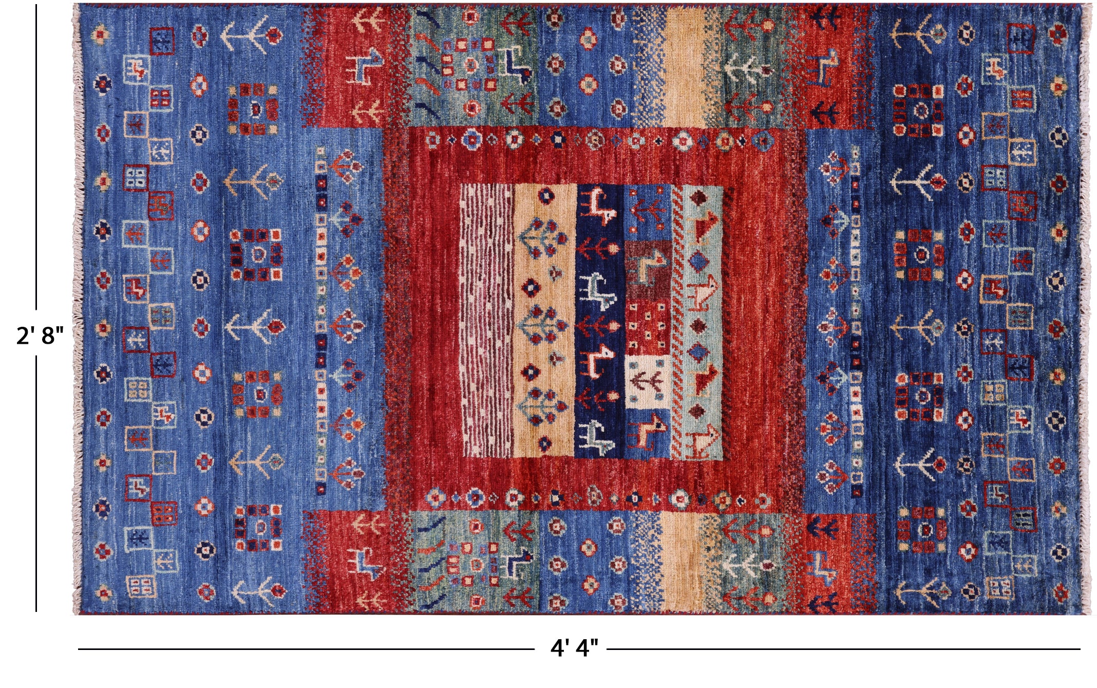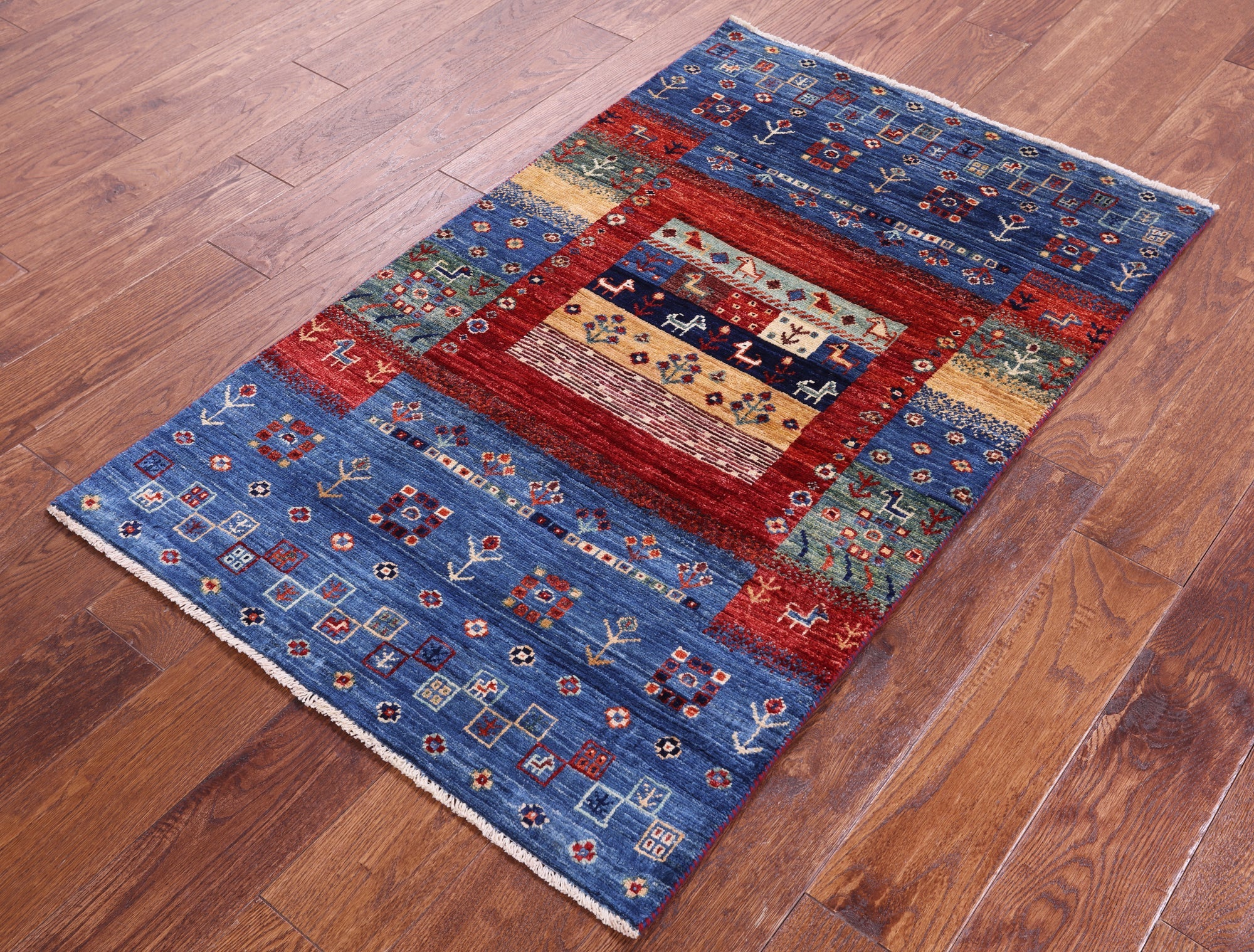 Gabbeh rugs are nothing short of simplistic and tribal, with designs consisting of primarily geometric shapes, animals, and plants. All done in a simplified way and based on the nomadic observation. Commonly brightly colored, these rugs are fun and beautiful and will add a warm touch to any home.