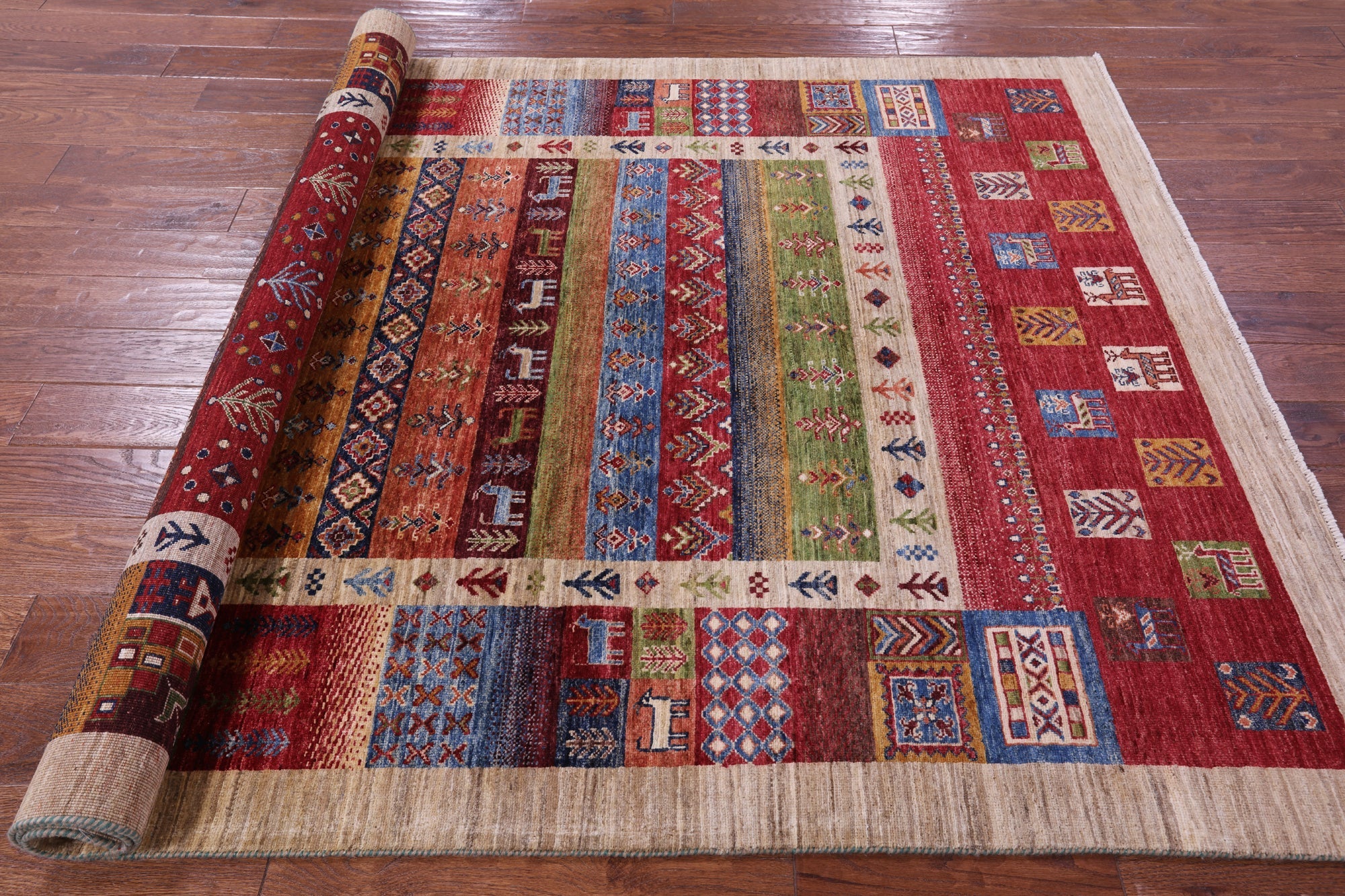 Gabbeh rugs are nothing short of simplistic and tribal, with designs consisting of primarily geometric shapes, animals, and plants. All done in a simplified way and based on the nomadic observation. Commonly brightly colored, these rugs are fun and beautiful and will add a warm touch to any home.
