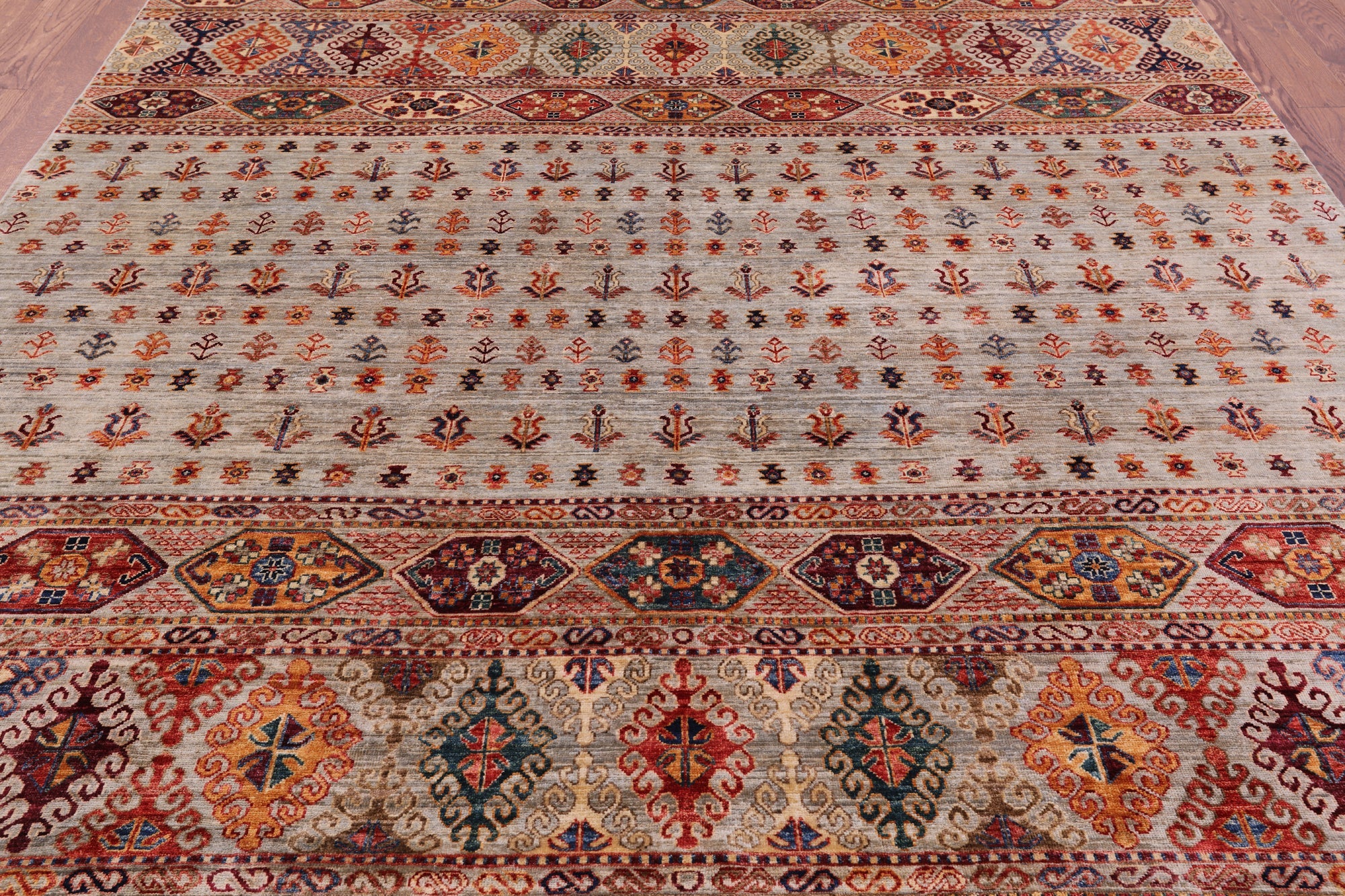 Gabbeh rugs are hand-spun wool in both the pile and the foundation, as well as all natural dyes. Simple, colorful geometric patterns, abstract scenery, child-like representations of people and animals, different colors, reds, blue, greens ,yellow, purple. Modern technology has improved the dye process to allow a wider range of colors as well as more stable and easier to care for colors.