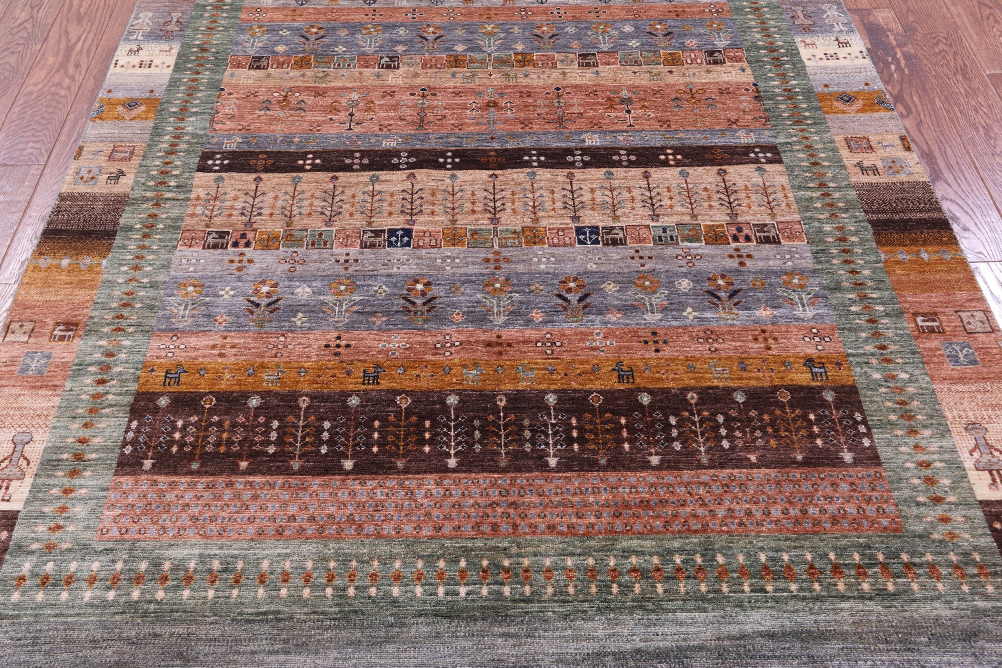 Gabbeh rugs are nothing short of simplistic and tribal, with designs consisting of primarily geometric shapes, animals, and plants. All done in a simplified way and based on the nomadic observation. Commonly brightly colored, these rugs are fun and beautiful and will add a warm touch to any home.