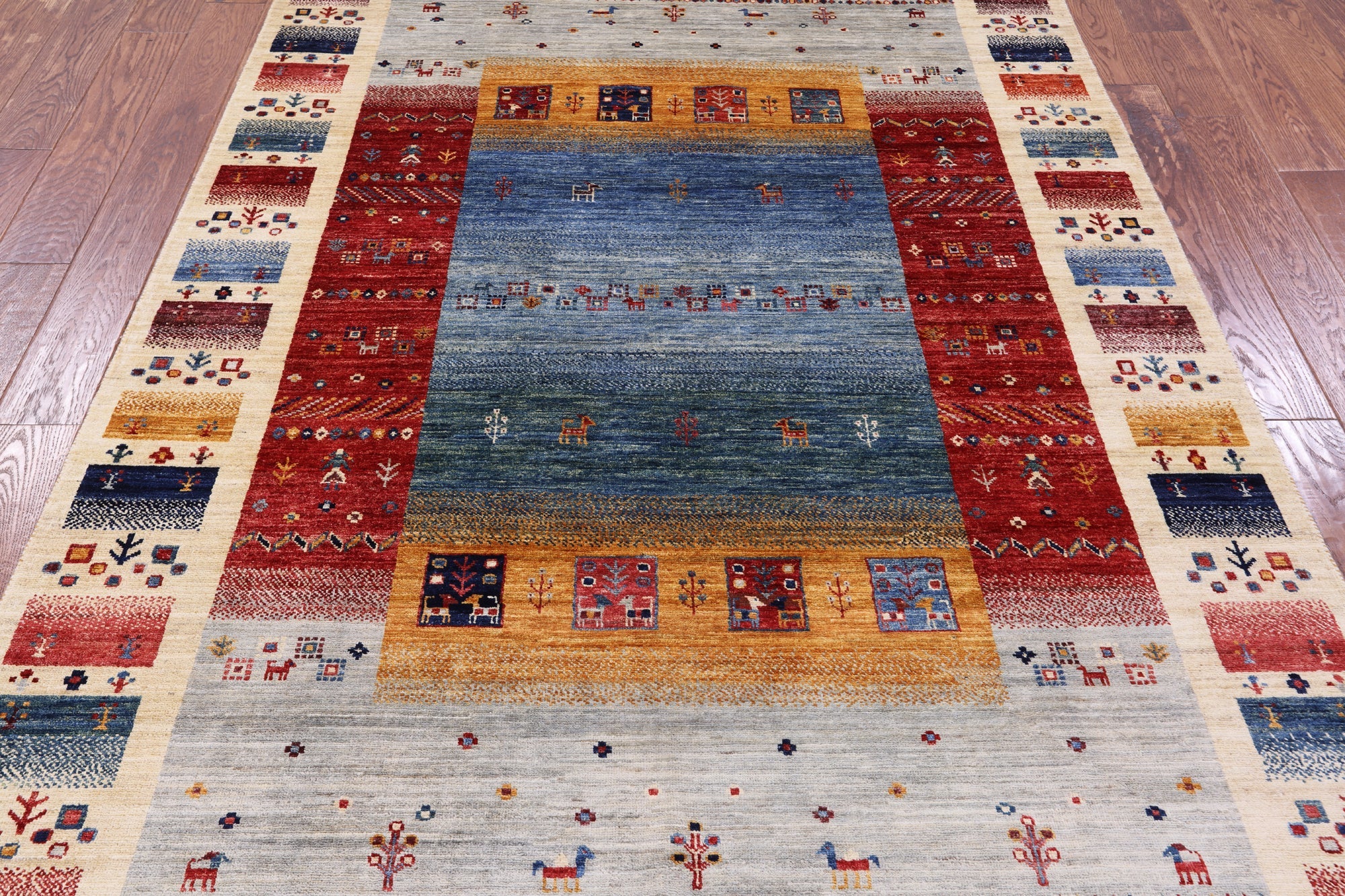 Gabbeh rugs are nothing short of simplistic and tribal, with designs consisting of primarily geometric shapes, animals, and plants. All done in a simplified way and based on the nomadic observation. Commonly brightly colored, these rugs are fun and beautiful and will add a warm touch to any home.