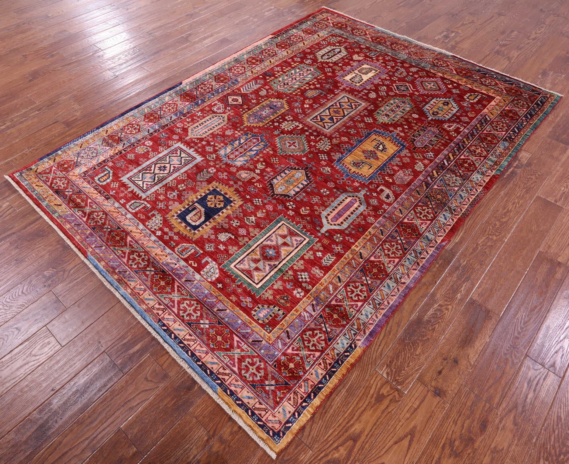 Red 6' 1" X 8' 6" Hand-Knotted Tribal Fine Serapi Wool Rug - Q17239
