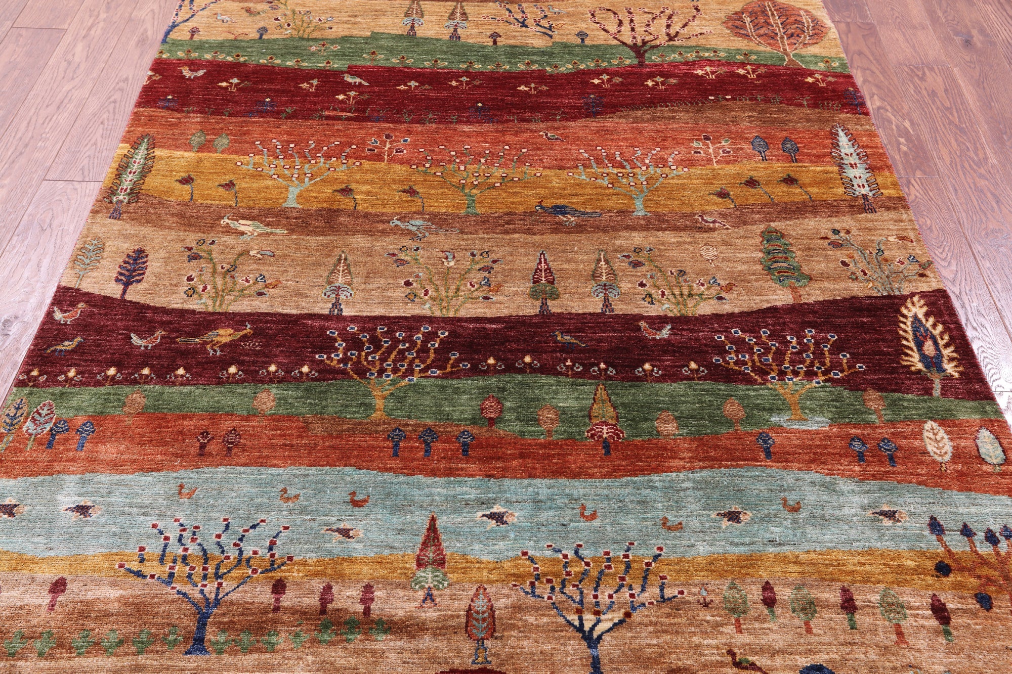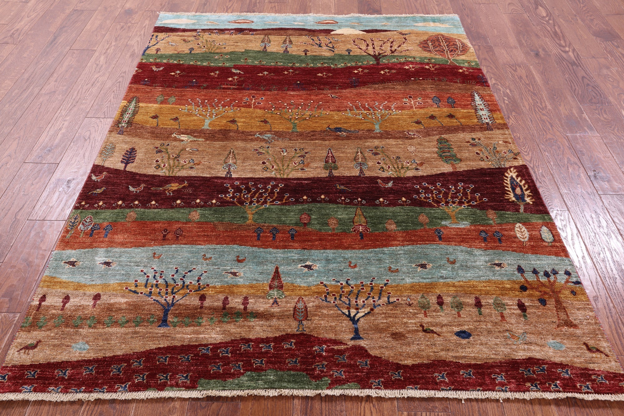 Gabbeh rugs are nothing short of simplistic and tribal, with designs consisting of primarily geometric shapes, animals, and plants. All done in a simplified way and based on the nomadic observation. Commonly brightly colored, these rugs are fun and beautiful and will add a warm touch to any home.