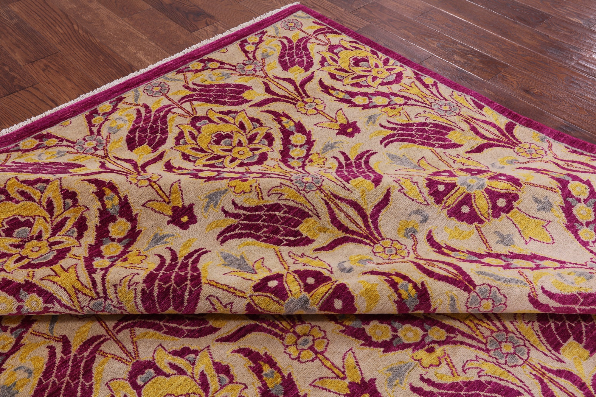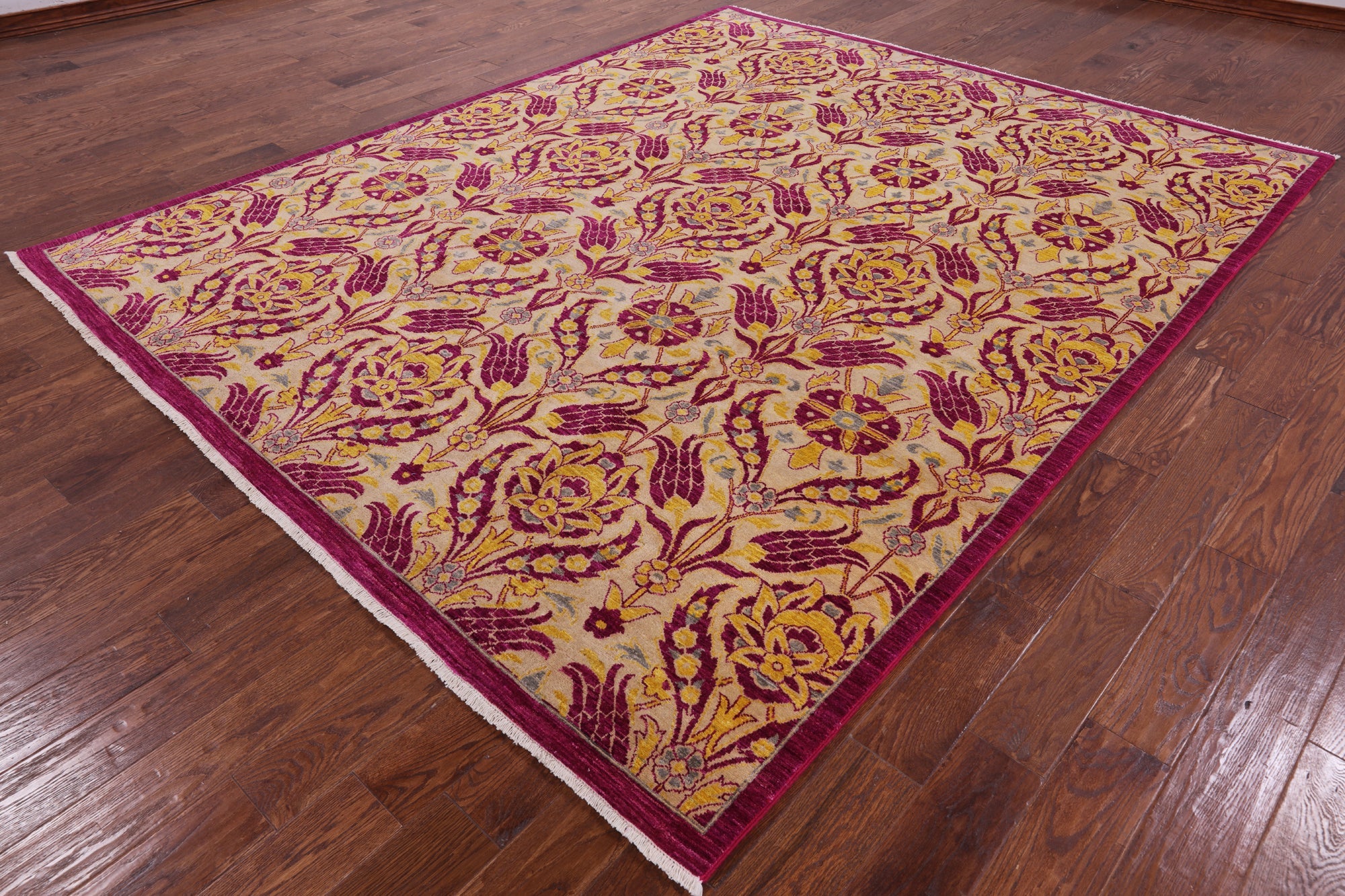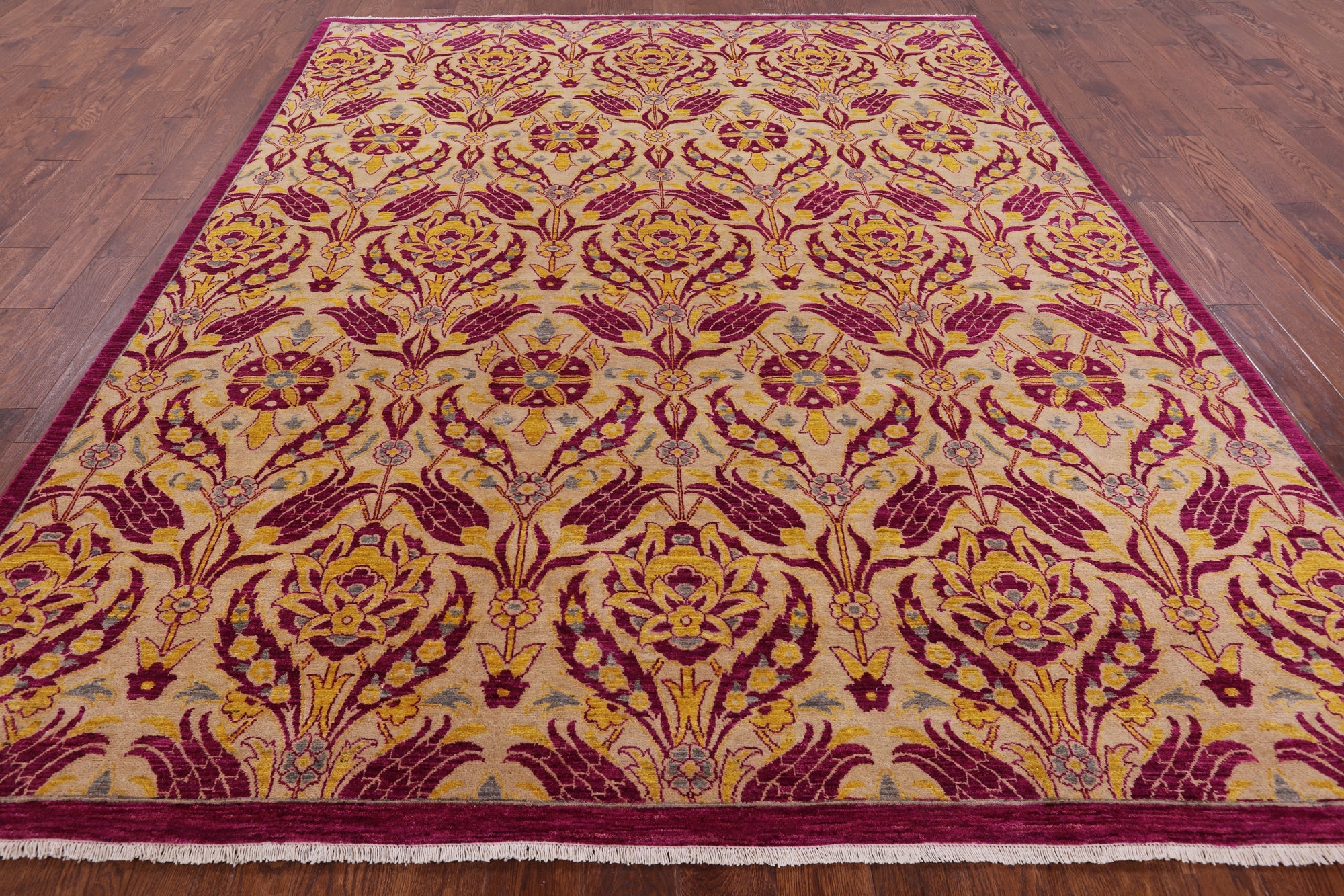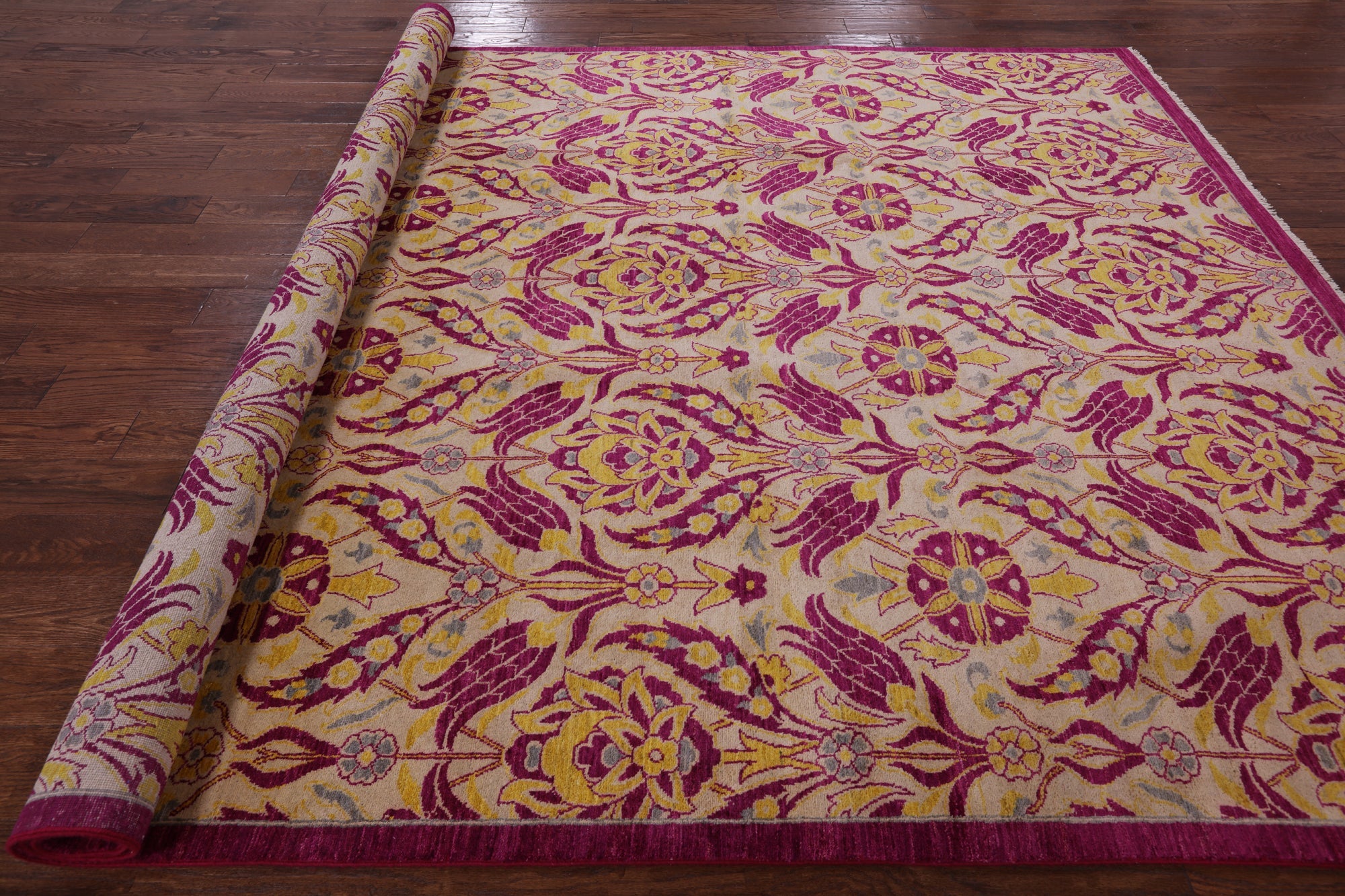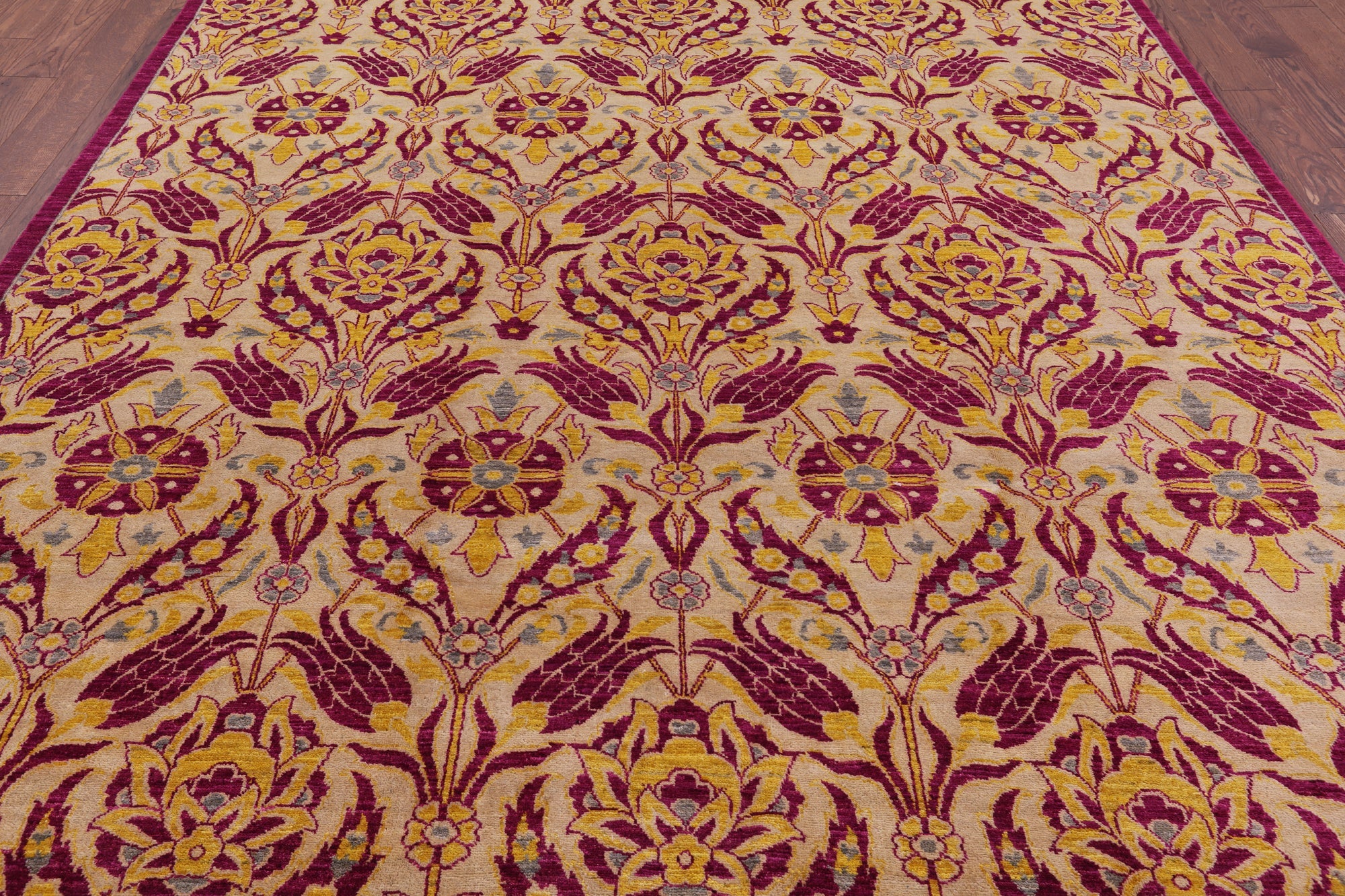 William Morris design are part of arts and crafts movement often including natural forms. These 19th and early 20th century designs are distinctive for their stylized natural forms, their symmetry and their vibrant colors. William Morris patterns are based on nature such thistles, ginkgo leaves, willow trees and flowers. These modern hand knotted rugs are woven with high quality wool, silk or both.
