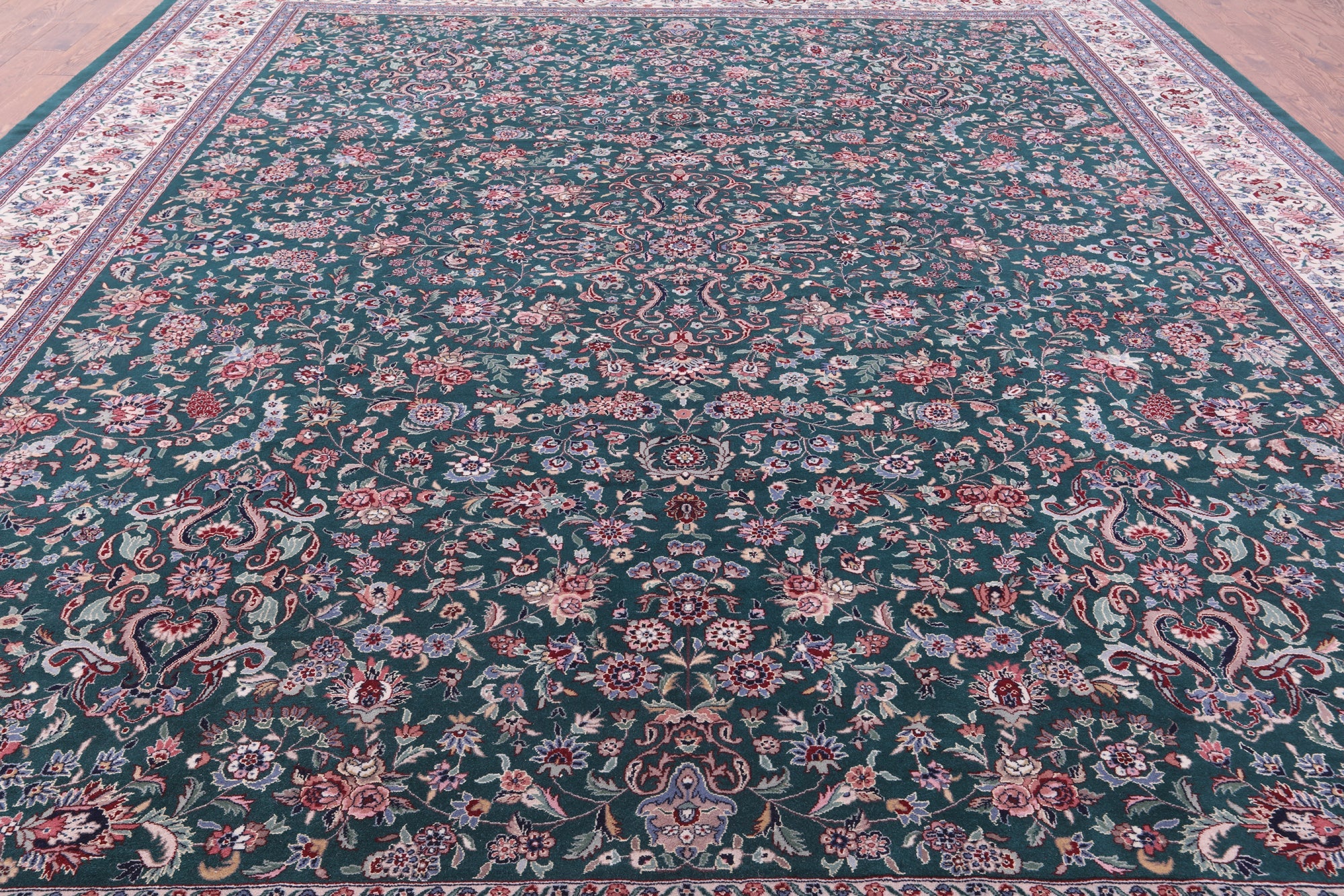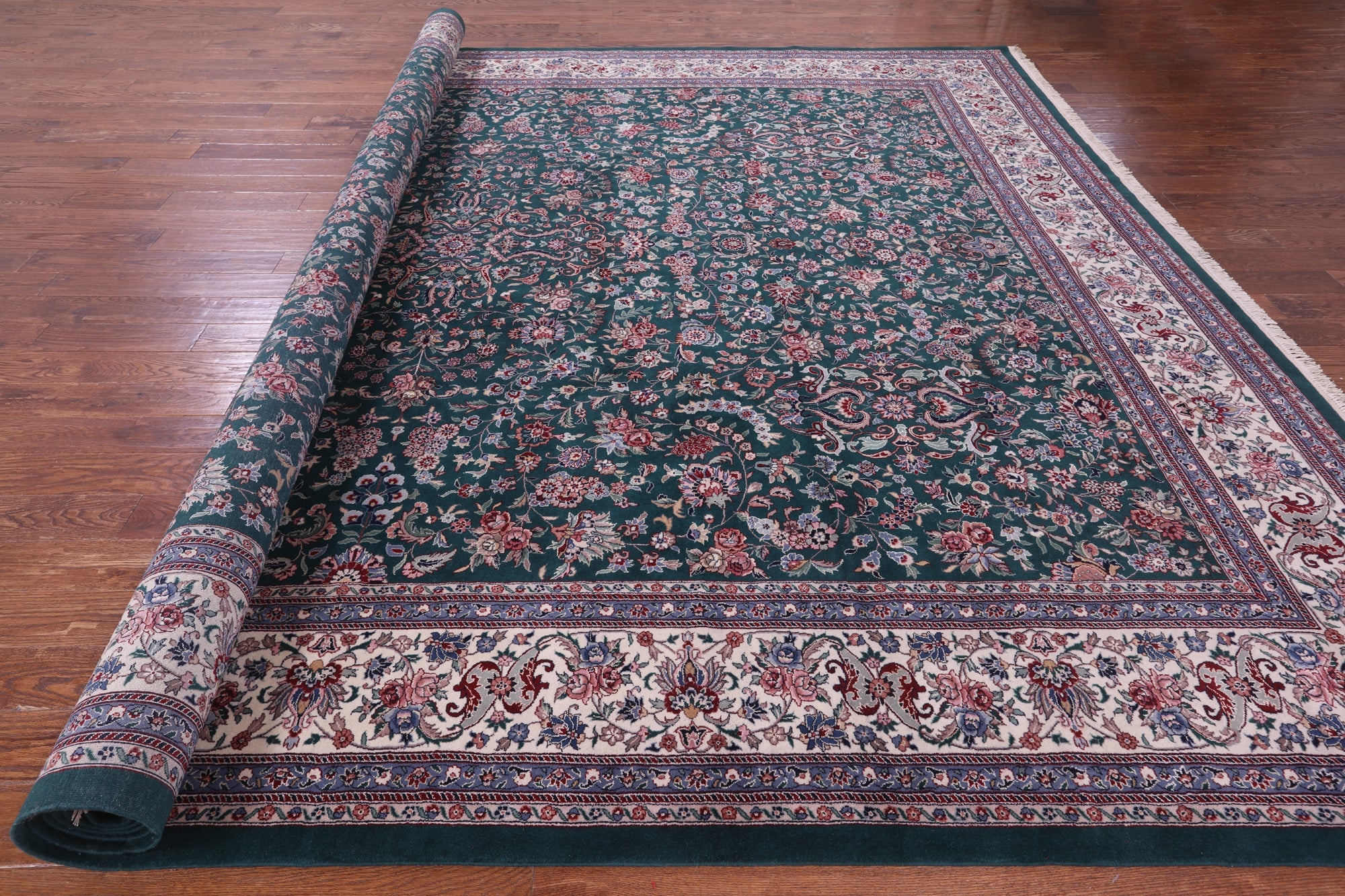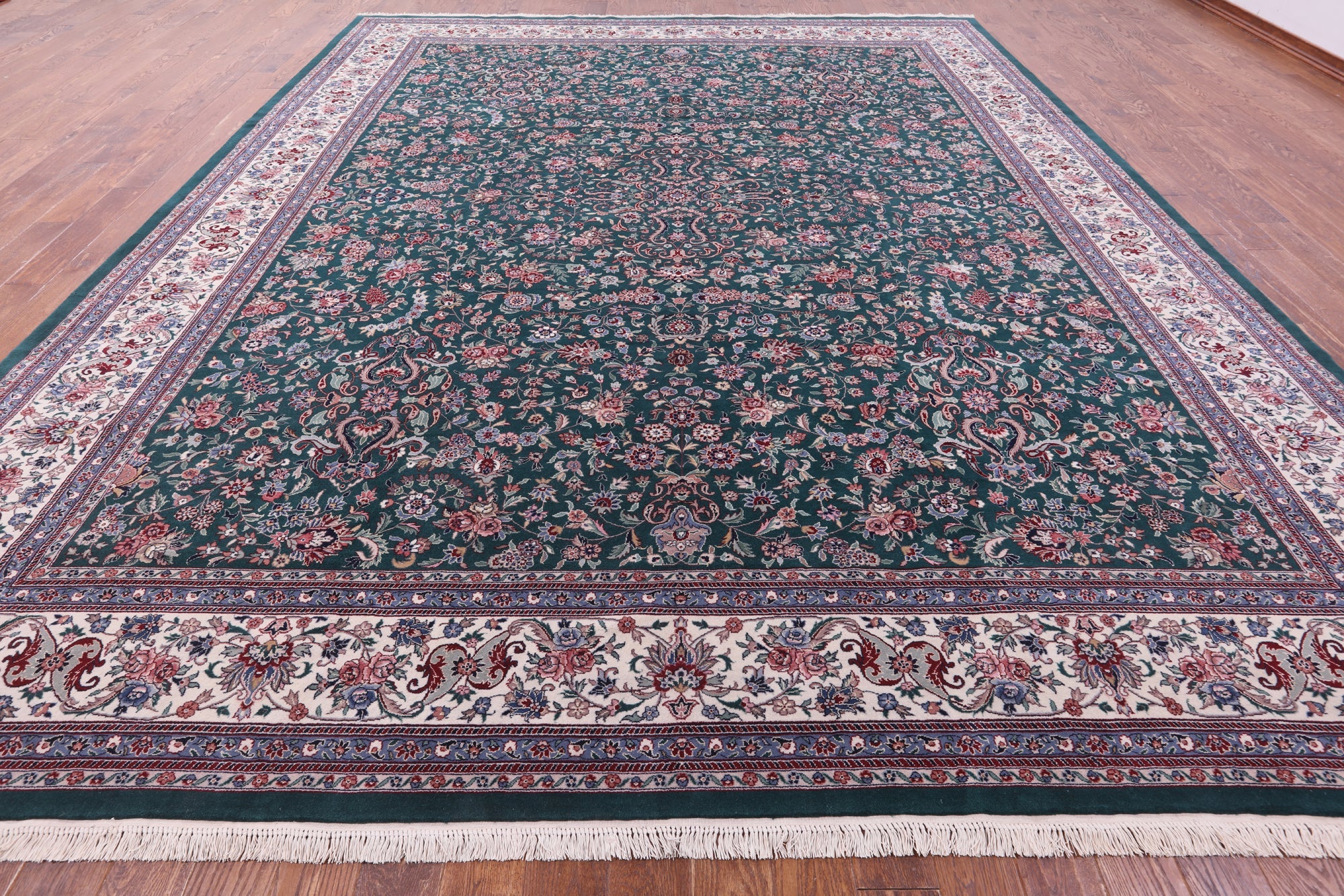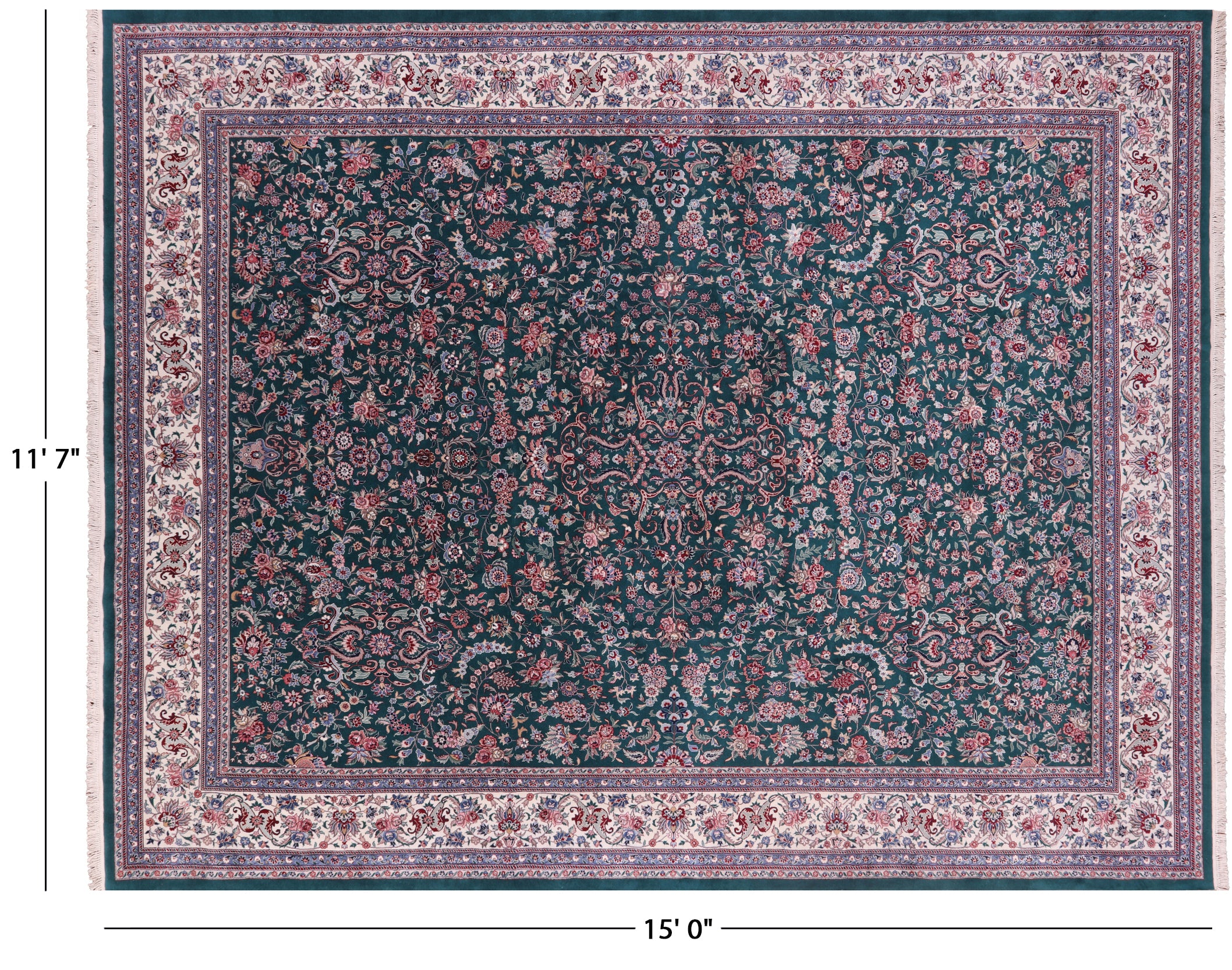 Green Fine Persian Kashan Hand Knotted Wool & Silk Rug 11' 7" X 15' 0" - Q19405 is backordered and will ship as soon as it is back in stock.