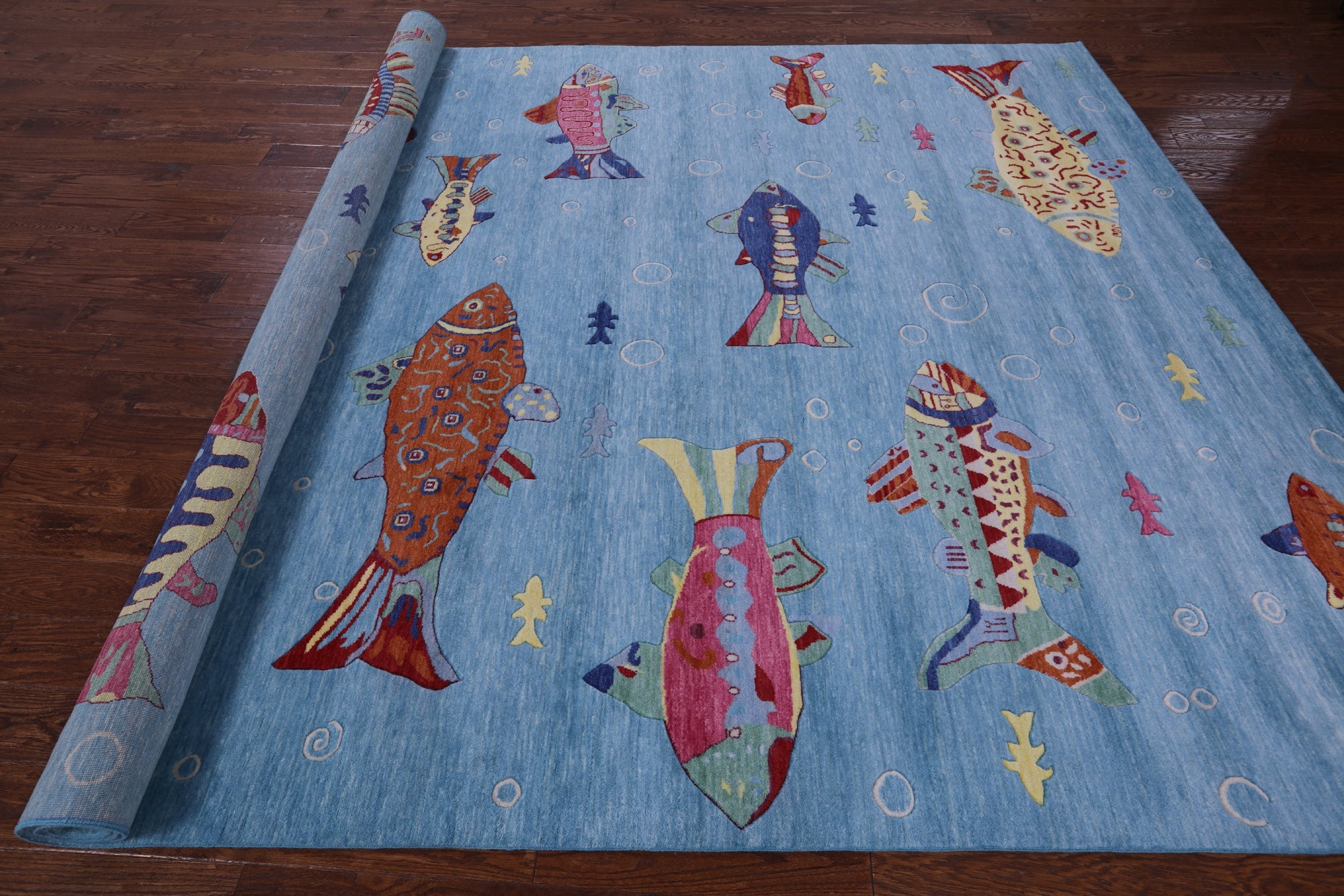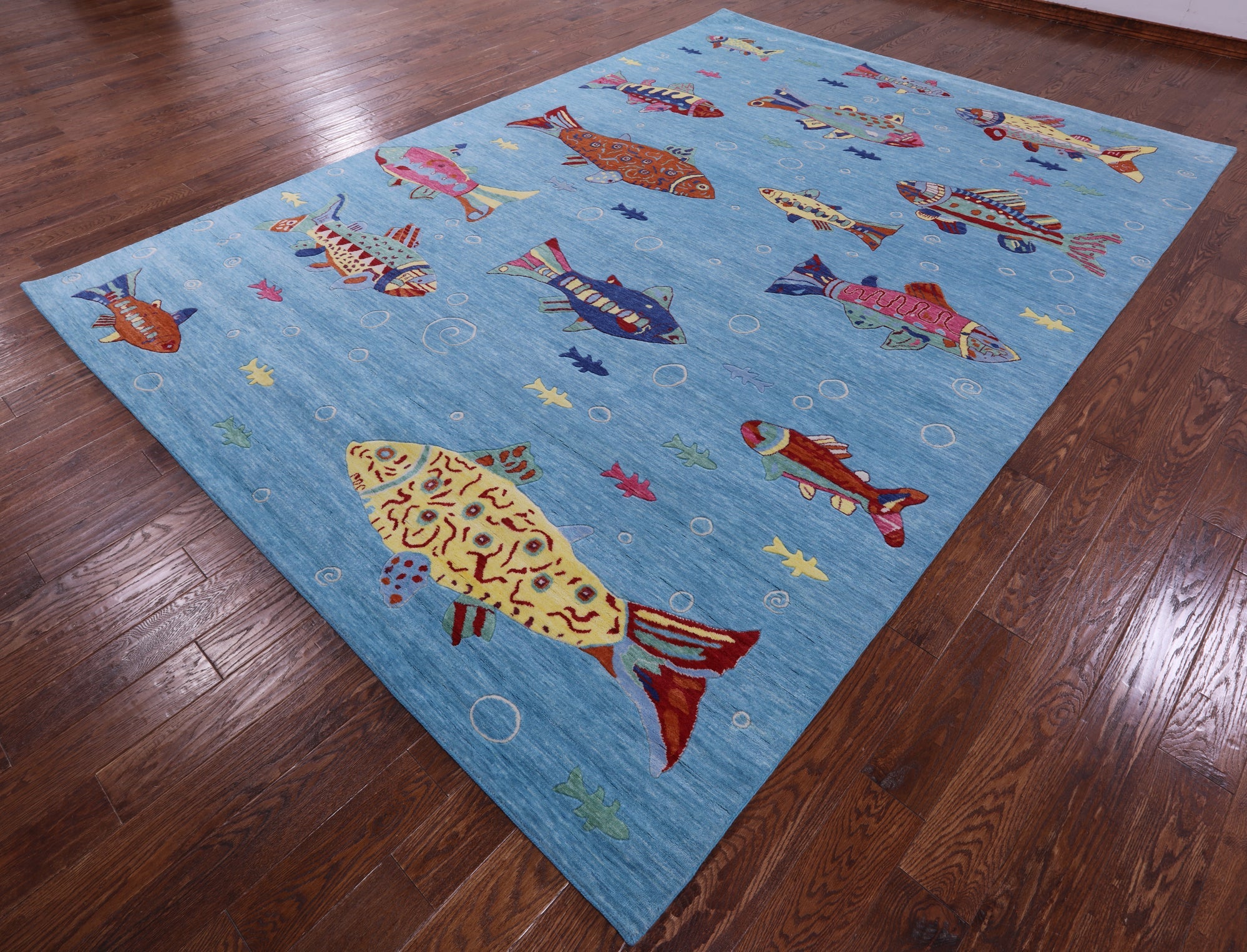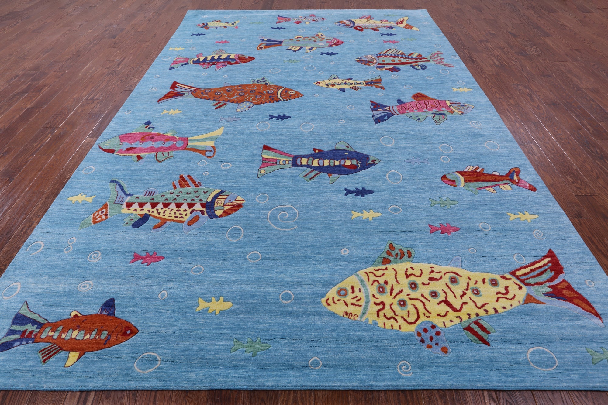 Blue 8' 11" X 12' 5" Gabbeh Fish Design Handmade Wool Rug - Q15559