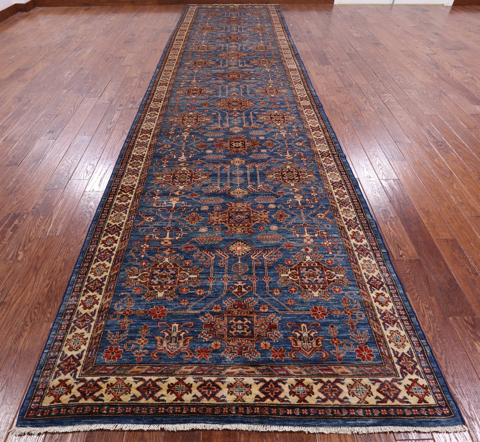 Blue 4' 10" X 19' 3" Hand Knotted Wool Super Kazak Rug - P10024 is backordered and will ship as soon as it is back in stock.