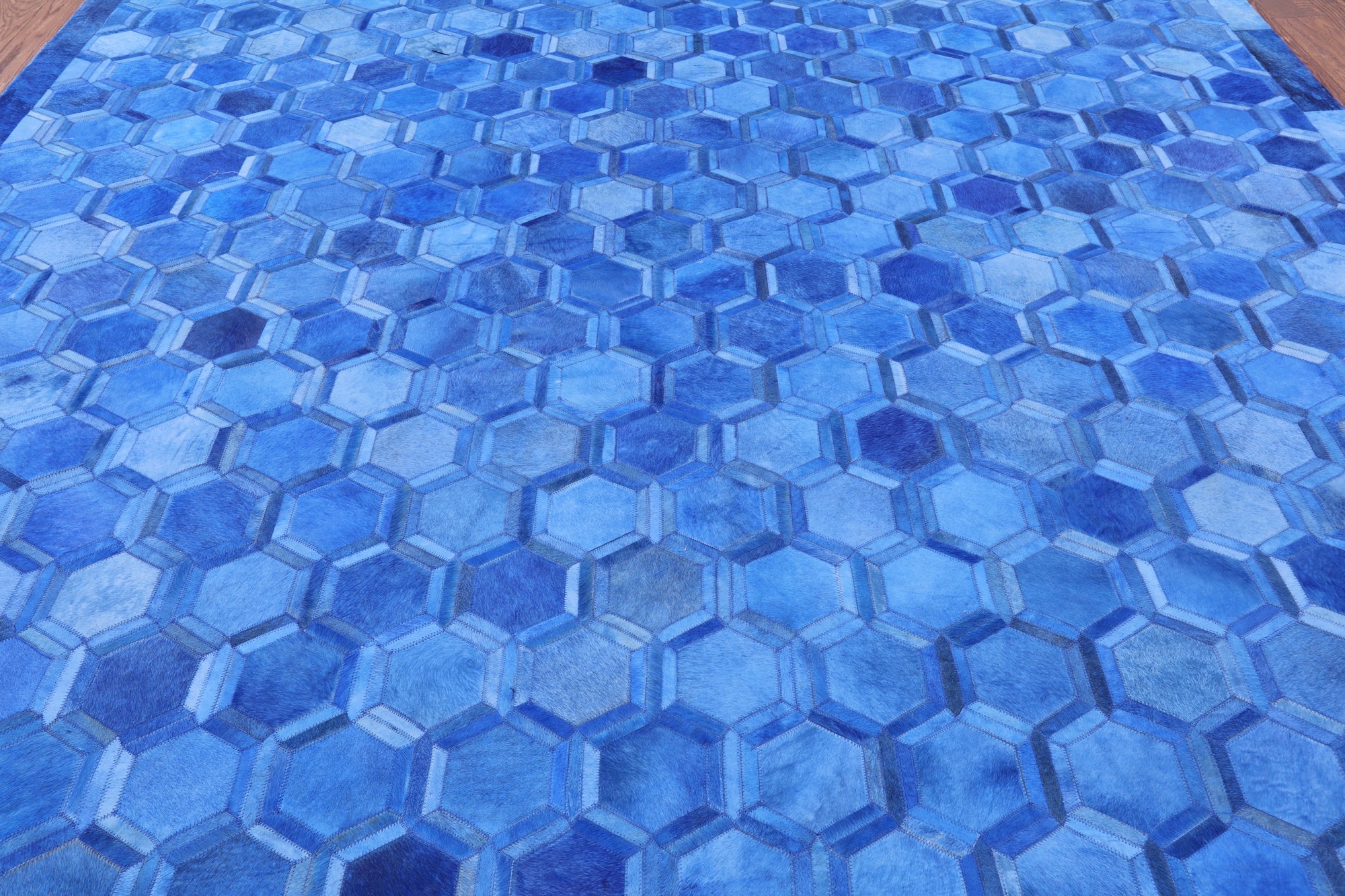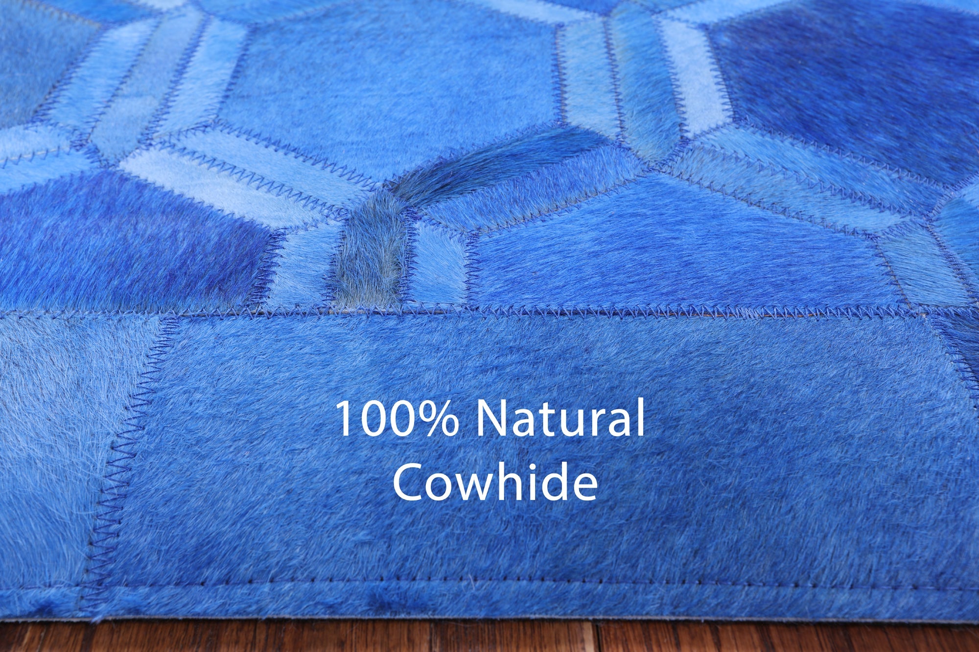 Blue 10' Square Overdyed Natural Cowhide Hand Stitched Rug - C1271 is backordered and will ship as soon as it is back in stock.