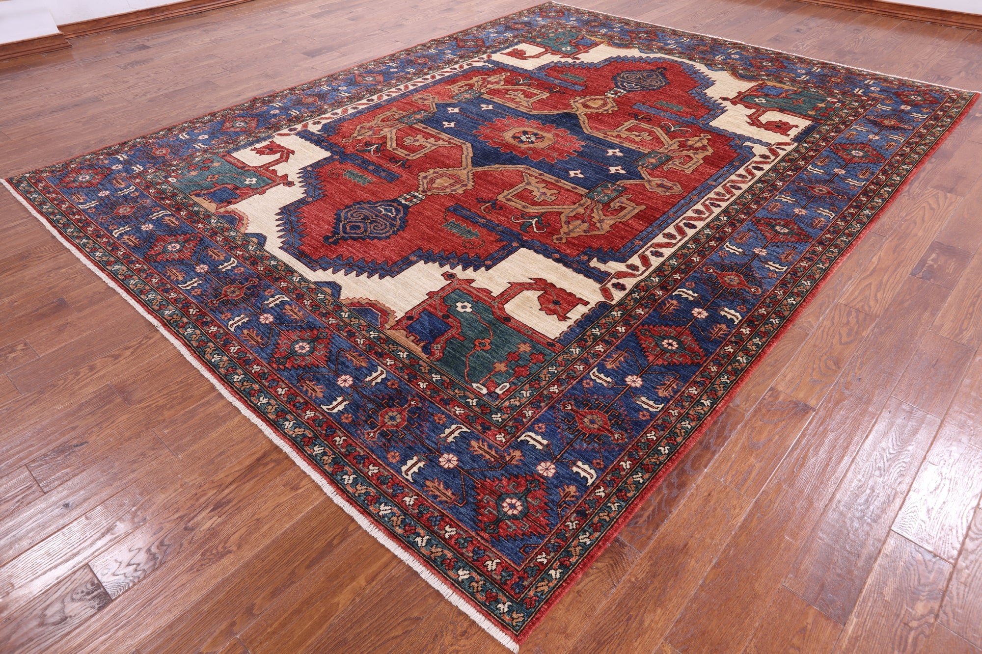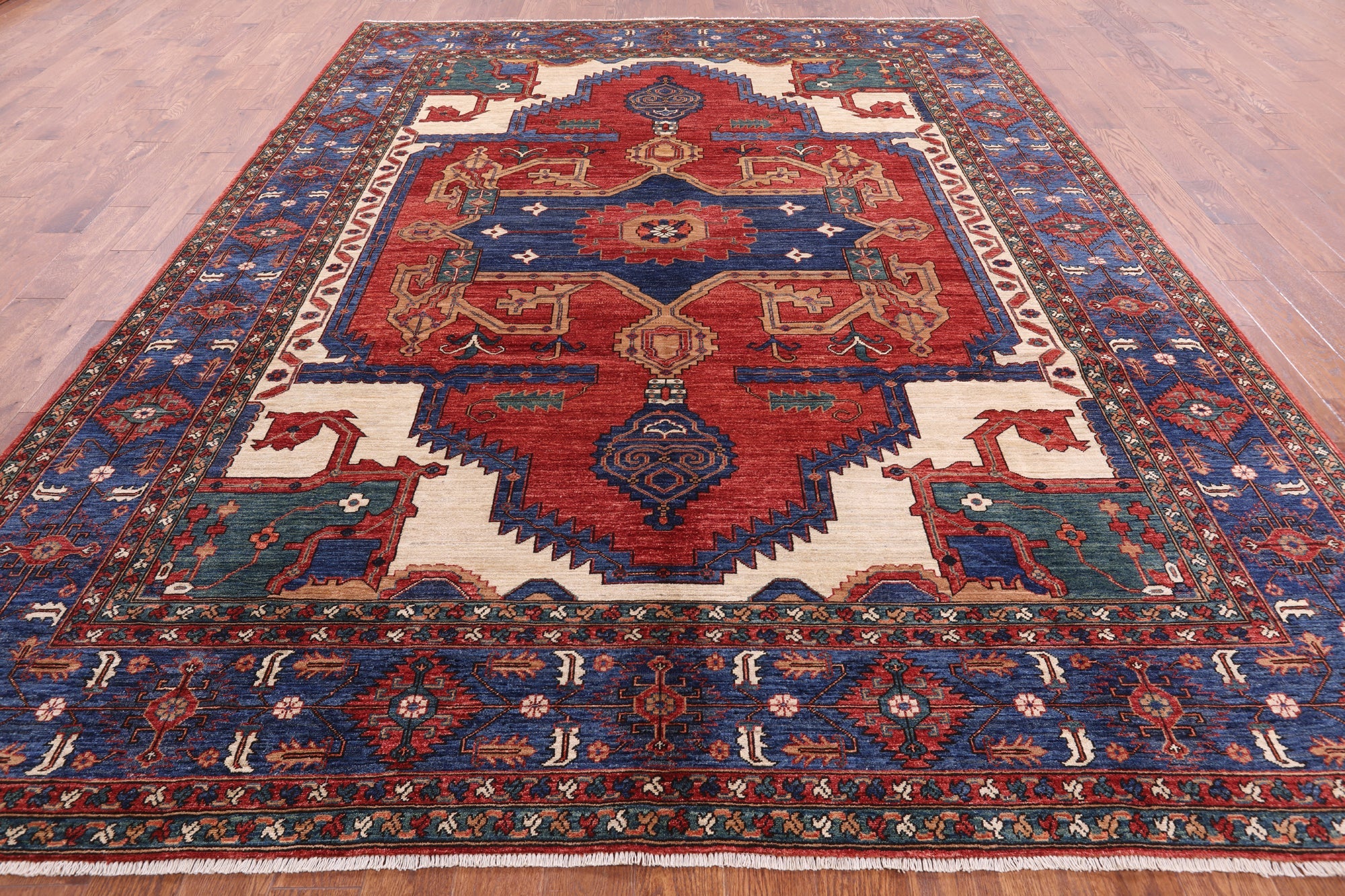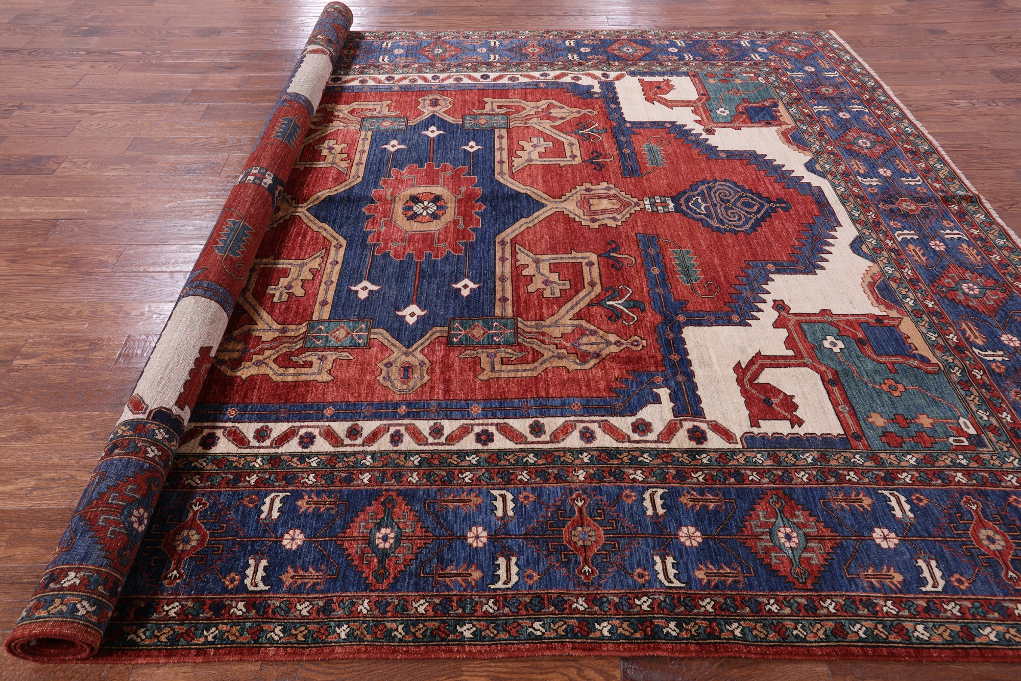 Heriz, Serapi rugs are well known for their bold and angular designs. Many being symmetric, they withhold boldly done geometric and floral-inspired shapes. These shapes are brought out with rich reds, blues, greens, and yellows contrasted against ivory. Heriz, Serapi rugs are very elegant and durable, perfect for a variety of different rooms and spaces within a home.