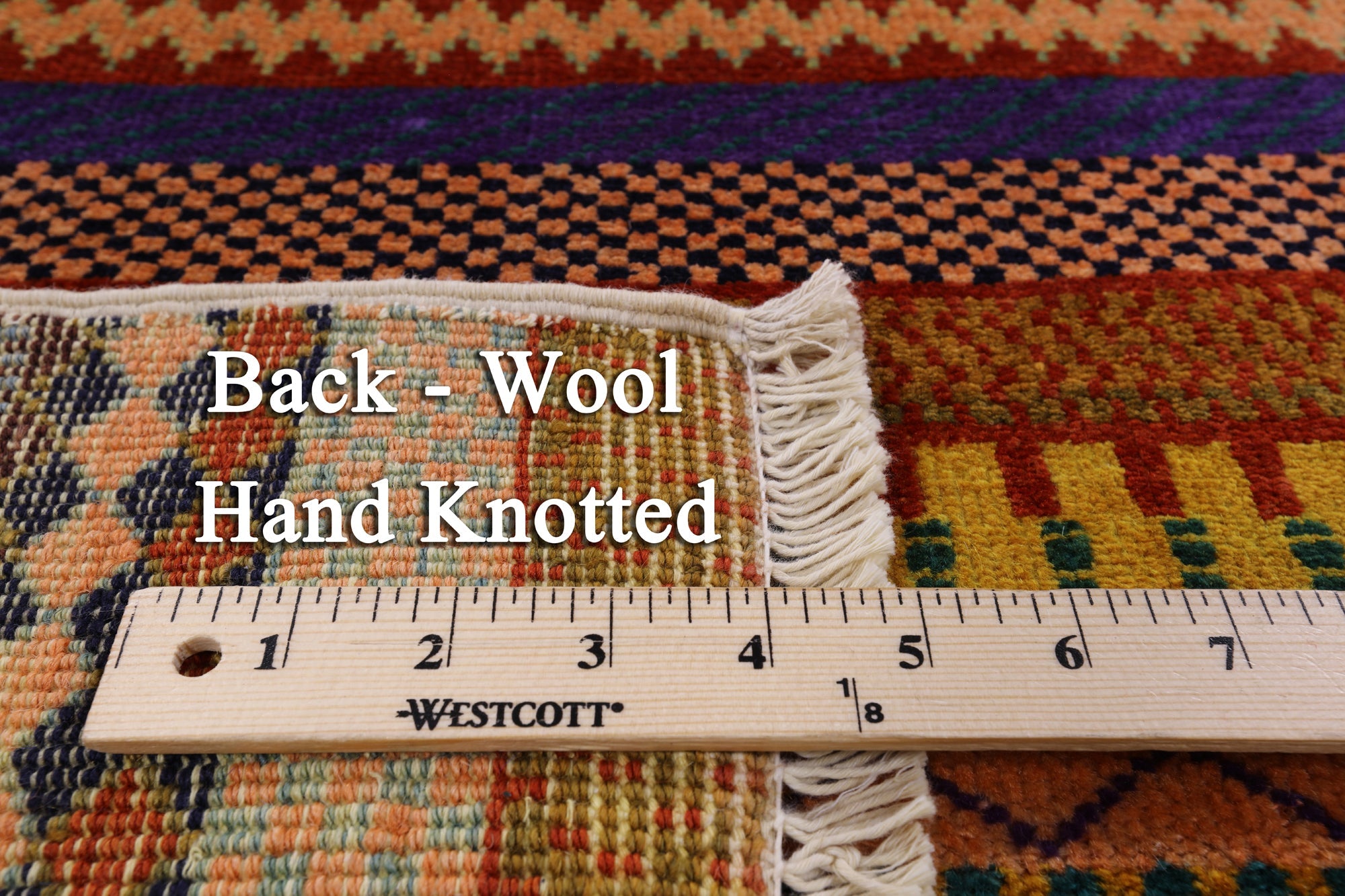 Gabbeh rugs are hand knotted to reflect tribal and other patterns such as solids, and nomadic designs. The simplistic "child-like" bold designs of Gabbeh rugs is what makes them perfectly suitable for any decor. Gabbeh rugs are made from high-quality wool and have a high density of knots. Gabbeh rugs are hand-knotted and eco-friendly, because only natural dyes are used in their production.