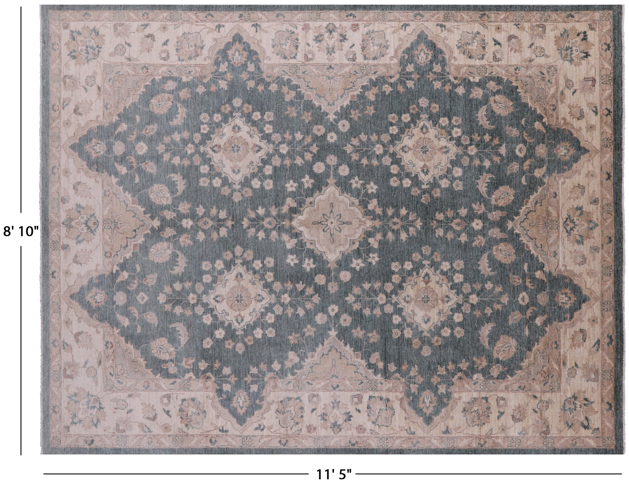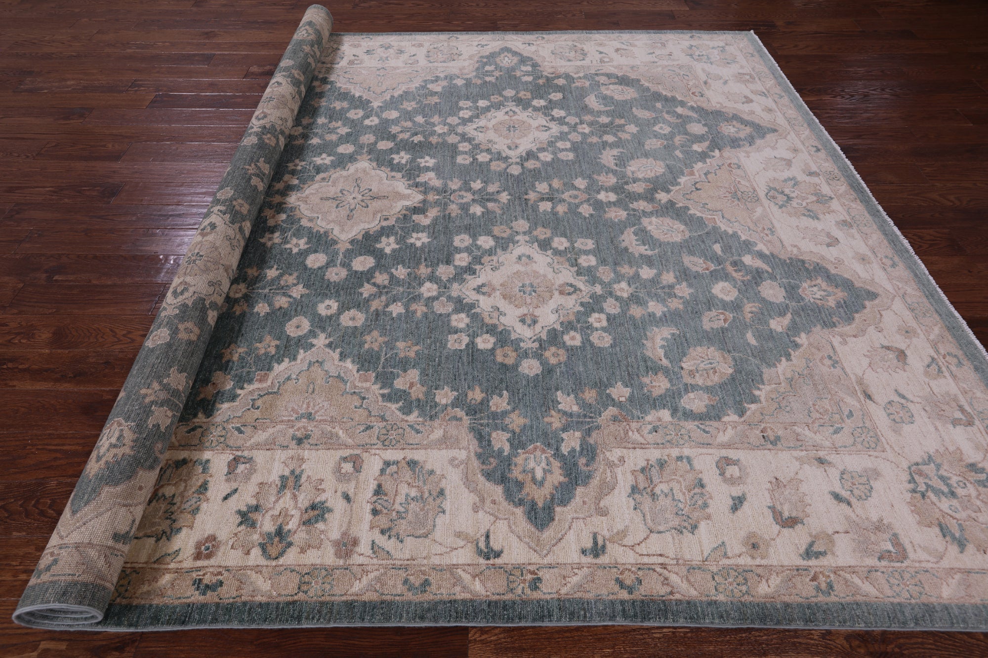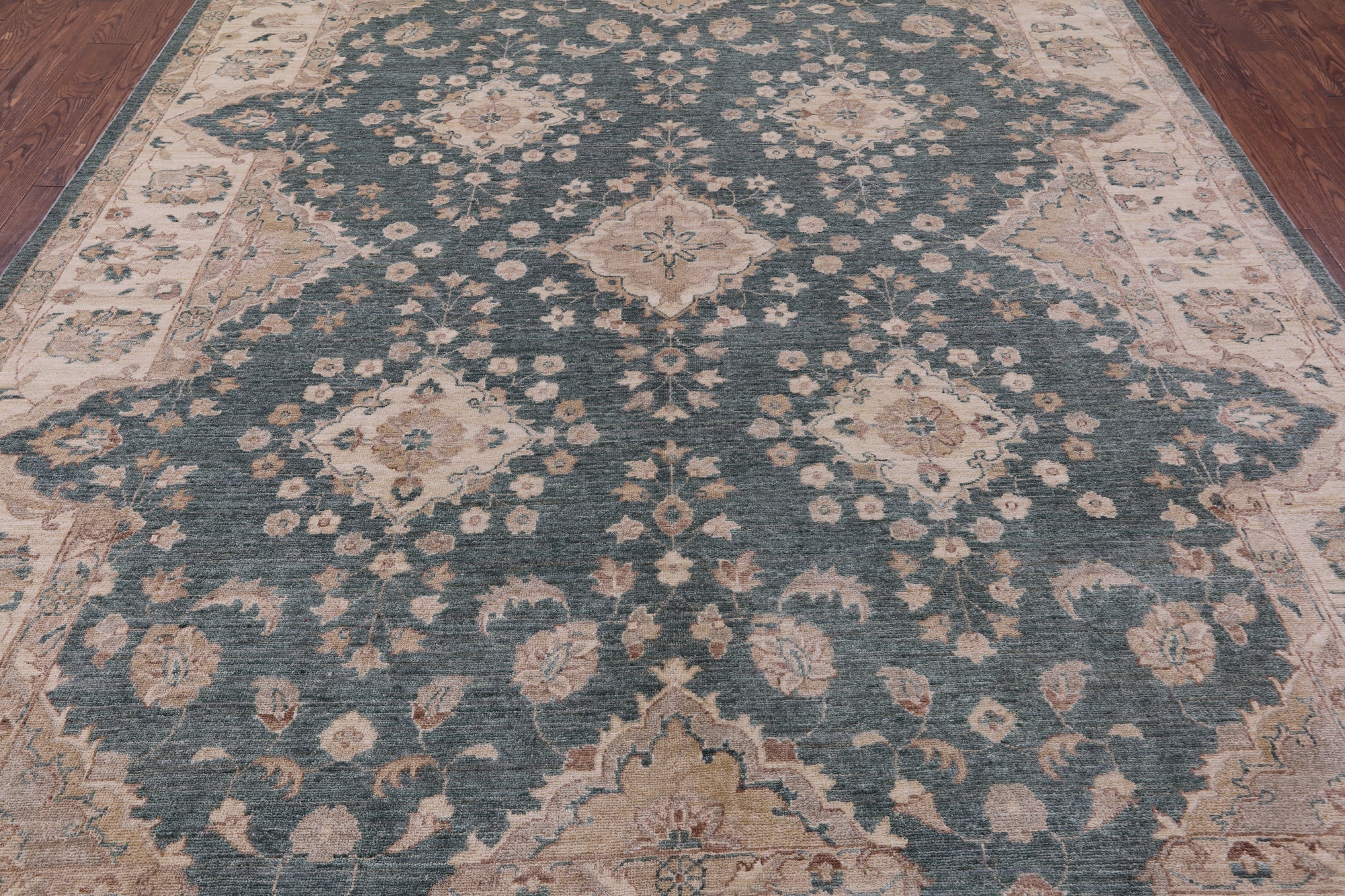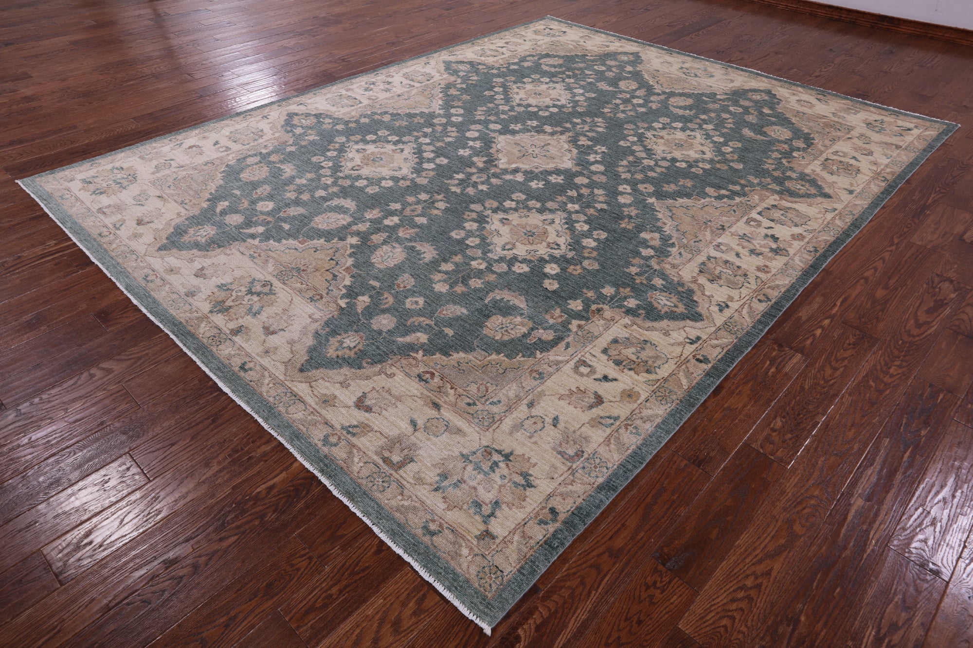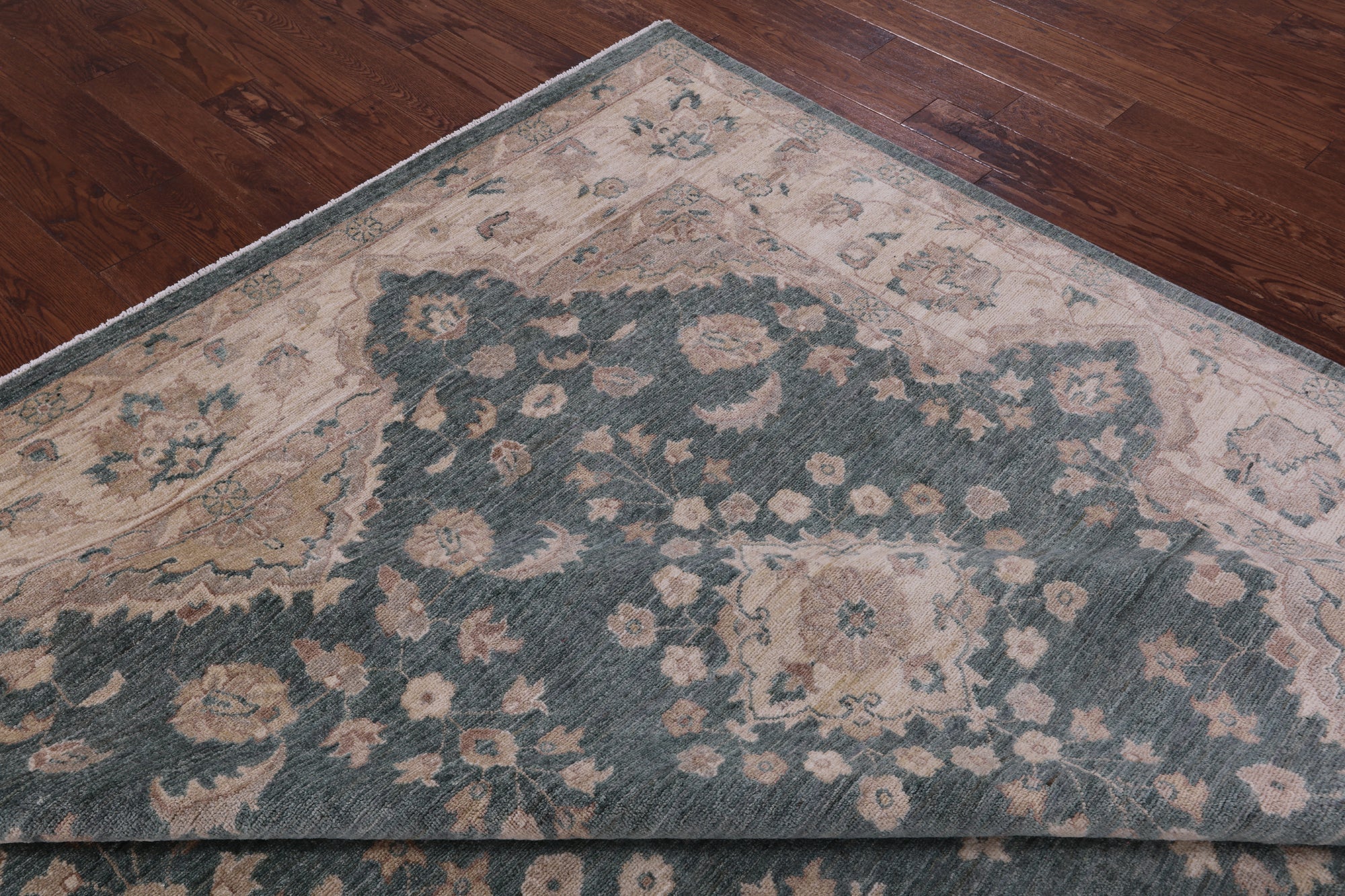 Green Handmade Turkish Oushak Wool Rug 8' 10" X 11' 5" - Q11383 is backordered and will ship as soon as it is back in stock.