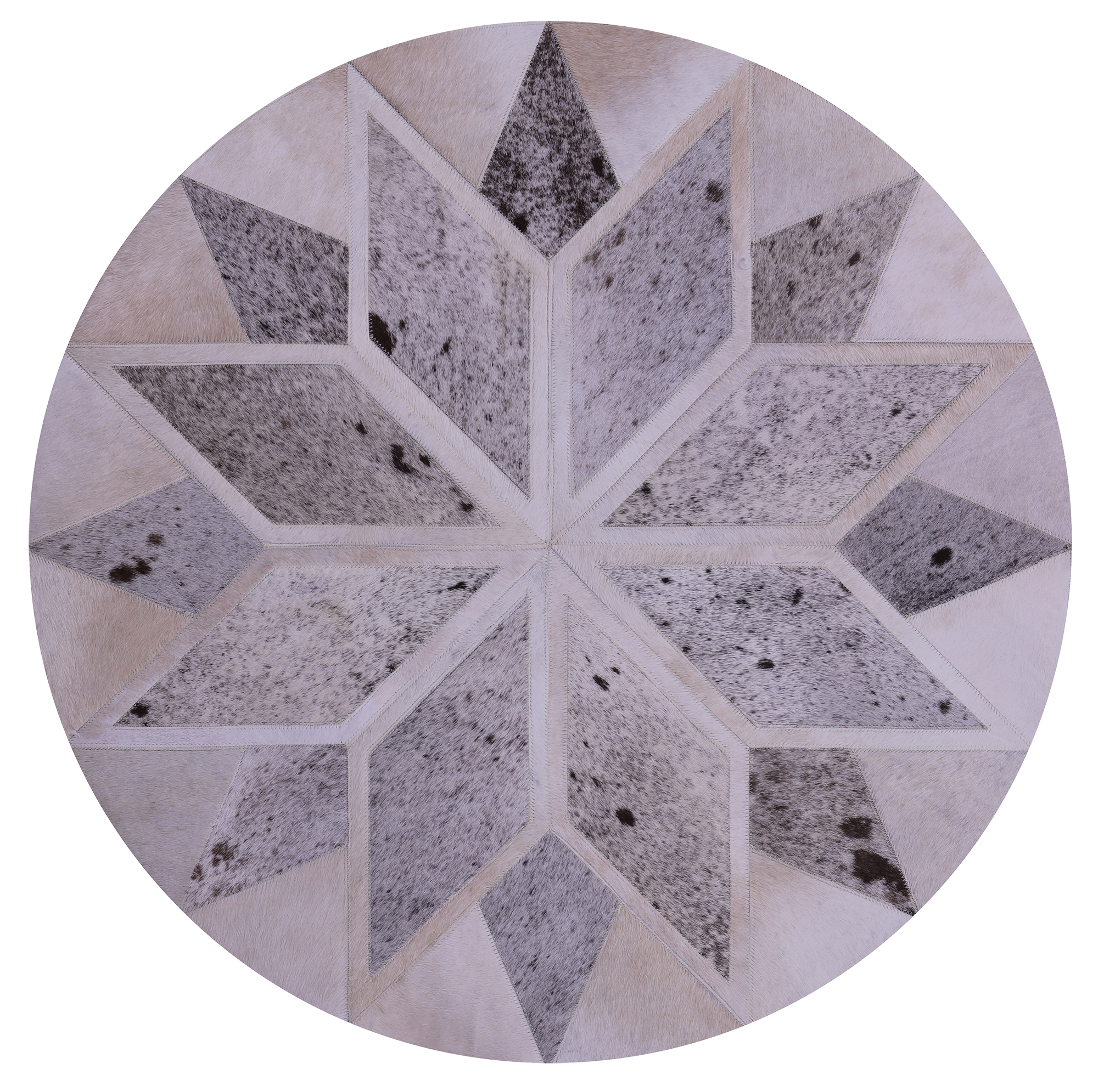 3' 3" X 3' 3" Grey Round Star Natural Cowhide Hand Stitched Rug - C3496 is backordered and will ship as soon as it is back in stock.