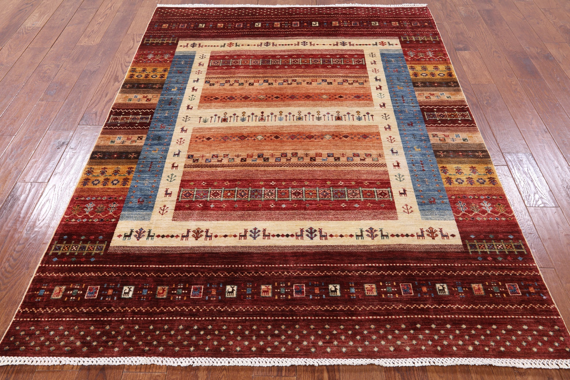 Gabbeh rugs are hand-spun wool in both the pile and the foundation, as well as all natural dyes. Simple, colorful geometric patterns, abstract scenery, child-like representations of people and animals, different colors, reds, blue, greens ,yellow, purple. Modern technology has improved the dye process to allow a wider range of colors as well as more stable and easier to care for colors.