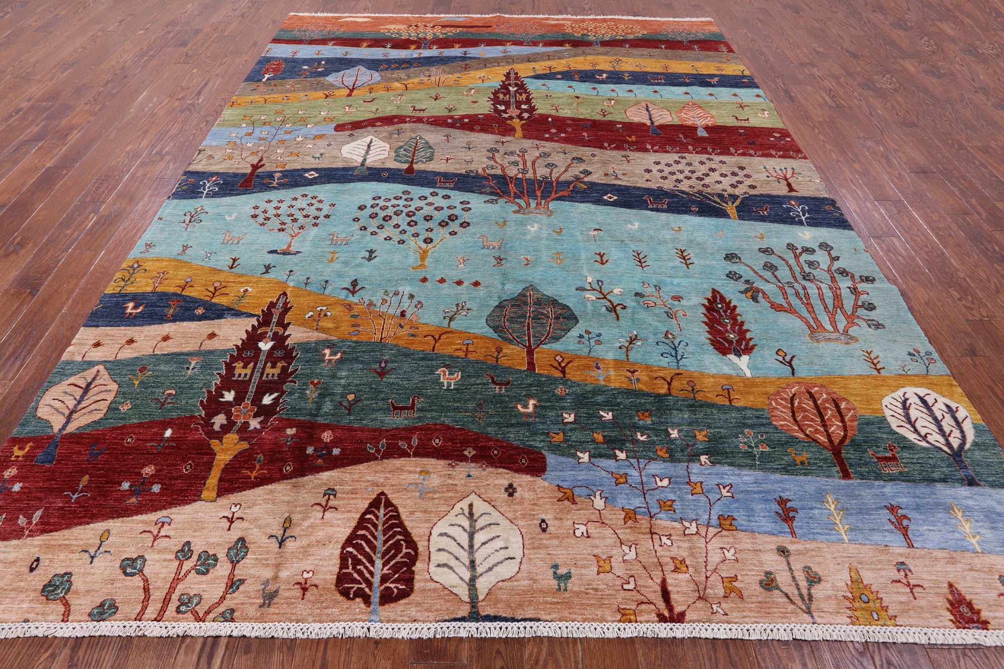 Gabbeh rugs are nothing short of simplistic and tribal, with designs consisting of primarily geometric shapes, animals, and plants. All done in a simplified way and based on the nomadic observation. Commonly brightly colored, these rugs are fun and beautiful and will add a warm touch to any home.