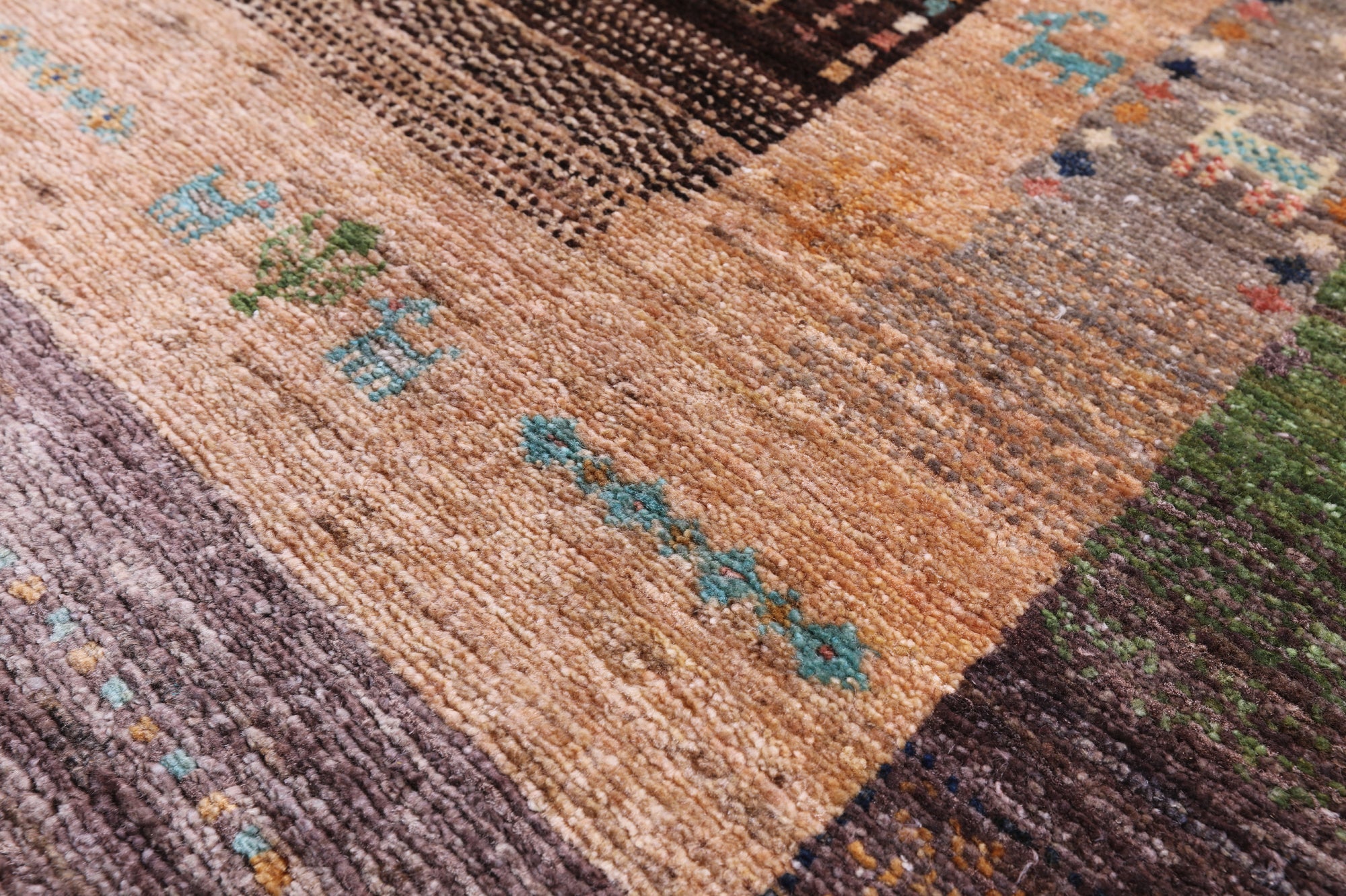 Gabbeh rugs are nothing short of simplistic and tribal, with designs consisting of primarily geometric shapes, animals, and plants. All done in a simplified way and based on the nomadic observation. Commonly brightly colored, these rugs are fun and beautiful and will add a warm touch to any home.