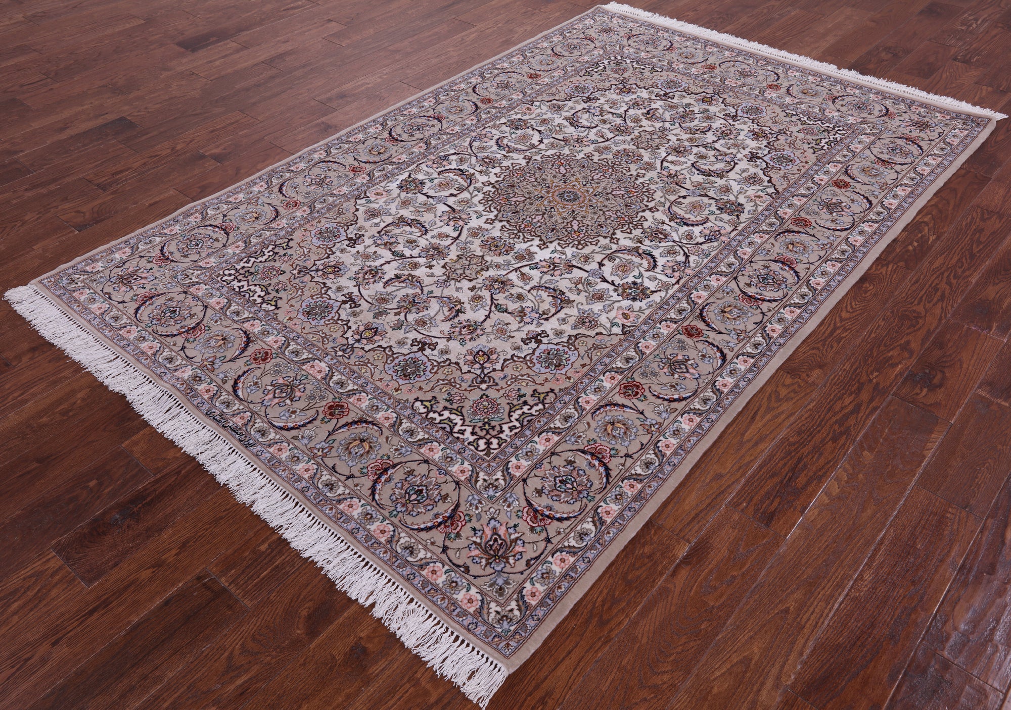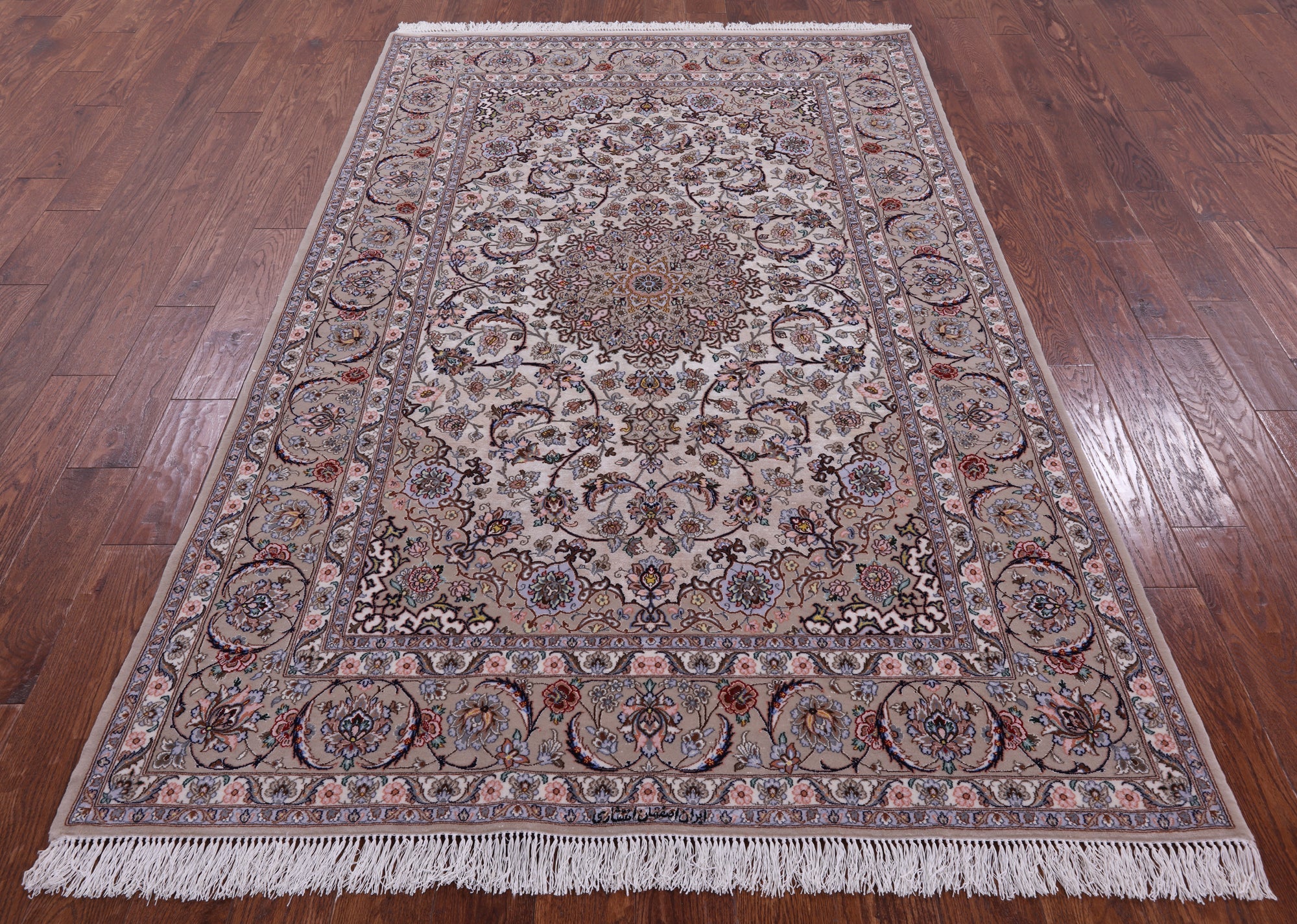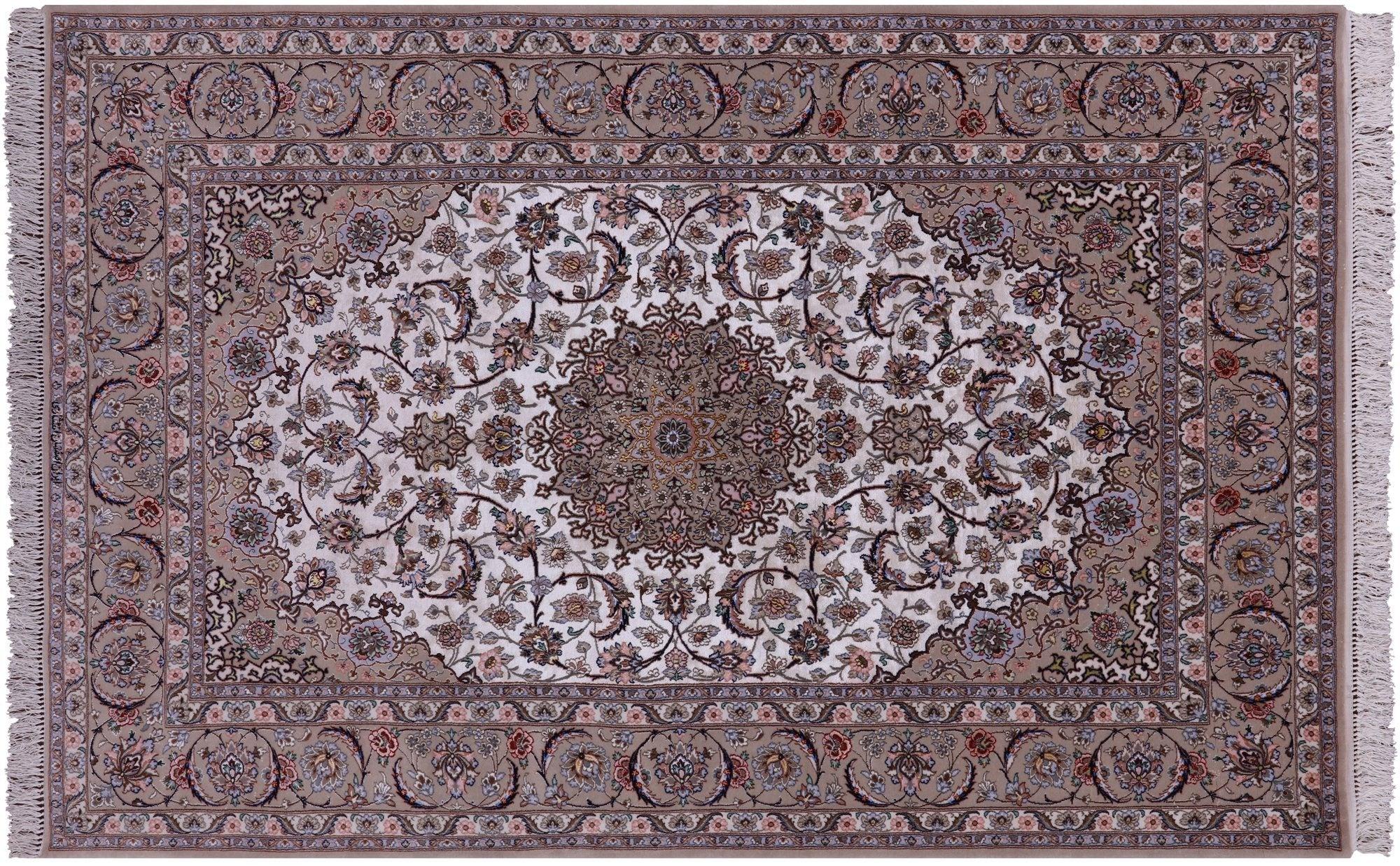 Ivory 5' 3" X 7' 10" Hand Knotted Signed Isfahan Persian Wool & Silk Rug - SA2610