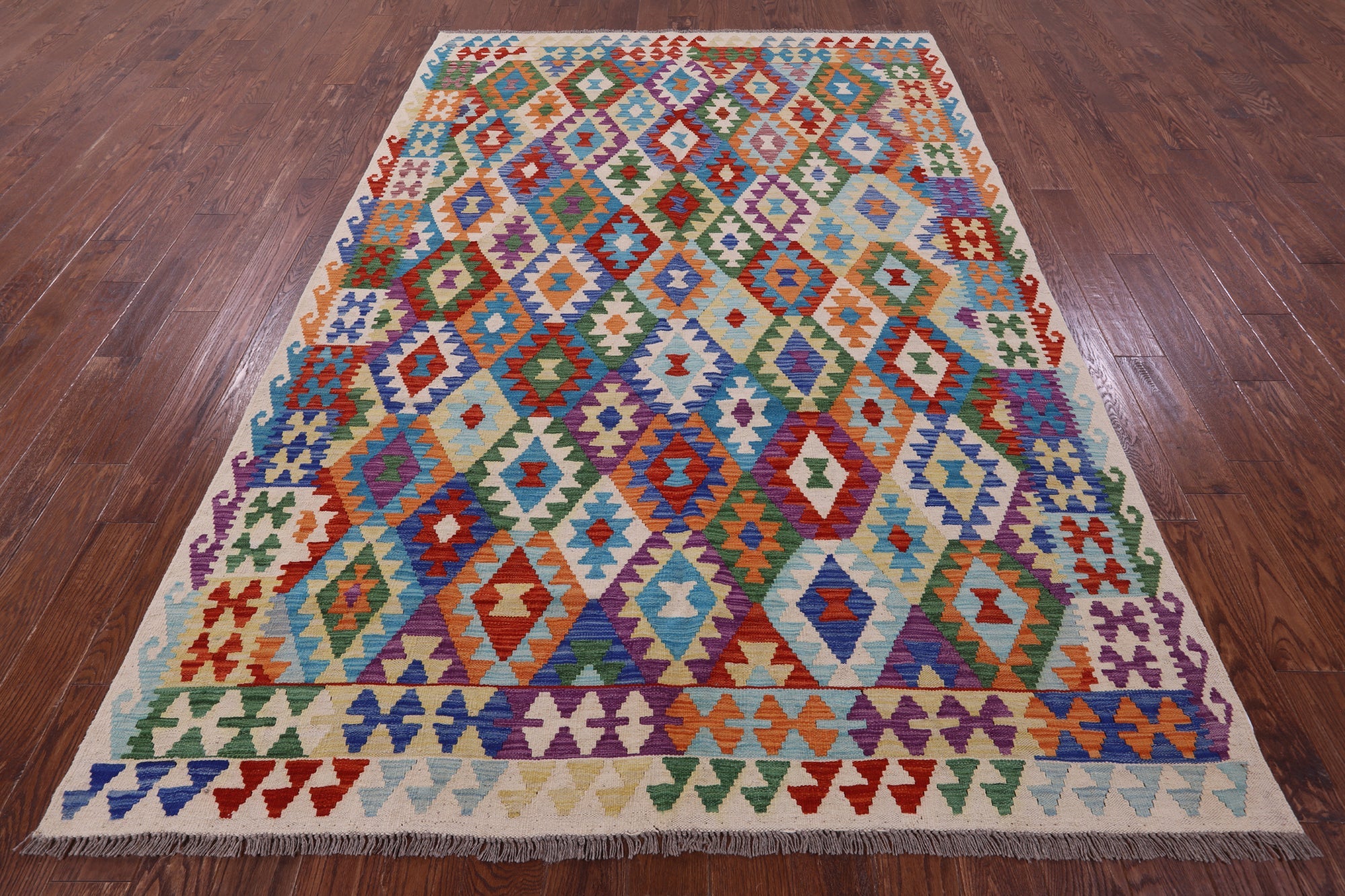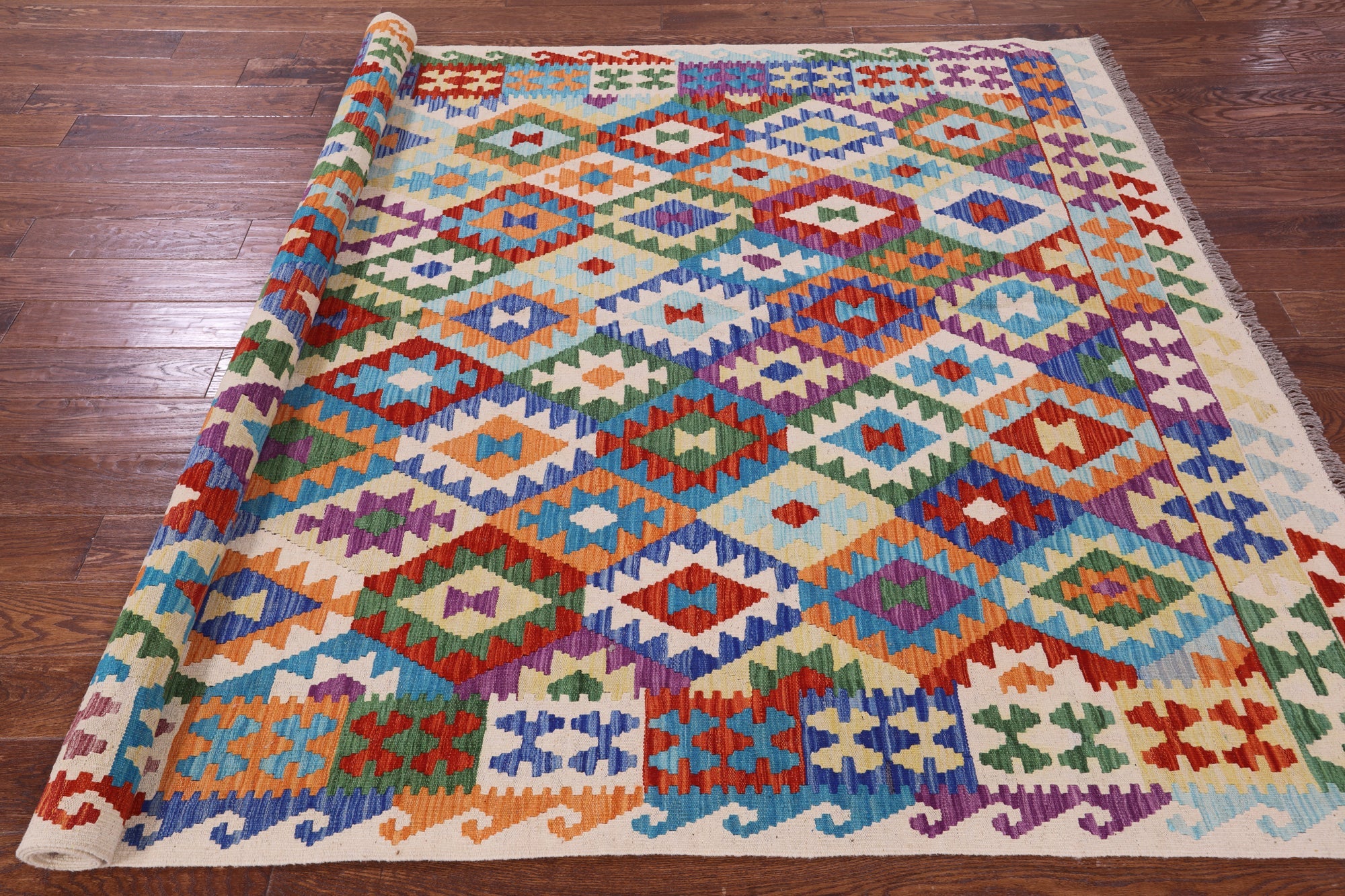 A kilim rug is a flat-woven rug. Kilim rugs are known for their intricate geometric patterns, vibrant colors, and durable construction. Unlike traditional pile rugs, kilims have a smooth surface with no pile, making them lightweight and versatile. They are often used as decorative pieces, floor coverings, or wall hangings, reflecting the cultural heritage and artistic expression of the regions they originate from.