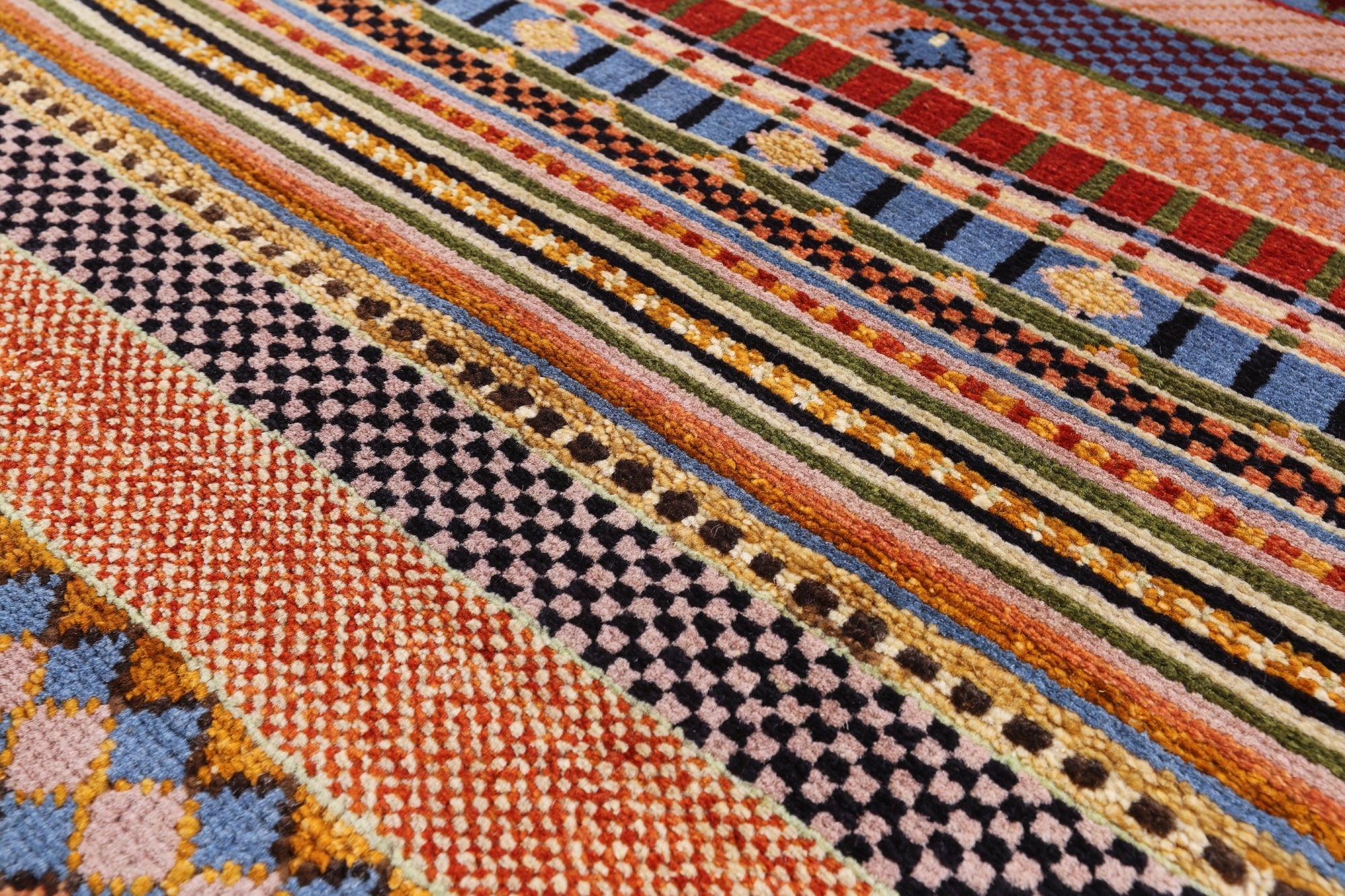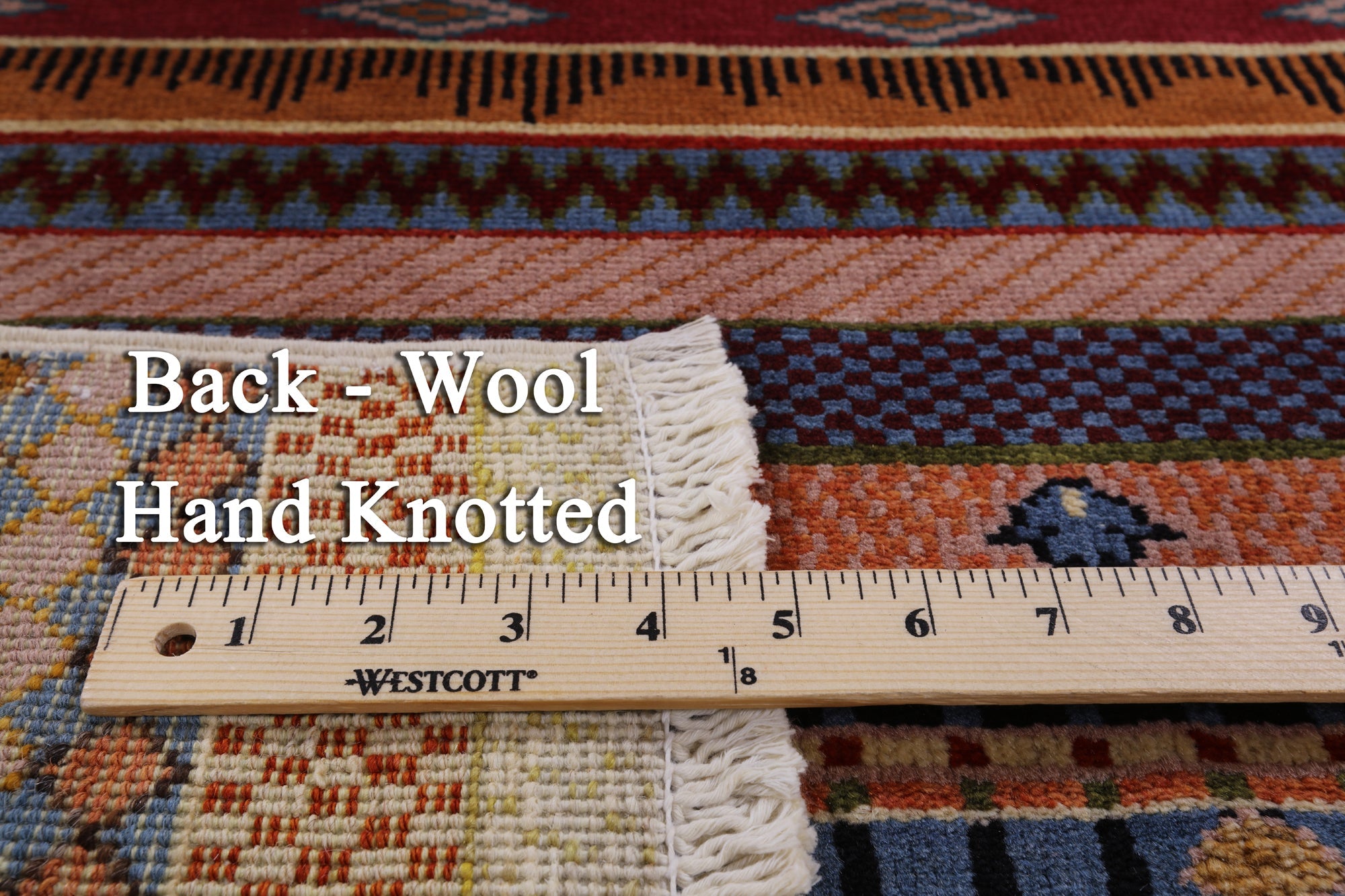 Gabbeh rugs are hand knotted to reflect tribal and other patterns such as solids, and nomadic designs. The simplistic "child-like" bold designs of Gabbeh rugs is what makes them perfectly suitable for any decor. Gabbeh rugs are made from high-quality wool and have a high density of knots. Gabbeh rugs are hand-knotted and eco-friendly, because only natural dyes are used in their production.